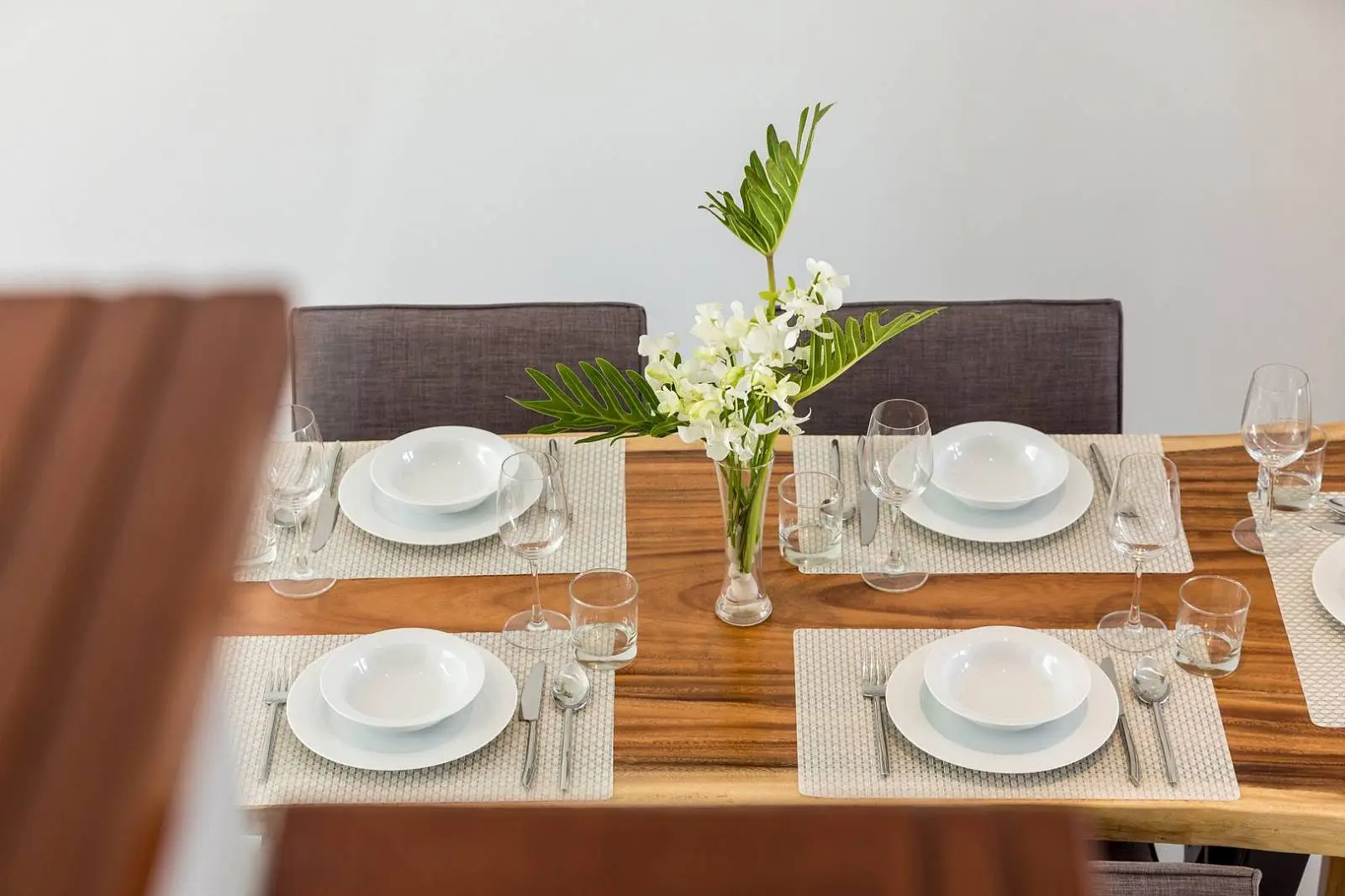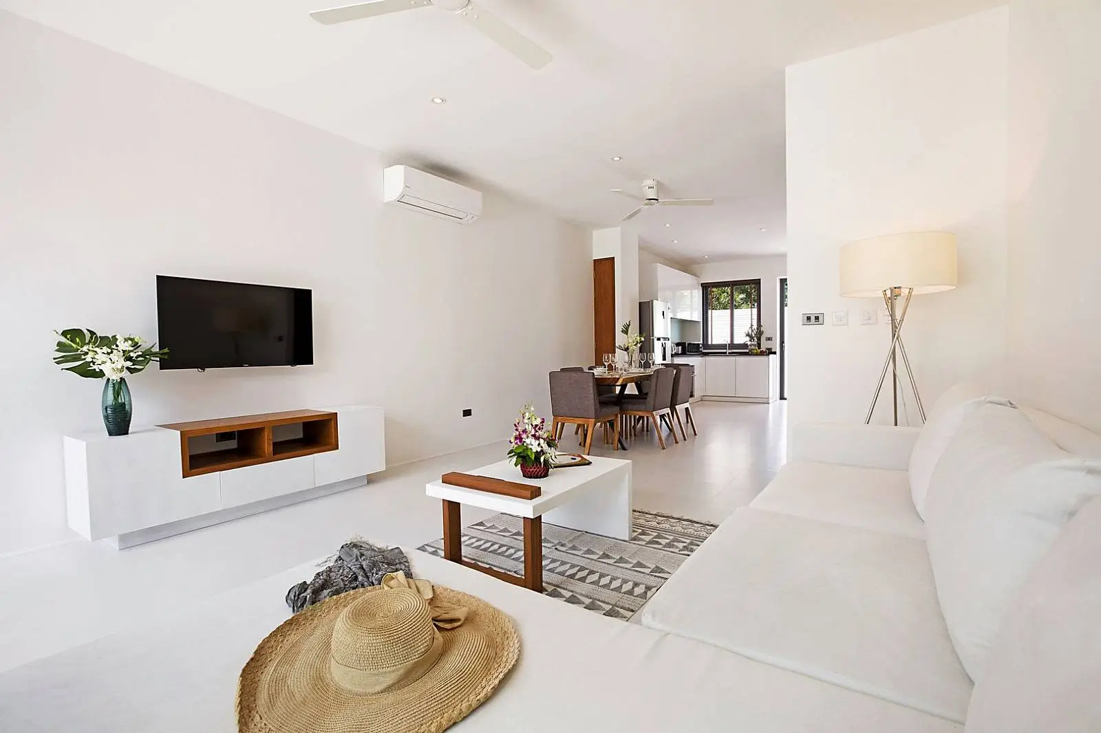 The first floor of each townhouse is a spacious and air-conditioned open plan living area. It is tastefully furnished with a comfortable sofa, a coffee table, a TV, a dining table with chairs, and a fully equipped kitchen. The kitchen boasts modern appliances, including a fridge, a kettle, a stove-top, an oven, a microwave oven, and a washing machine (available in most units). Whether you're preparing a quick snack or a culinary masterpiece, you'll find everything you need in this well-equipped kitchen. Moreover, the floor-to-ceiling sliding doors in the living room open onto a generous private deck area, seamlessly extending the living space. The design of the townhouses promotes excellent air circulation, allowing for natural ventilation and minimizing the need for air-conditioning.