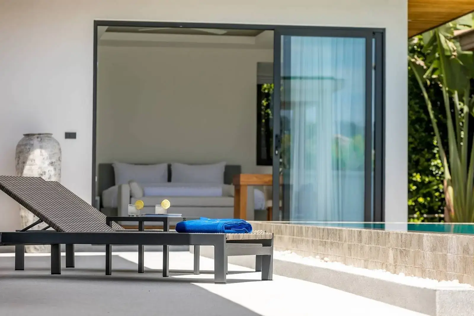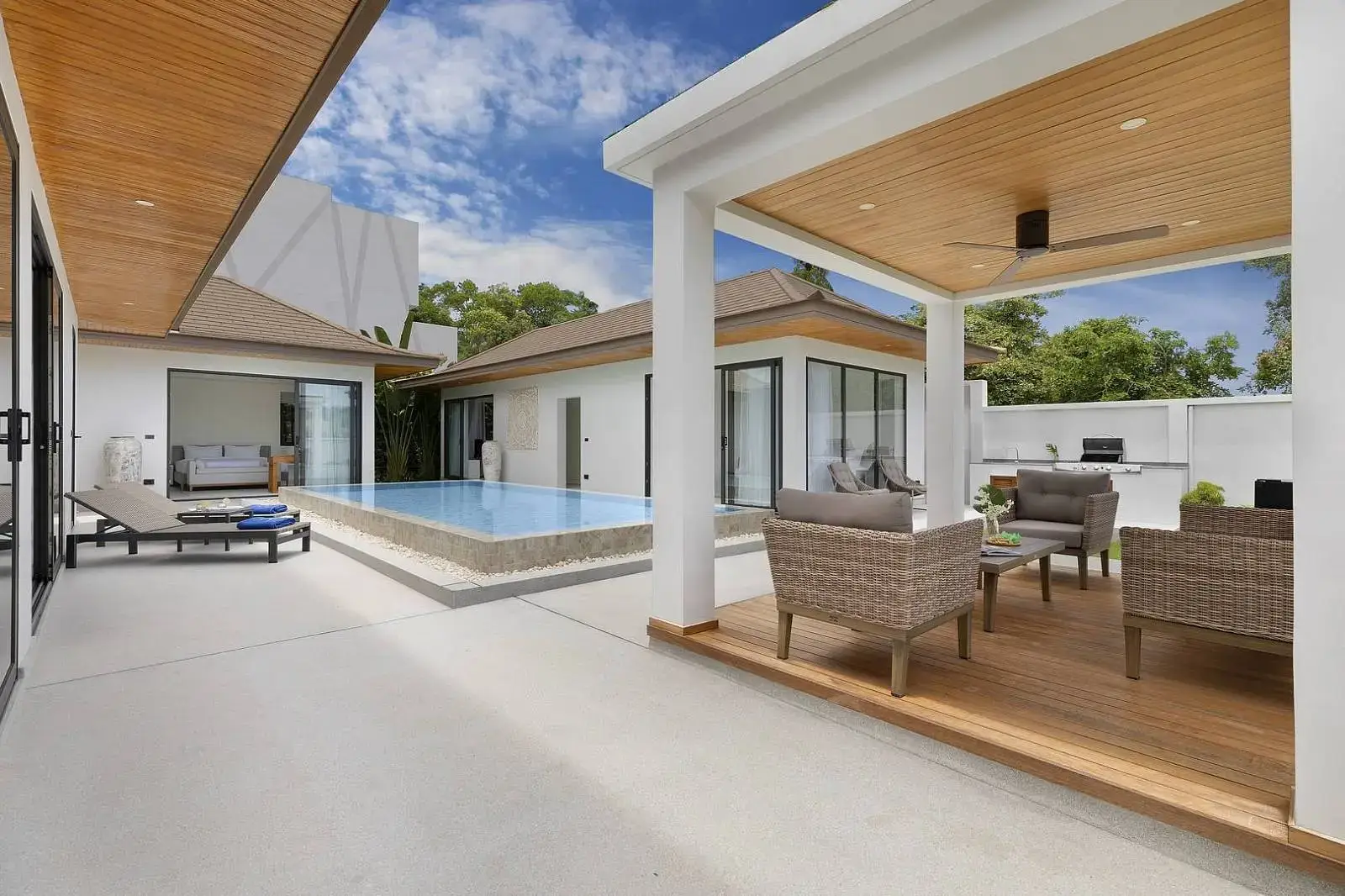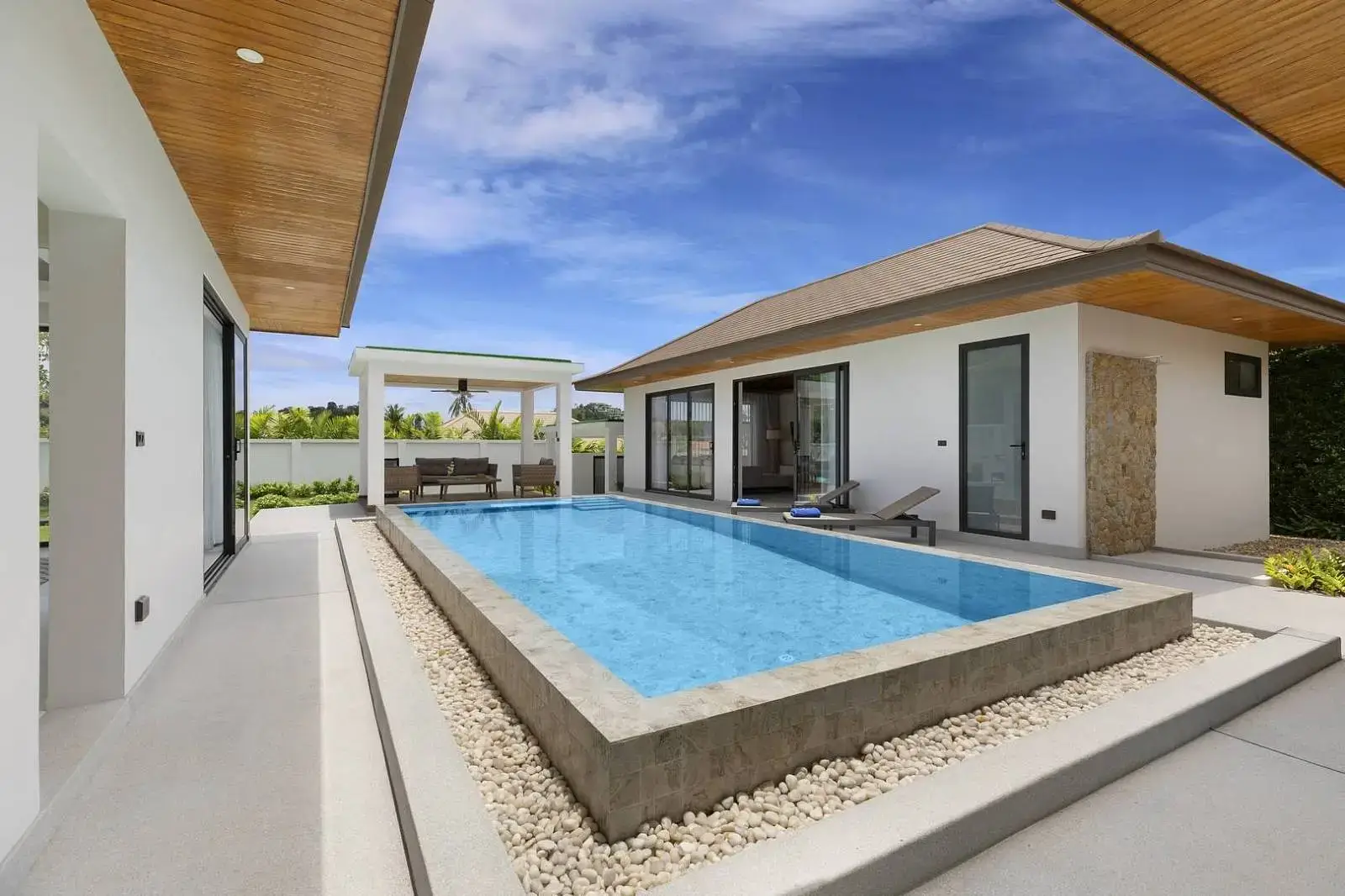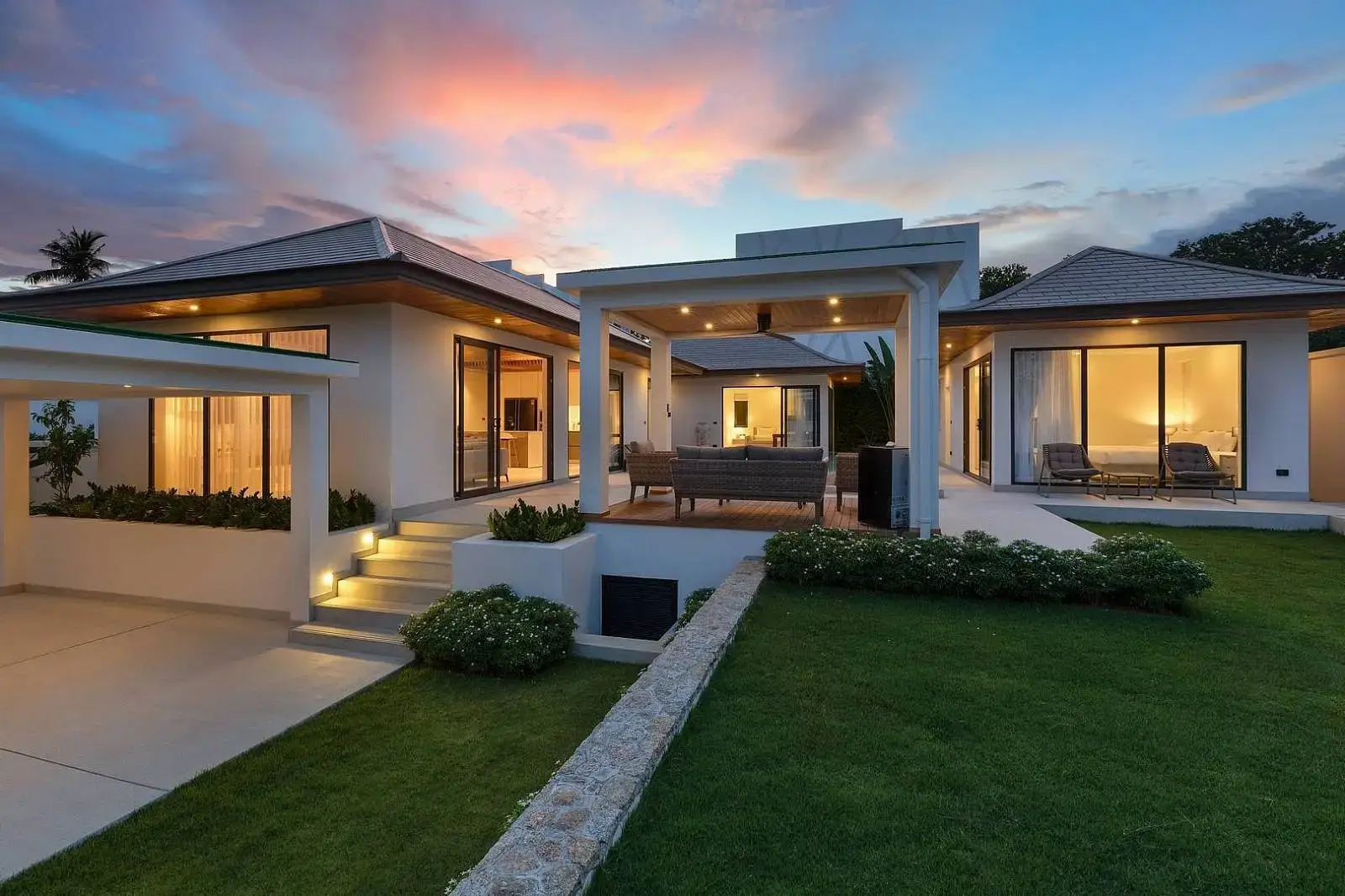 The brand new three bedroom 'Villa Paradise' is well located within the Sunway Villas project just a short walk of 400m to the stunning Choengmon Beach. Along the way you will find an excellent selection of restaurants, bars, convenience stores, thai massage shops and everything else you may need for an amazing and easy vacation on Koh Samui. The villa consists of 3 separate pavilions which are arranged in a Balinese style around an 8m swimming pool.