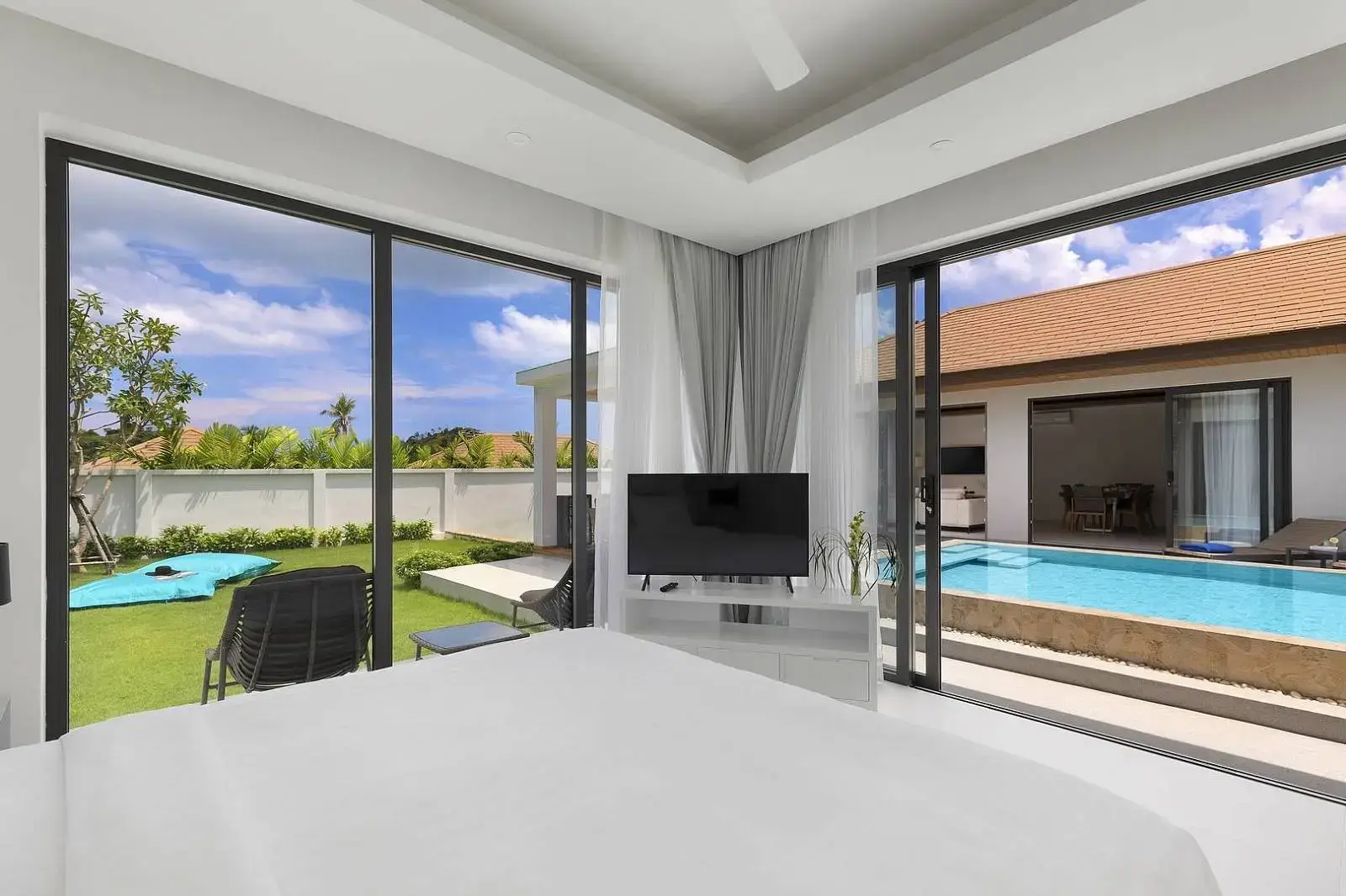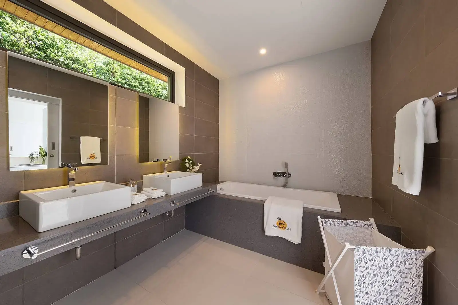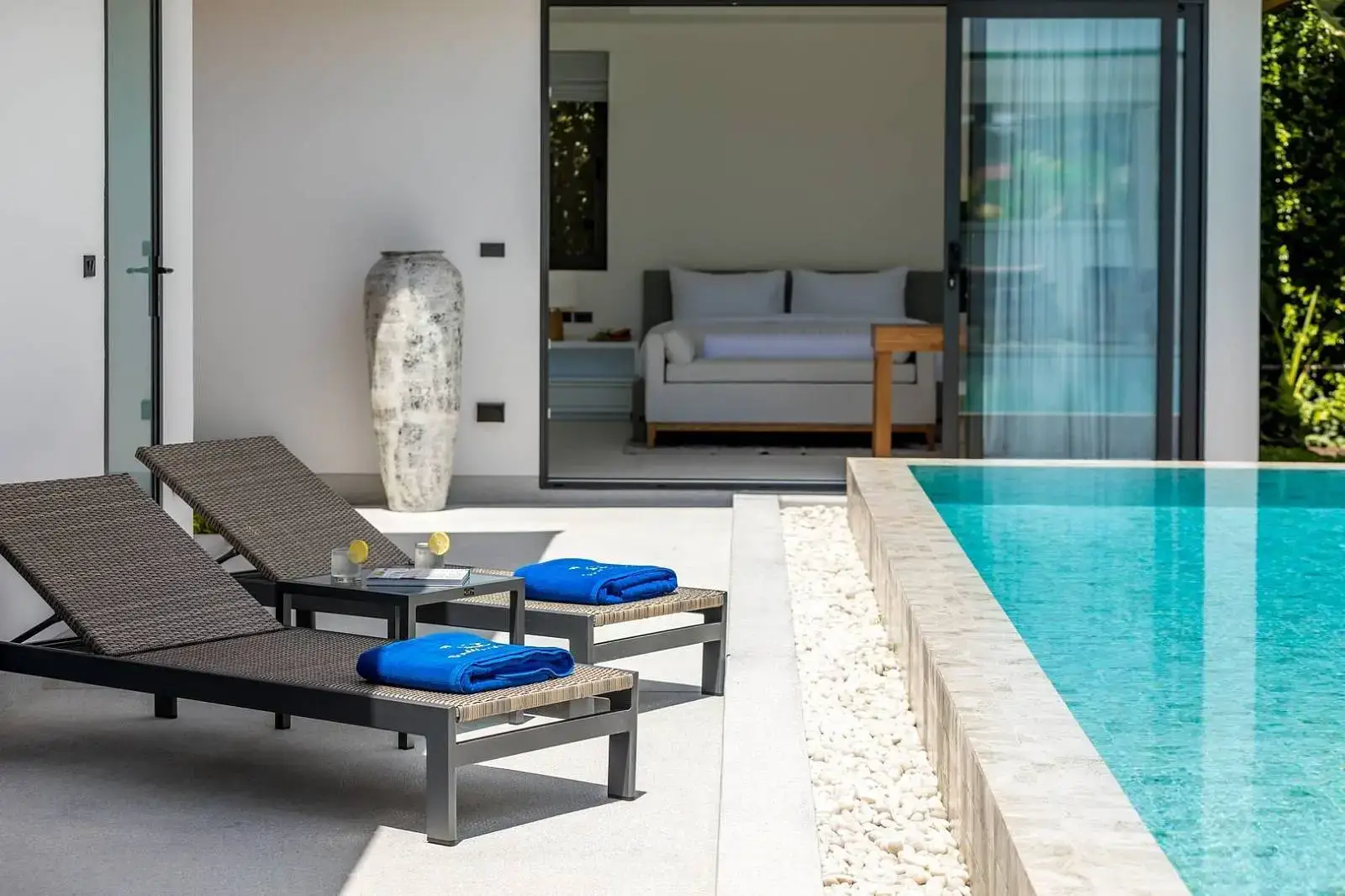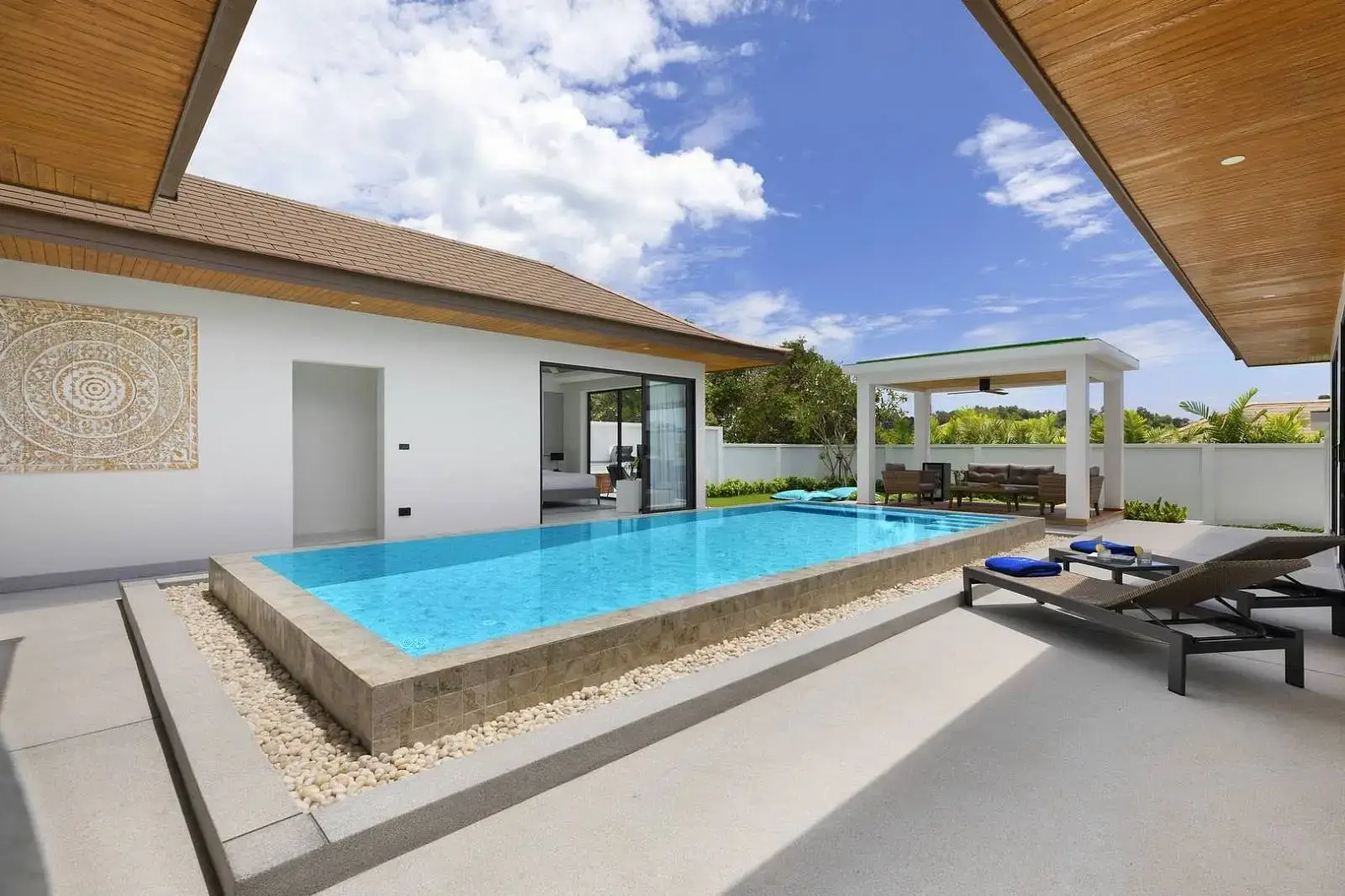 The brand new three bedroom 'Villa Paradise' is well located within the Sunway Villas project just a short walk of 400m to the stunning Choengmon Beach. Along the way you will find an excellent selection of restaurants, bars, convenience stores, thai massage shops and everything else you may need for an amazing and easy vacation on Koh Samui. The villa consists of 3 separate pavilions which are arranged in a Balinese style around an 8m swimming pool.