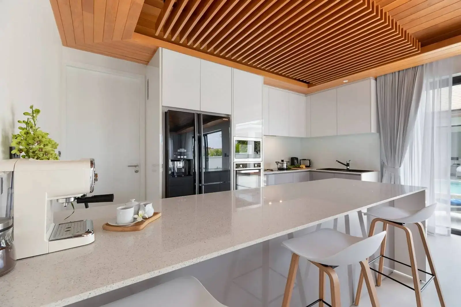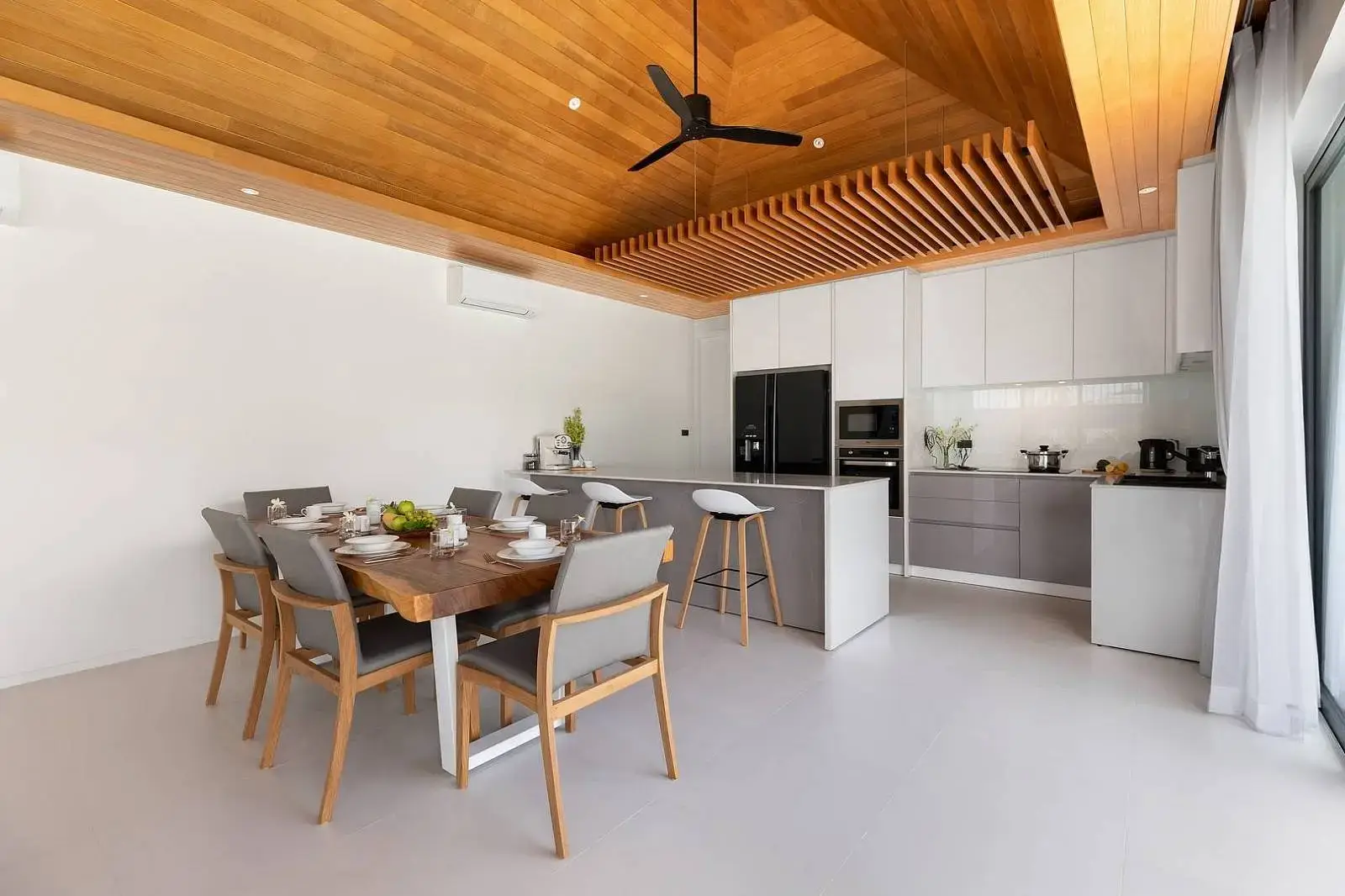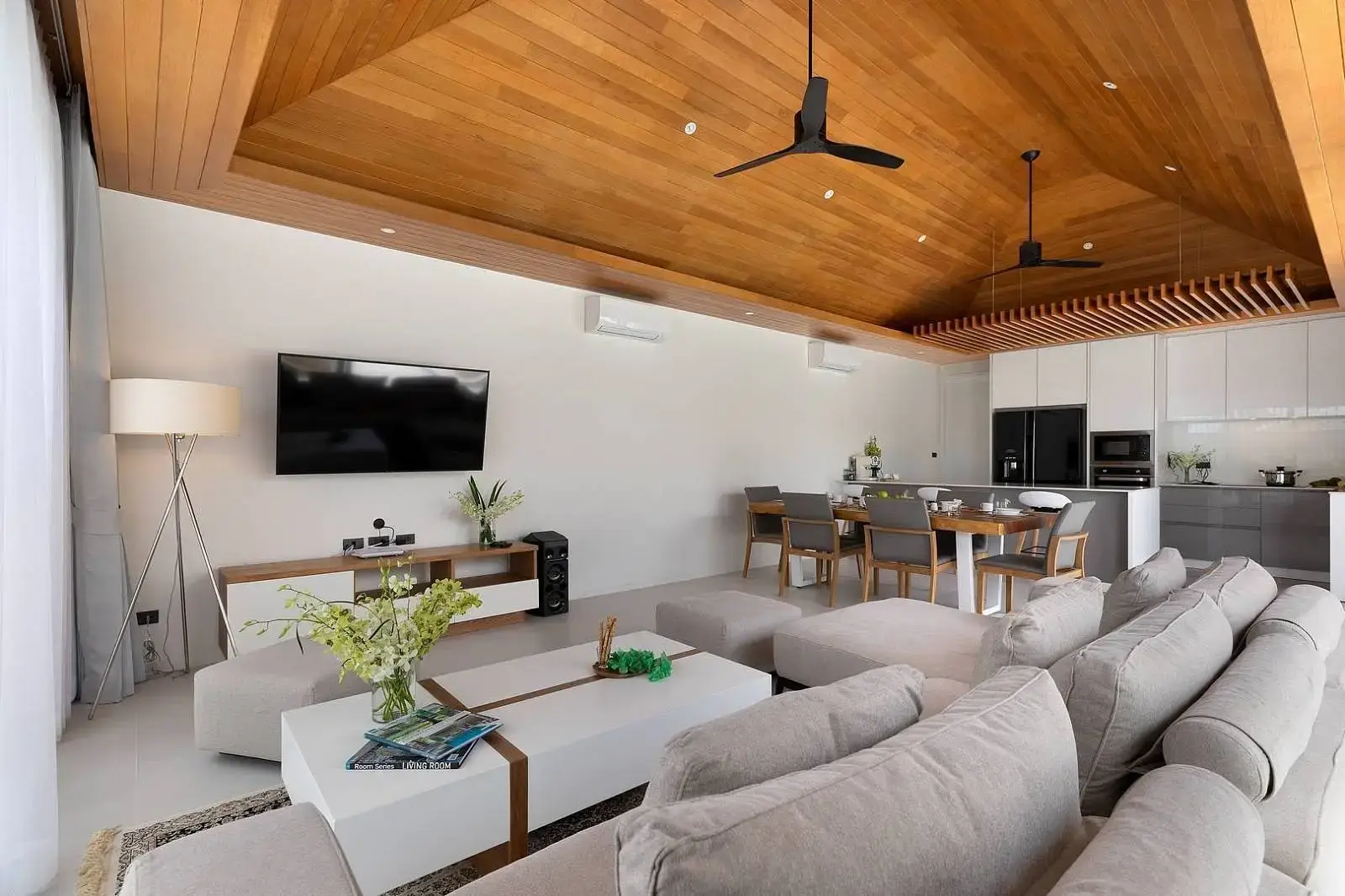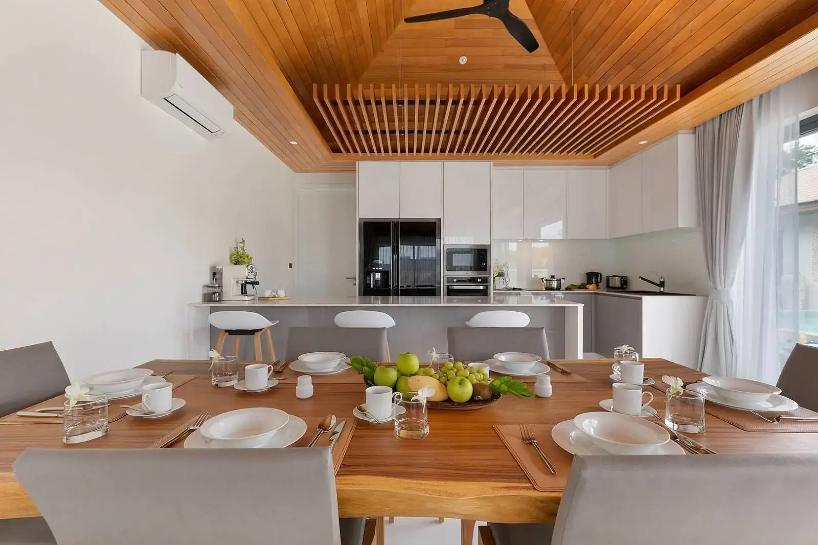 One pavilion contains a large open plan living area, featuring an elegant timber ceiling, and includes a European style kitchen with a pantry room and washing machine. The kitchen is fully equipped with a dishwasher, oven, and a 4 ring electric stove. There is a 55 inch Smart TV in the lounge area.