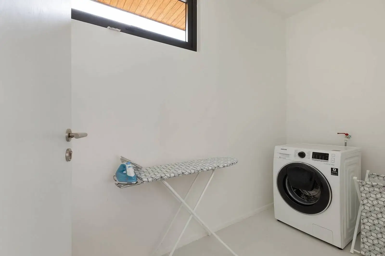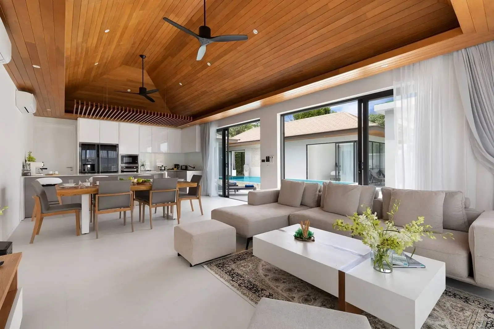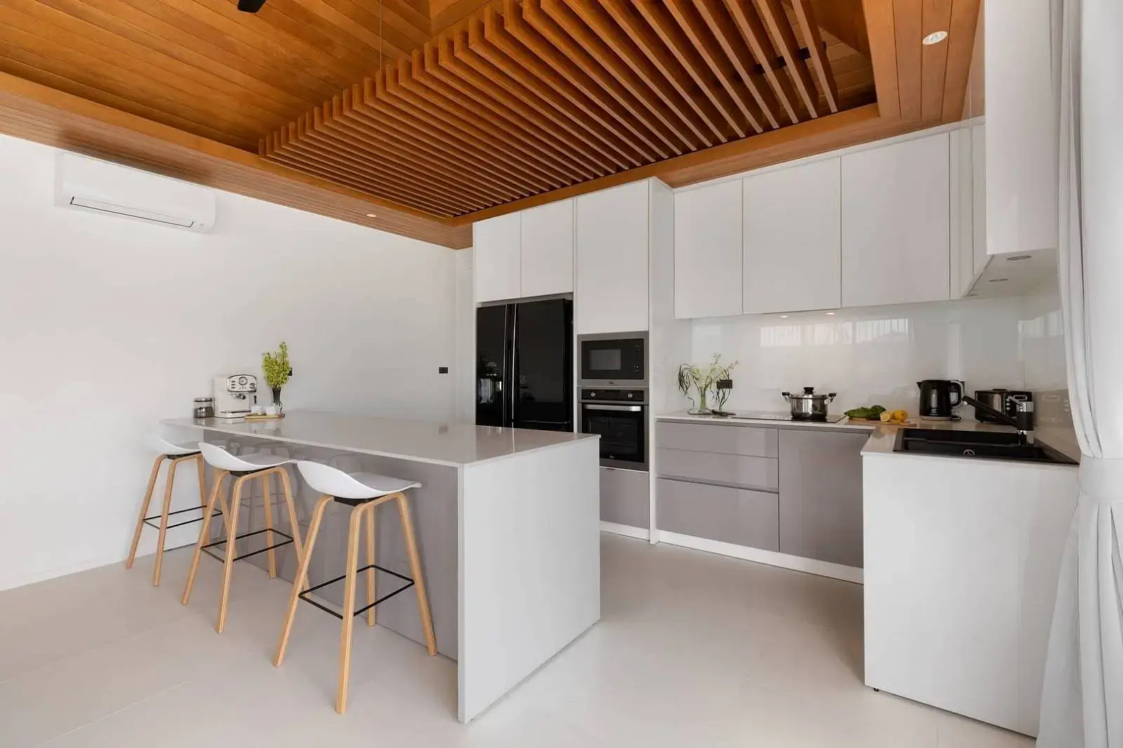 One pavilion contains a large open plan living area, featuring an elegant timber ceiling, and includes a European style kitchen with a pantry room and washing machine. The kitchen is fully equipped with a dishwasher, oven, and a 4 ring electric stove. There is a 55 inch Smart TV in the lounge area.