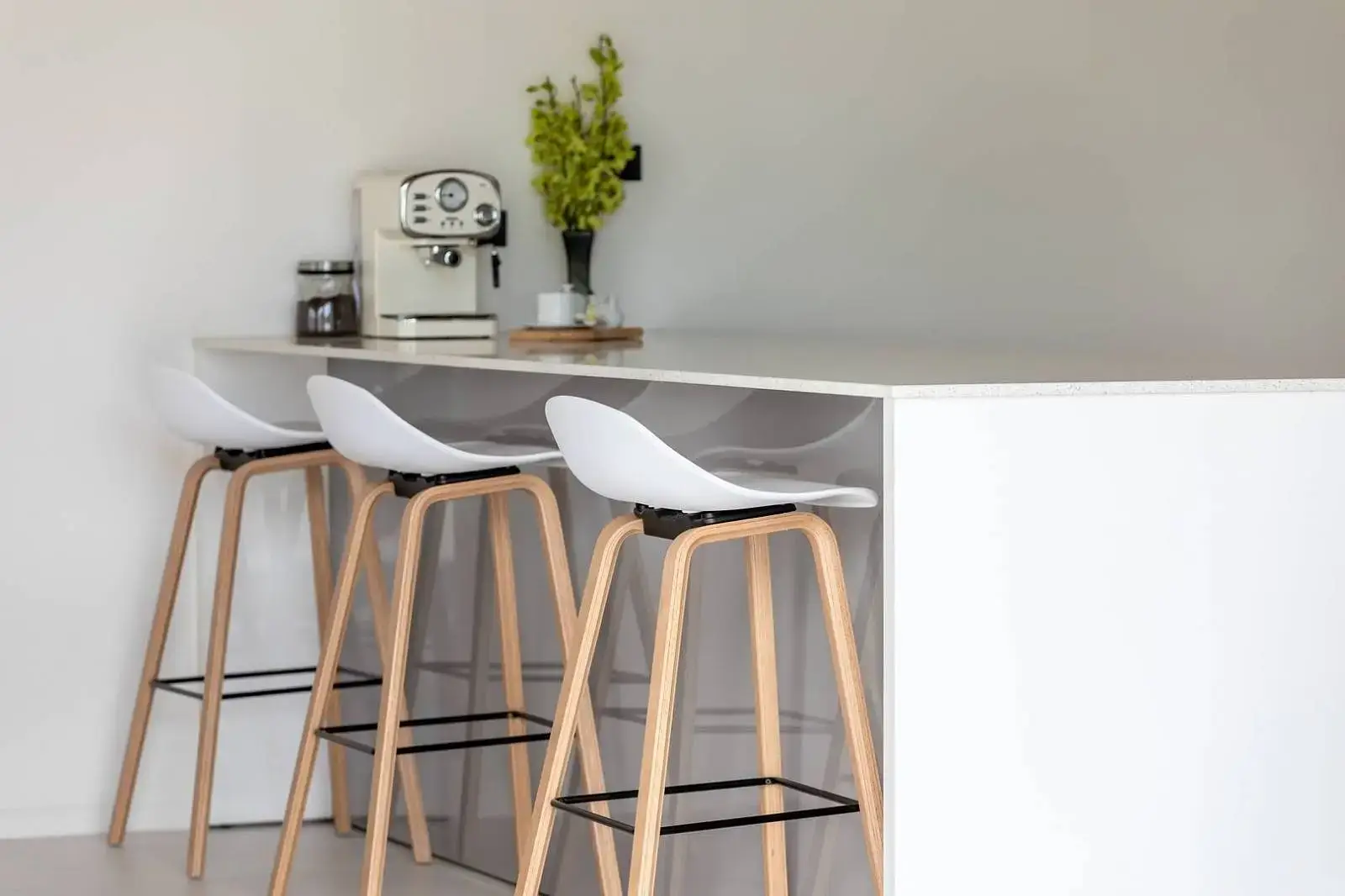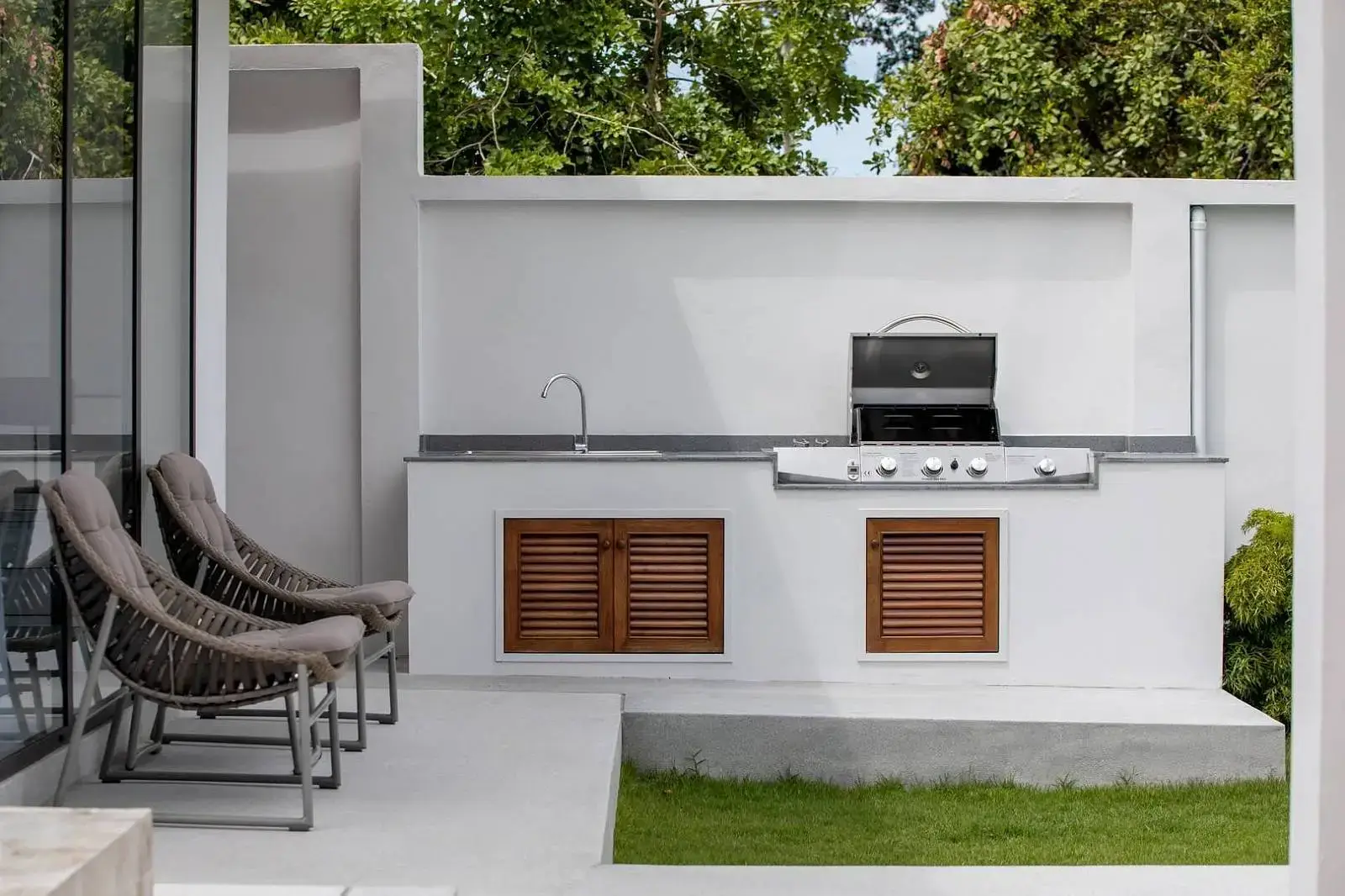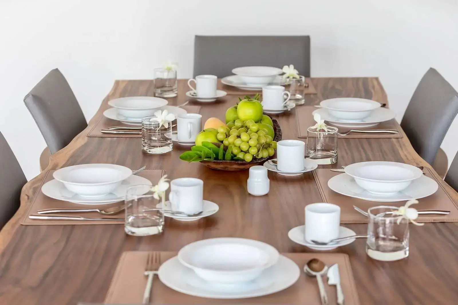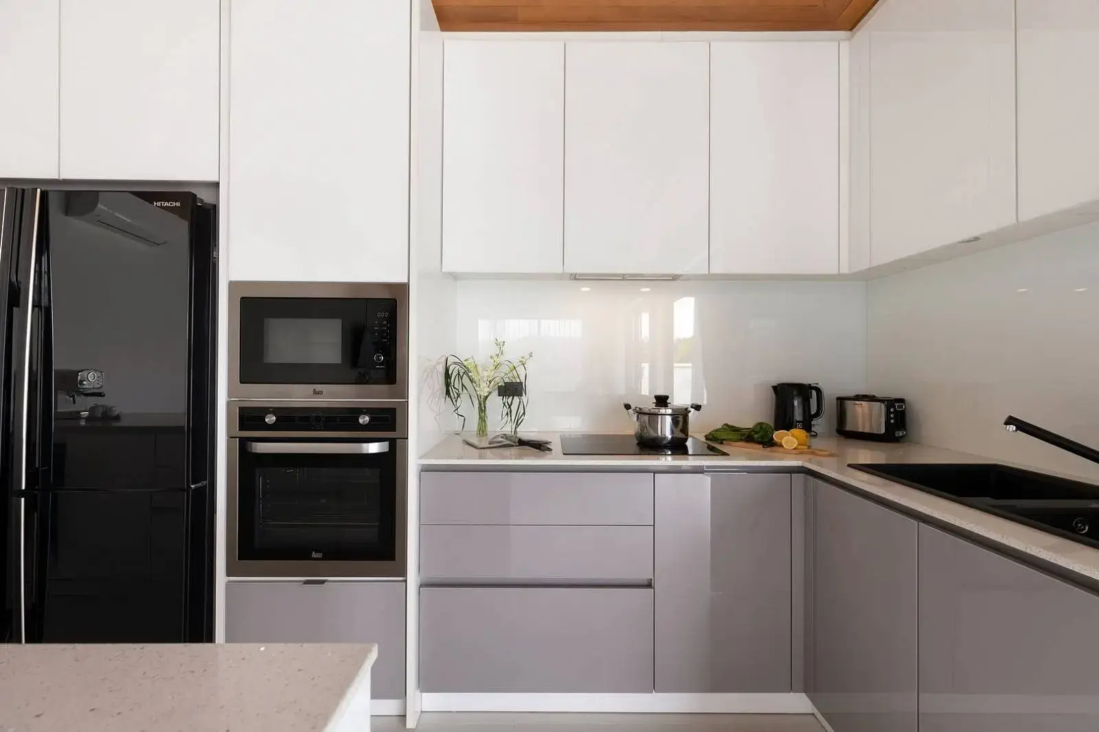 One pavilion contains a large open plan living area, featuring an elegant timber ceiling, and includes a European style kitchen with a pantry room and washing machine. The kitchen is fully equipped with a dishwasher, oven, and a 4 ring electric stove. There is a 55 inch Smart TV in the lounge area.