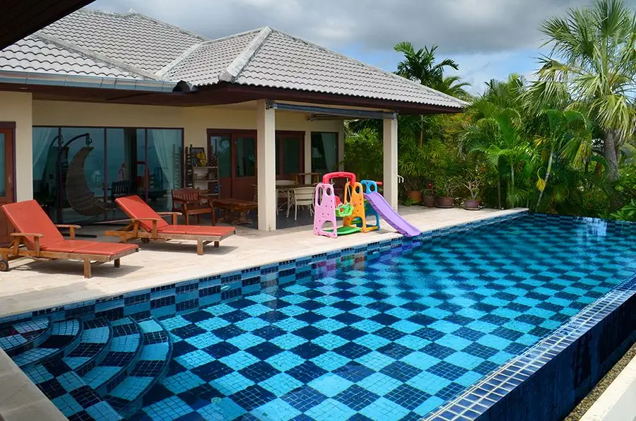 The house is situated within 5 minute drive to the beach on a mountain with spectacular sea view to Koh Pangan. The house consists of 3 bedrooms, 3 toilets, spacious living room and a kitchen with all needed appliances including oven and a dishwashing machine. All rooms are fully furnished.