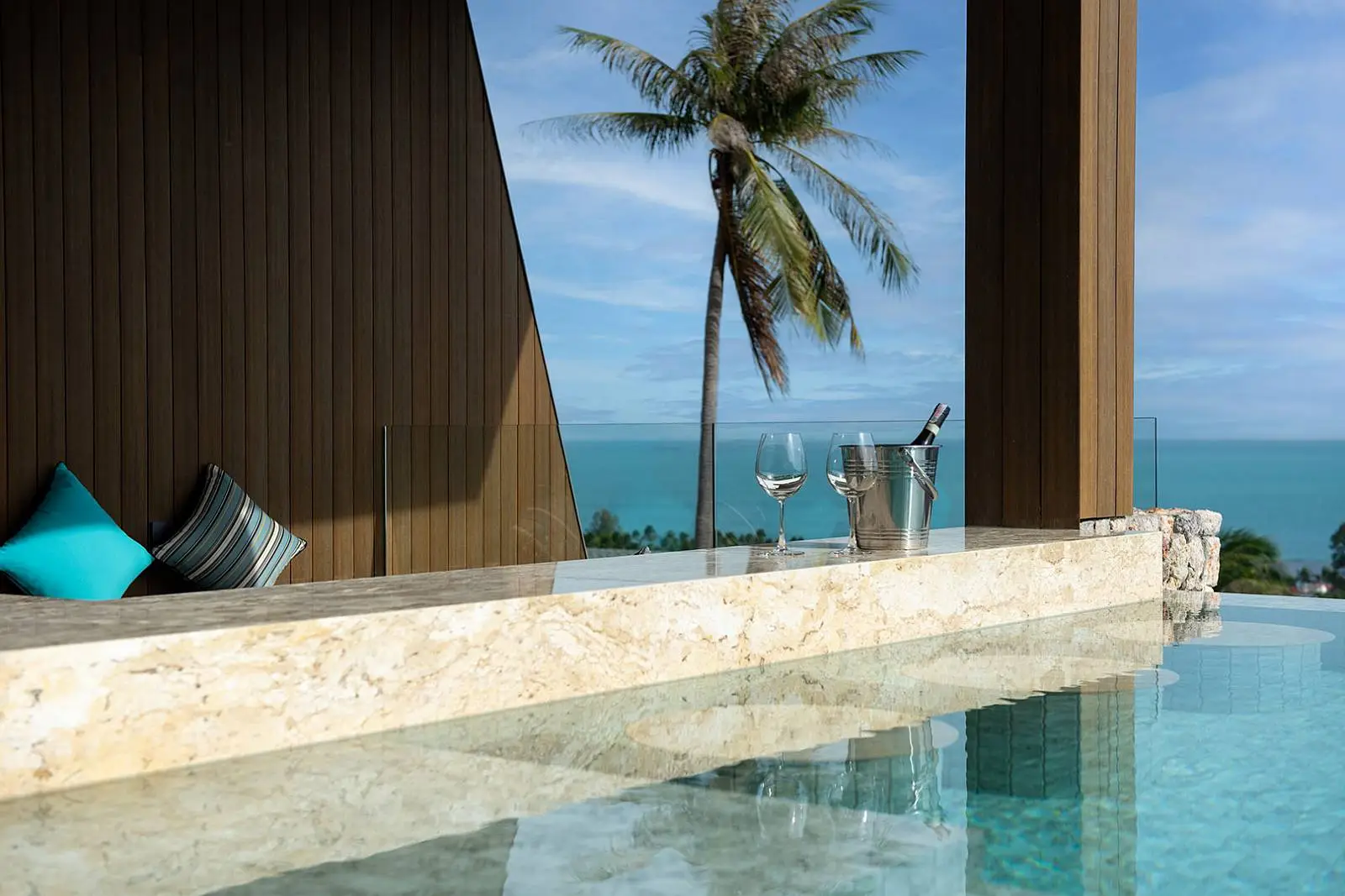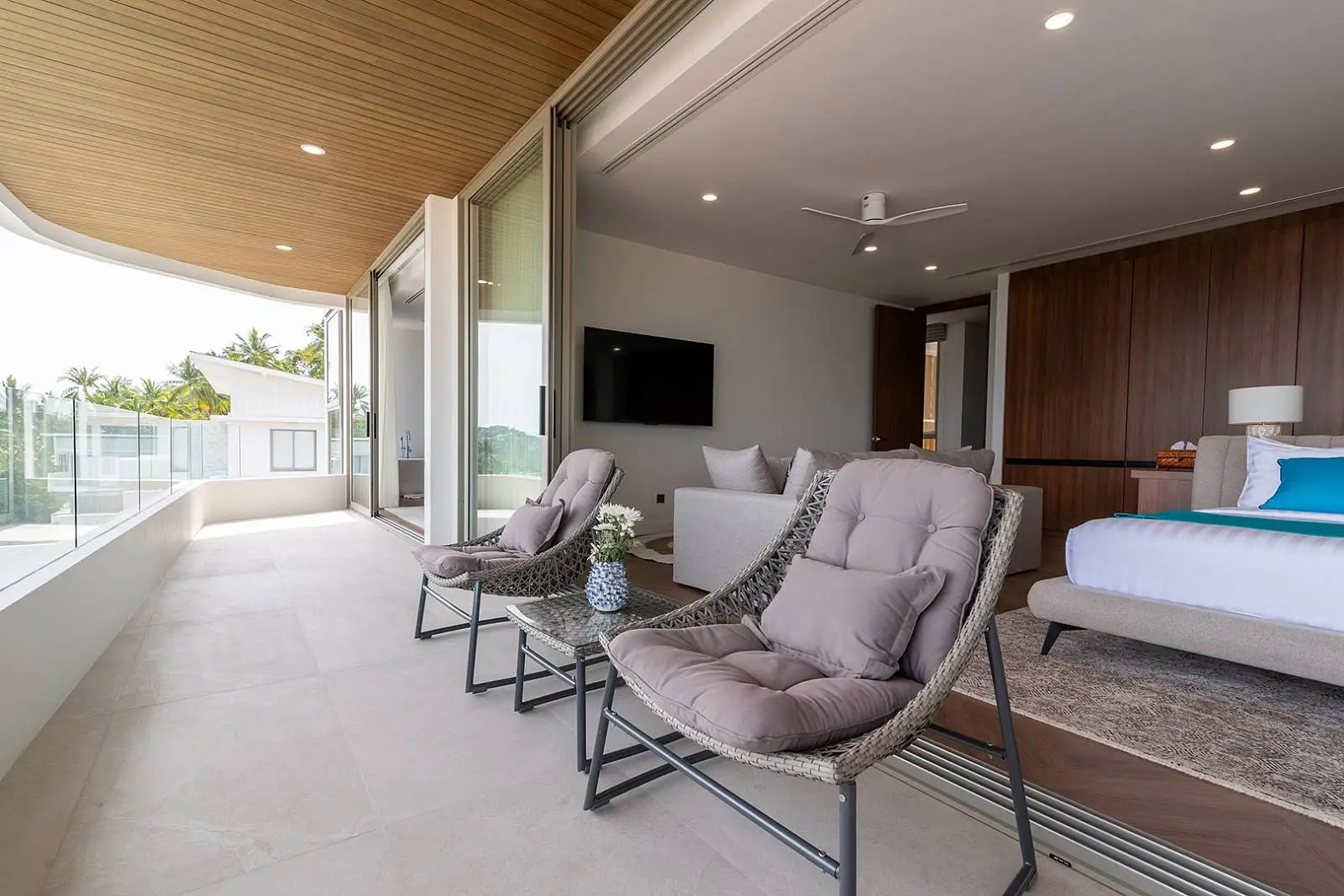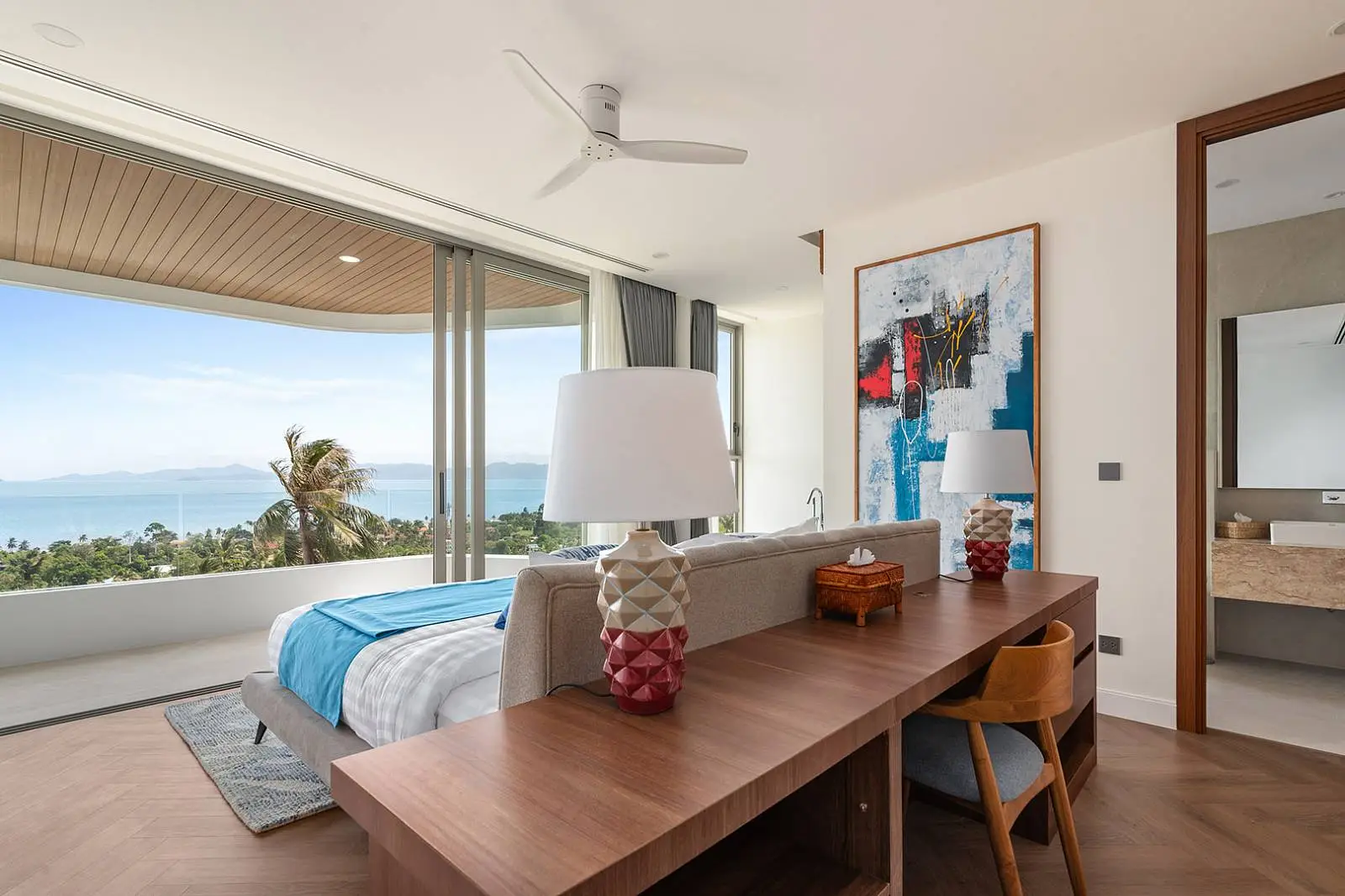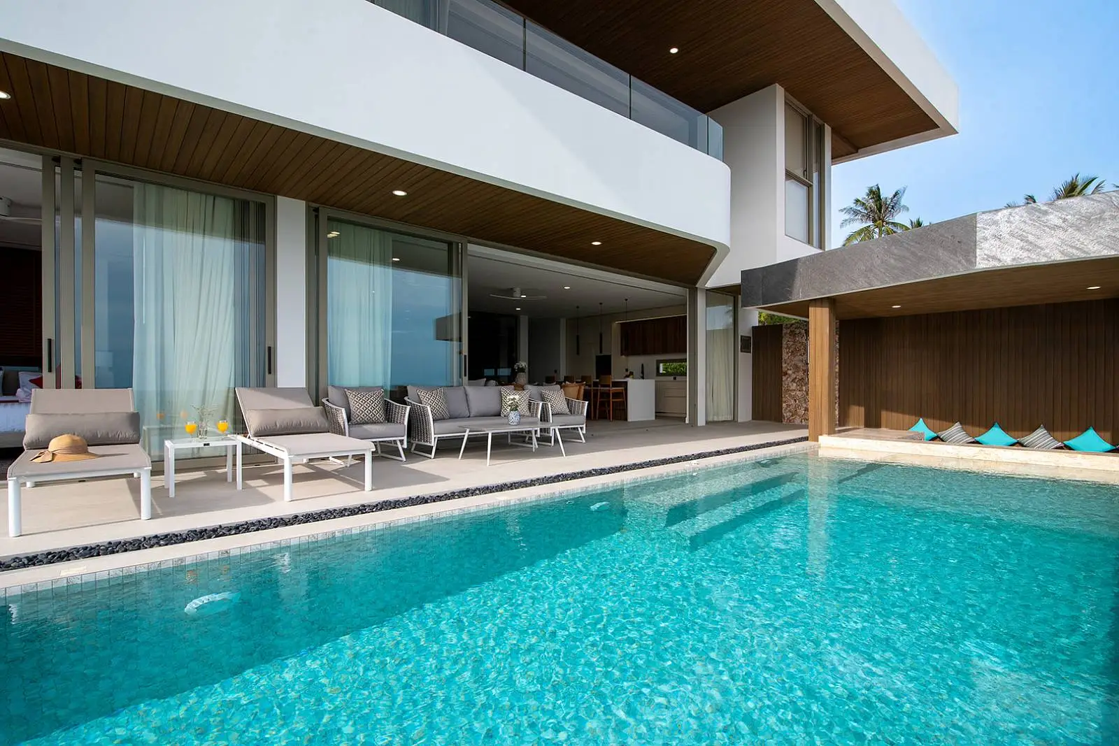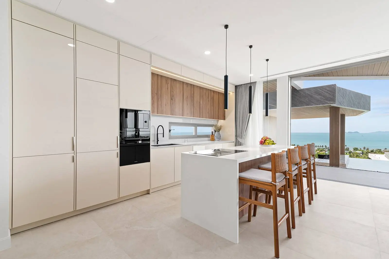 Just steps from Bangpor Beach and set on a gentle low hill, Beso Grande is the project’s premium seaview villa type—a three-storey residence featuring generous interiors, an in-villa elevator, and expansive ocean views towards Koh Phangan. The entry opens to the middle level, where an open-plan living, dining, and kitchen area flows seamlessly onto the pool terrace with an infinity pool and sunken sala. A fully equipped commercial kitchen sits discreetly at the back for professional catering or private dining.