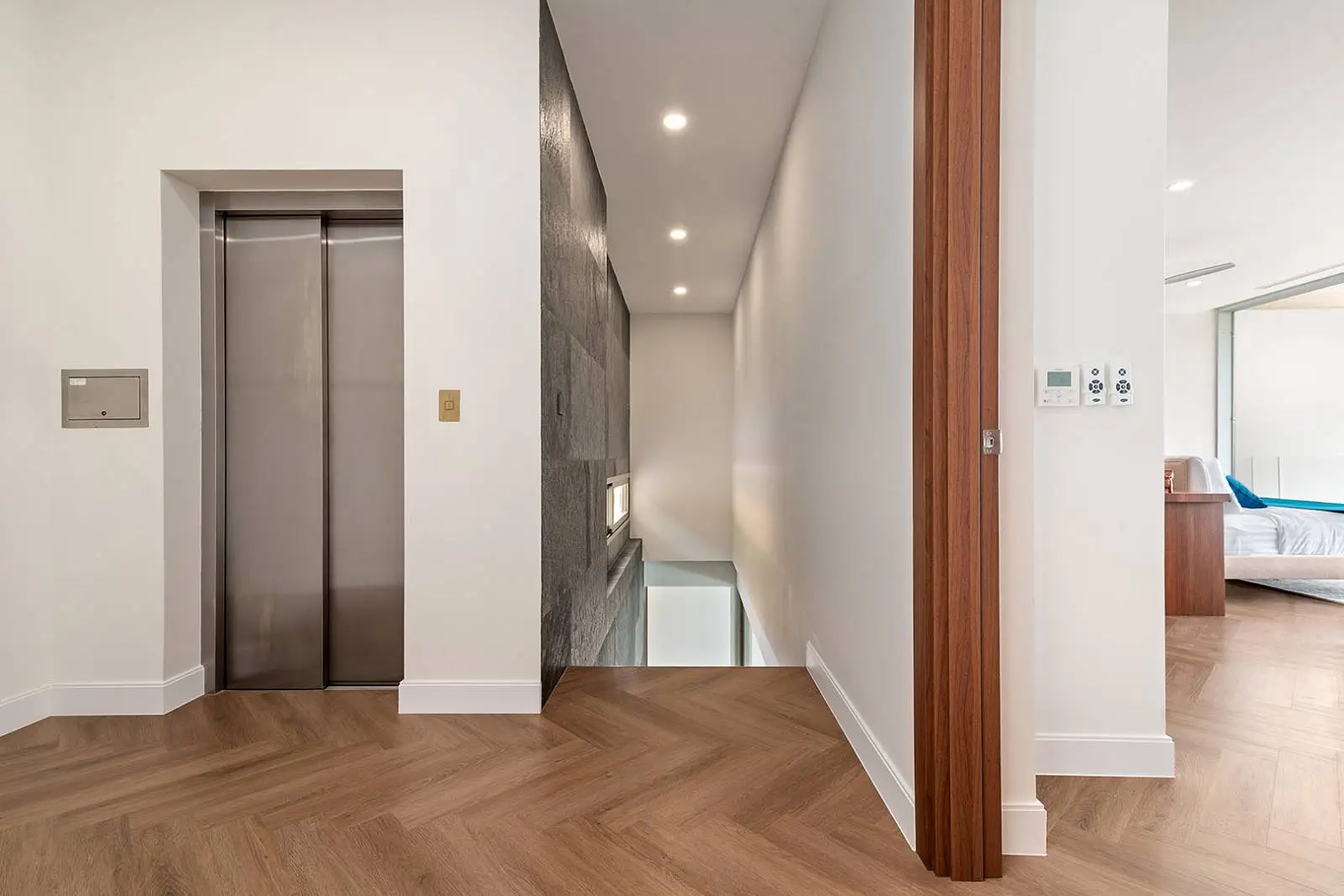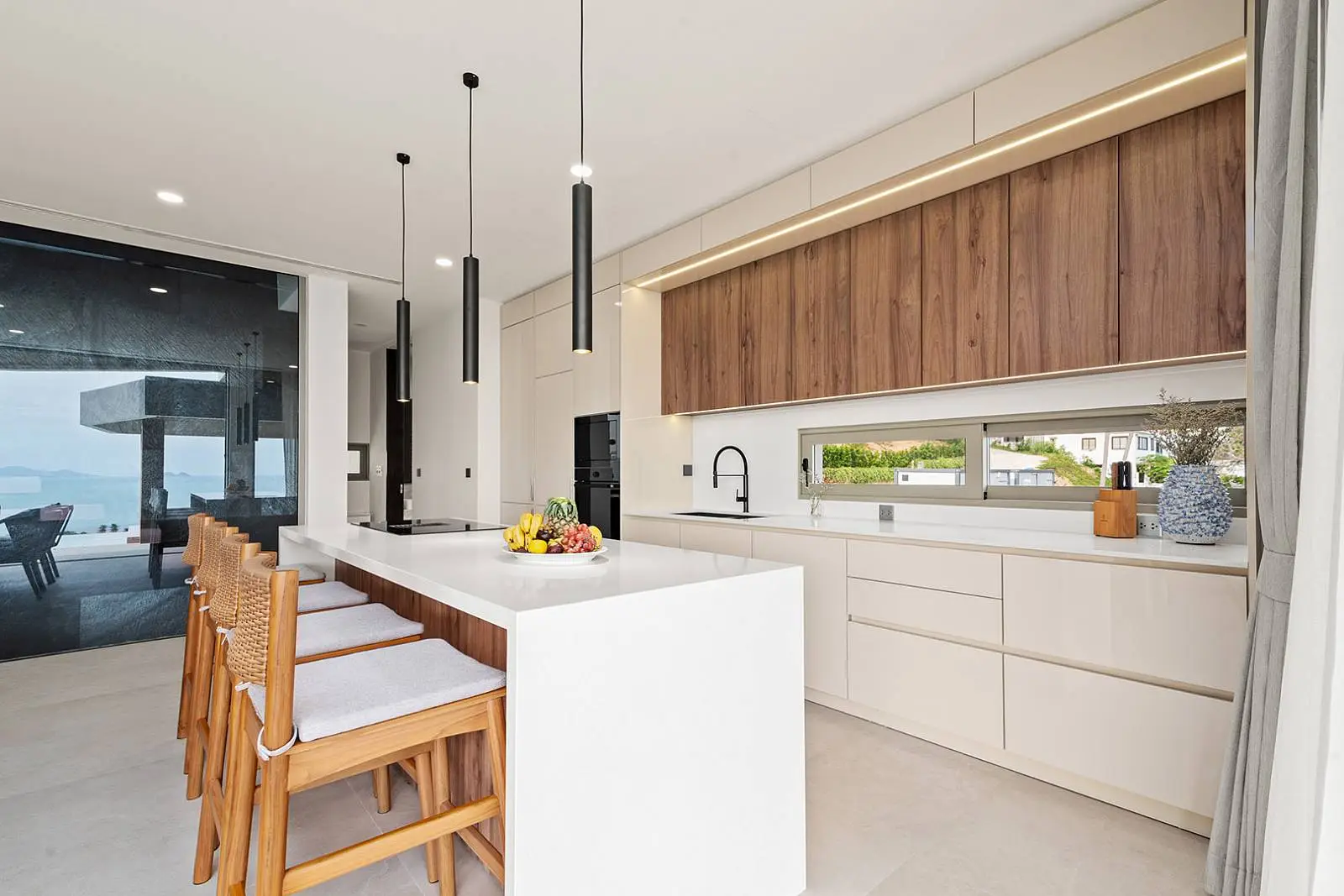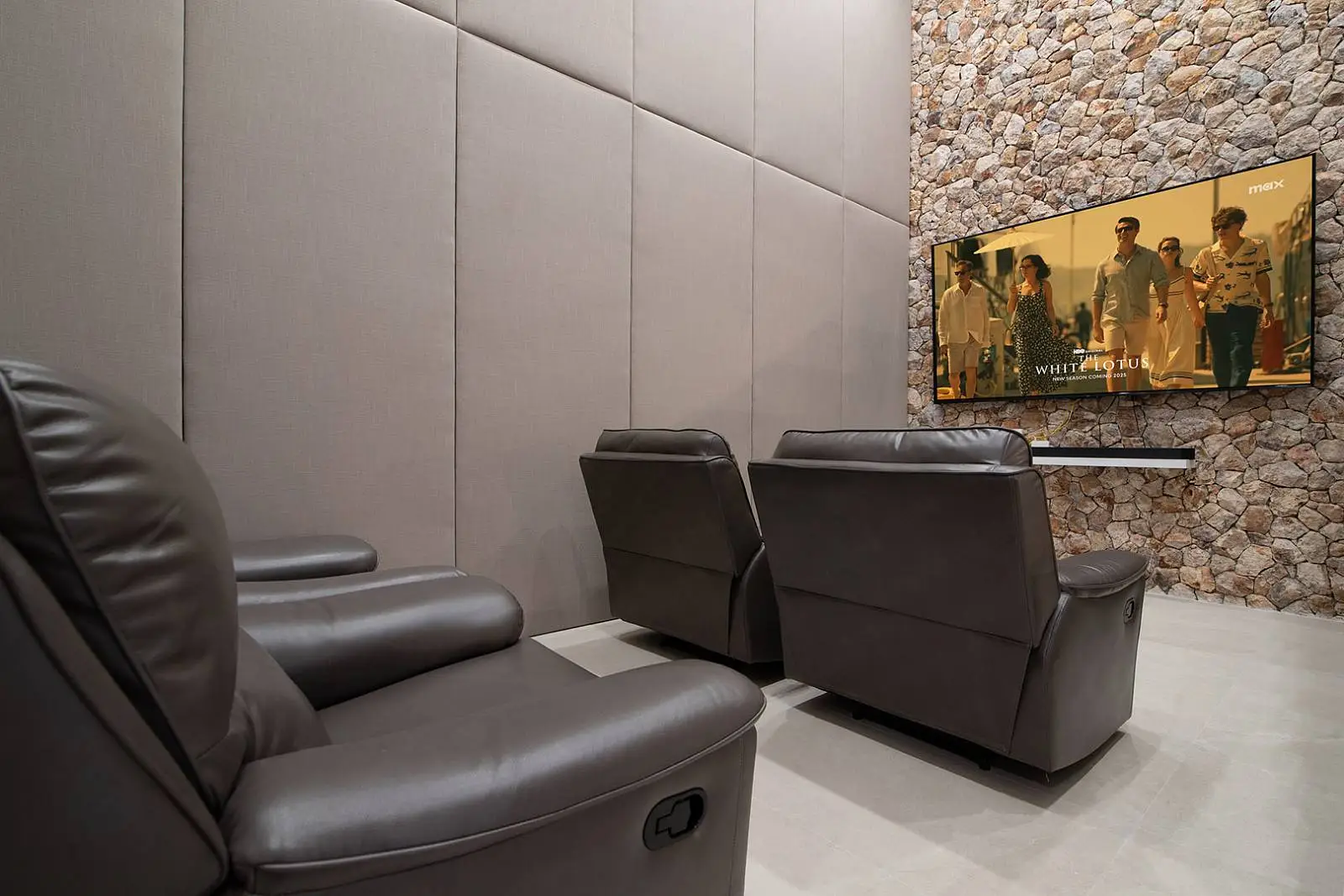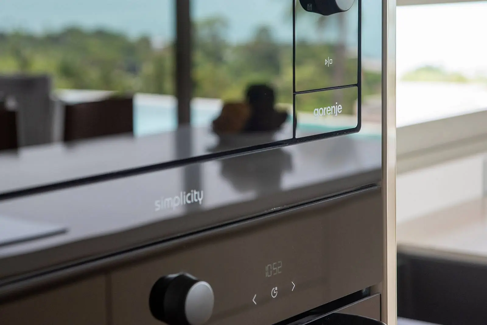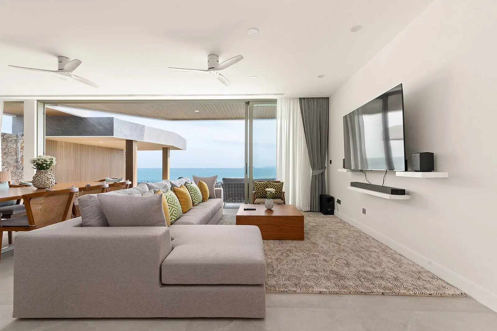 Just steps from Bangpor Beach and set on a gentle low hill, Beso Grande is the project’s premium seaview villa type—a three-storey residence featuring generous interiors, an in-villa elevator, and expansive ocean views towards Koh Phangan. The entry opens to the middle level, where an open-plan living, dining, and kitchen area flows seamlessly onto the pool terrace with an infinity pool and sunken sala. A fully equipped commercial kitchen sits discreetly at the back for professional catering or private dining.