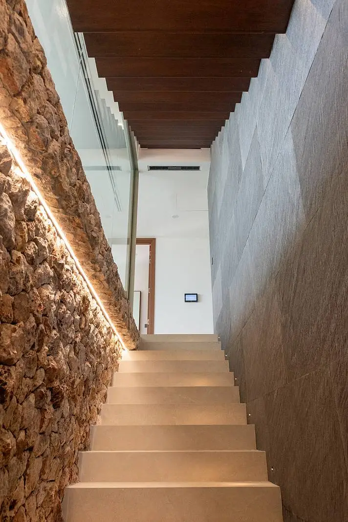 The upper floor hosts two oversized master suites, each with a walk-in closet and seaview ensuite bathroom. Both bedrooms open onto a wide shared balcony with panoramic ocean vistas. The lower level includes a dedicated laundry room, a large storage room, two guest bedrooms with ensuite bathrooms that open onto the garden, and a private cinema room for entertainment.