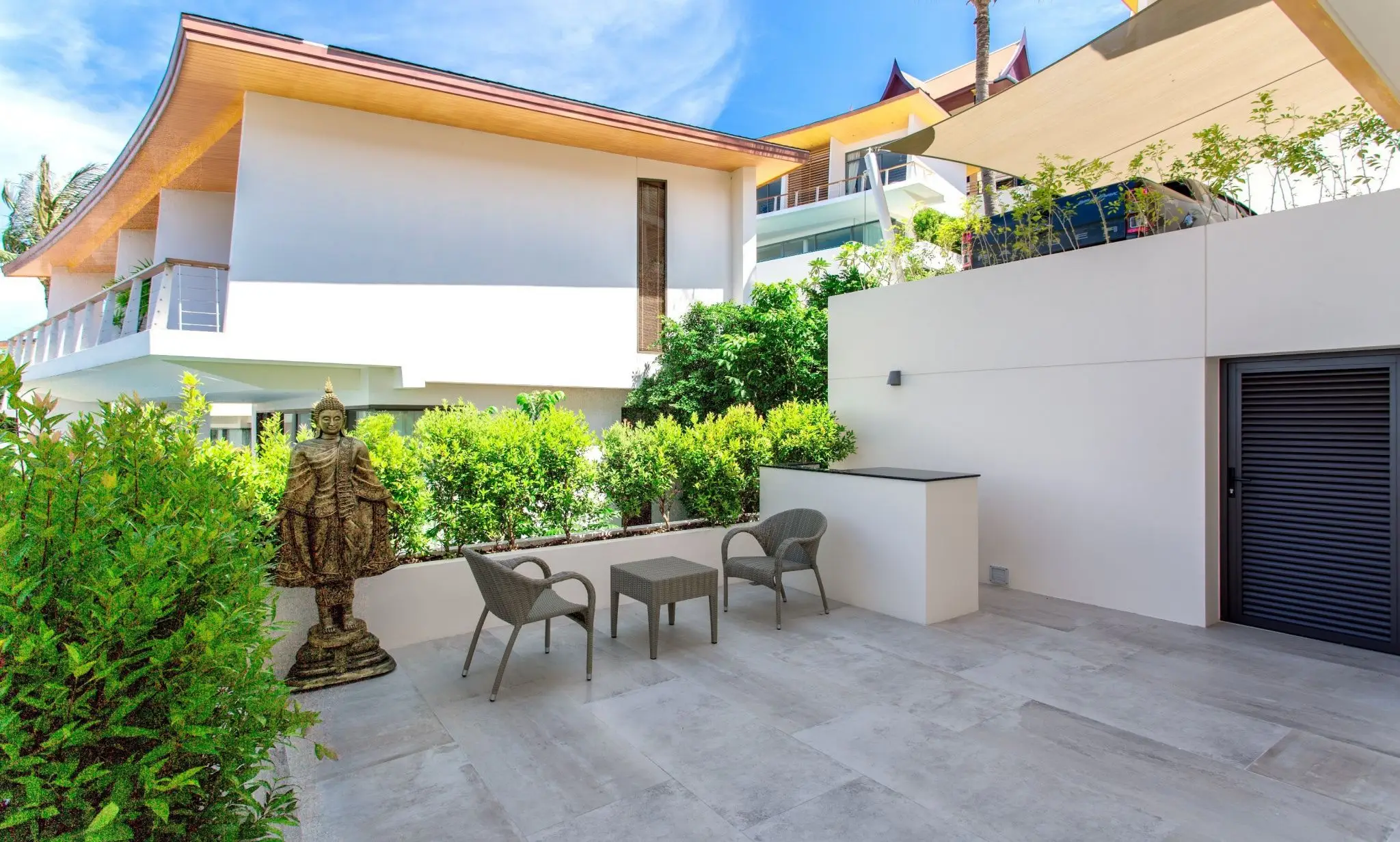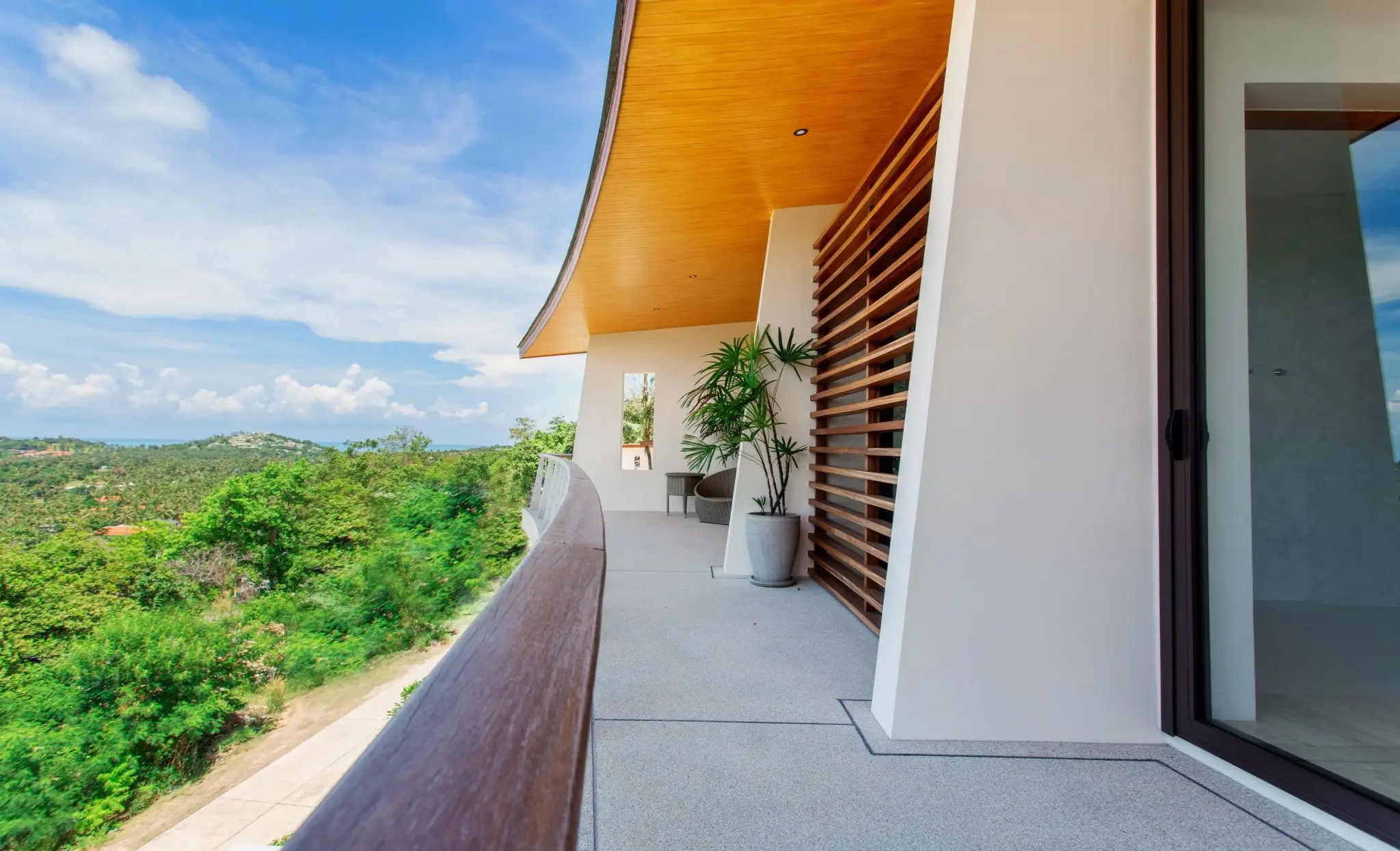 This just completed contemporary four bedroom hillside villa commands one of the best positions in the desirable Ridge complex situated in Choeng Mon Beach (North East Samui). It's stunning panoramic sea views and those of Samui's iconic Big Buddha temple are unimpeded and cannot be built out. Lush trees beside the villa ensure privacy from the other villas of the complex.