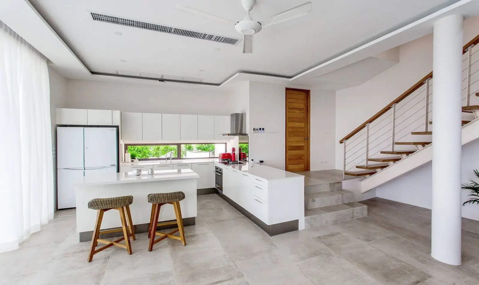 The villa has three levels. Main Entrance to the property is at the top level. Two comfortable double en-suite bedrooms are located on the top floor. These open on to a large deck and enjoy spectacular sea and local area views. Both roomy en-suite bathrooms are stylishly fitted out. The master bedroom's bathroom not only has a elegant bathtub and big shower place, but also has a dedicated make up station. The toilet is equipped with intelligent toilet seat cover. The master bedroom also has mosquito screens so you can enjoy natural breeze at sleep.