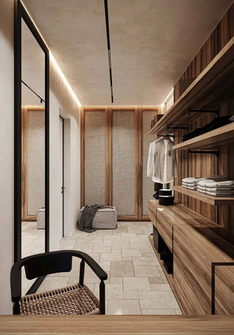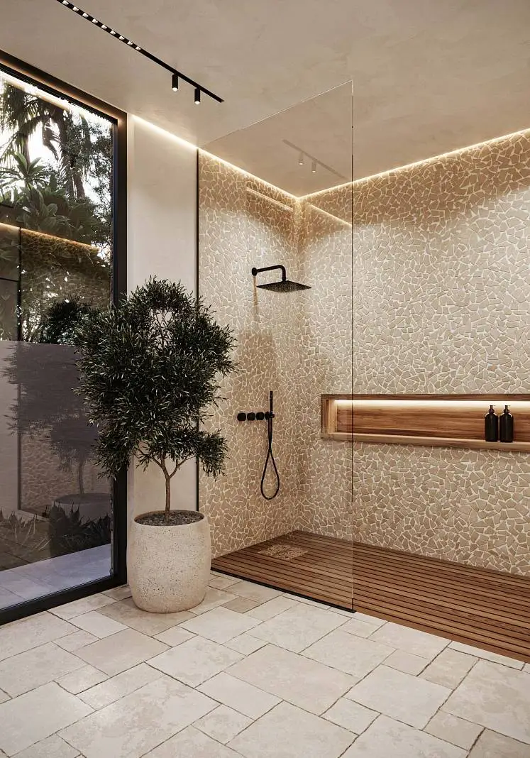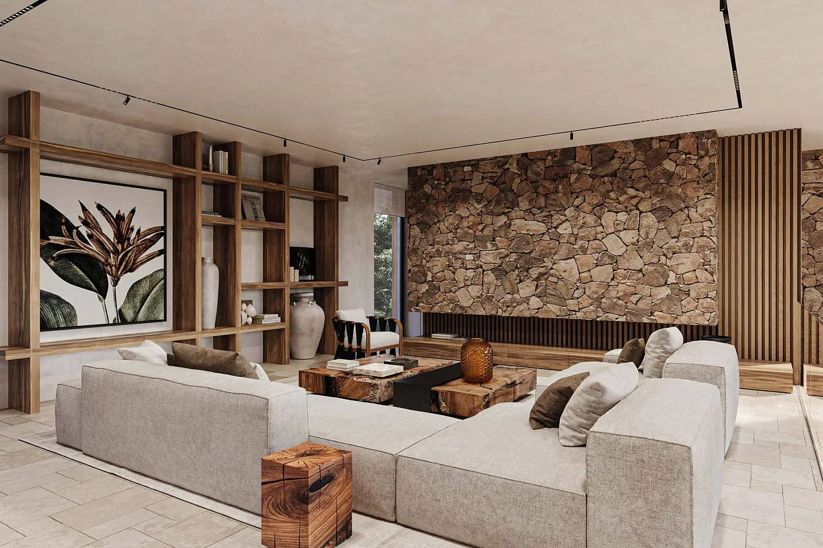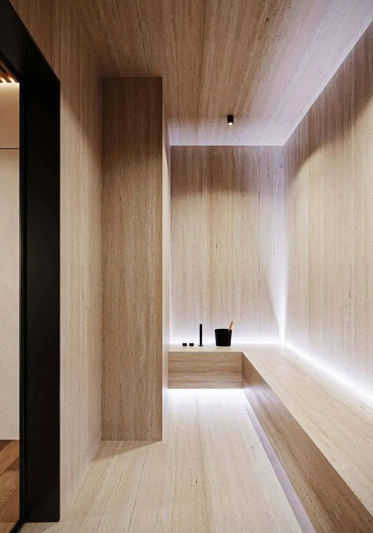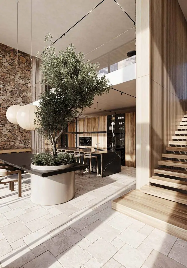 · Expressive textures: Textured white walls combined with natural wood and stone create a warm and cozy atmosphere.