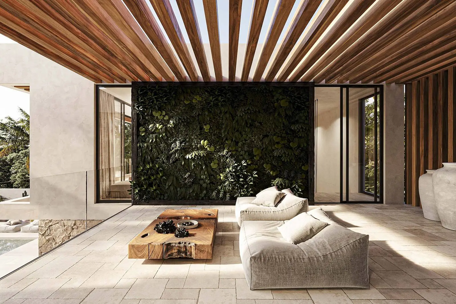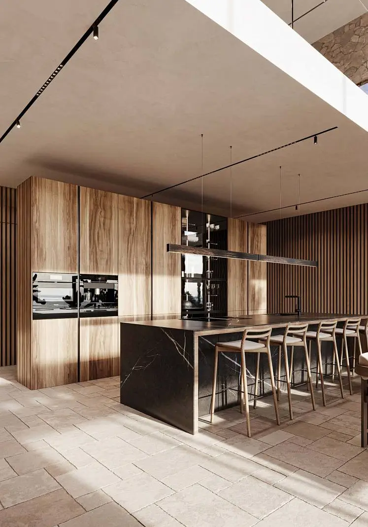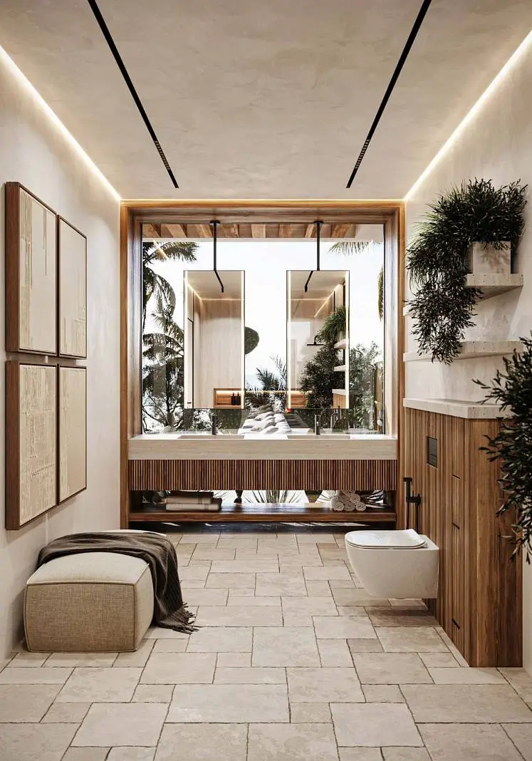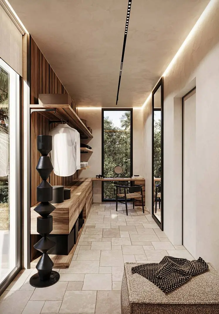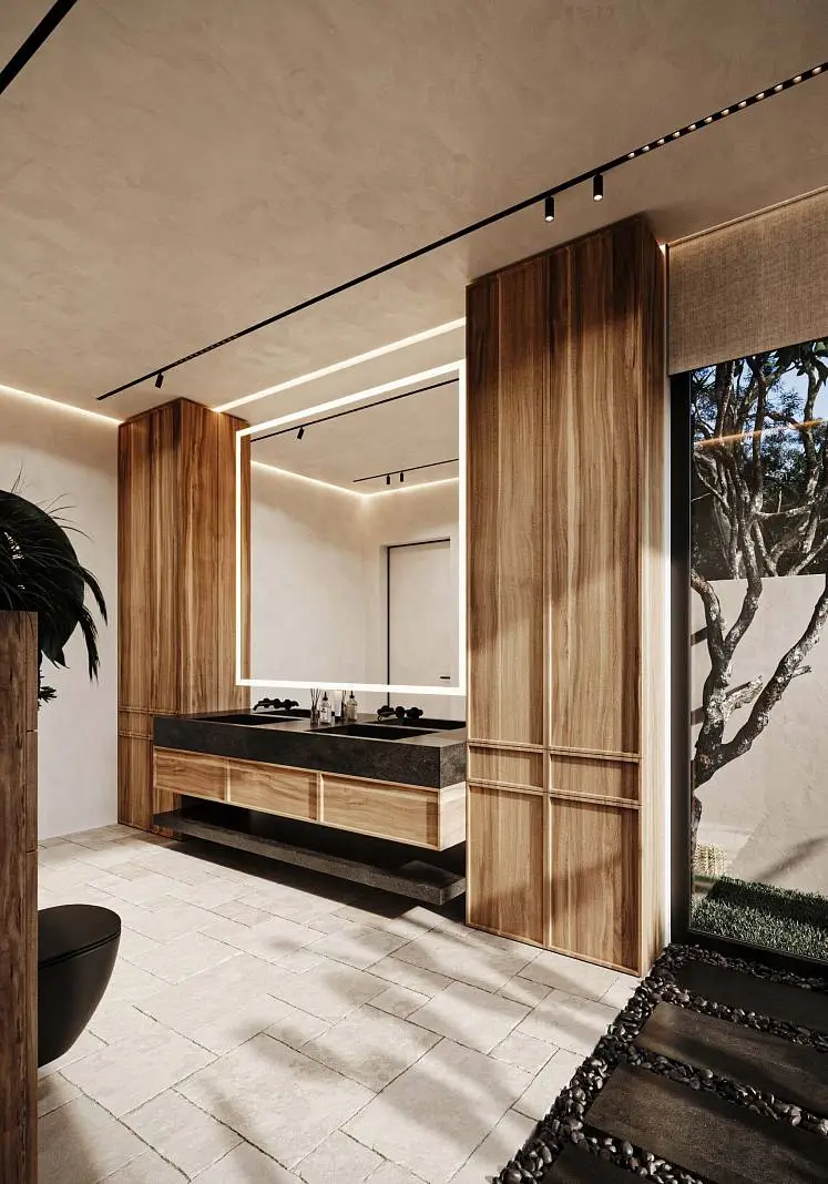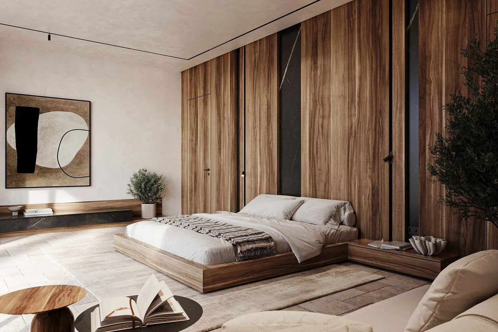 · Expressive textures: Textured white walls combined with natural wood and stone create a warm and cozy atmosphere.