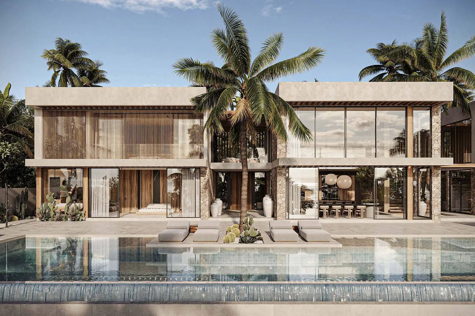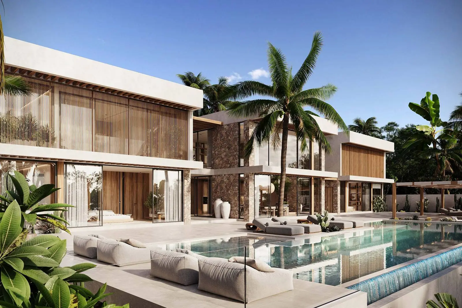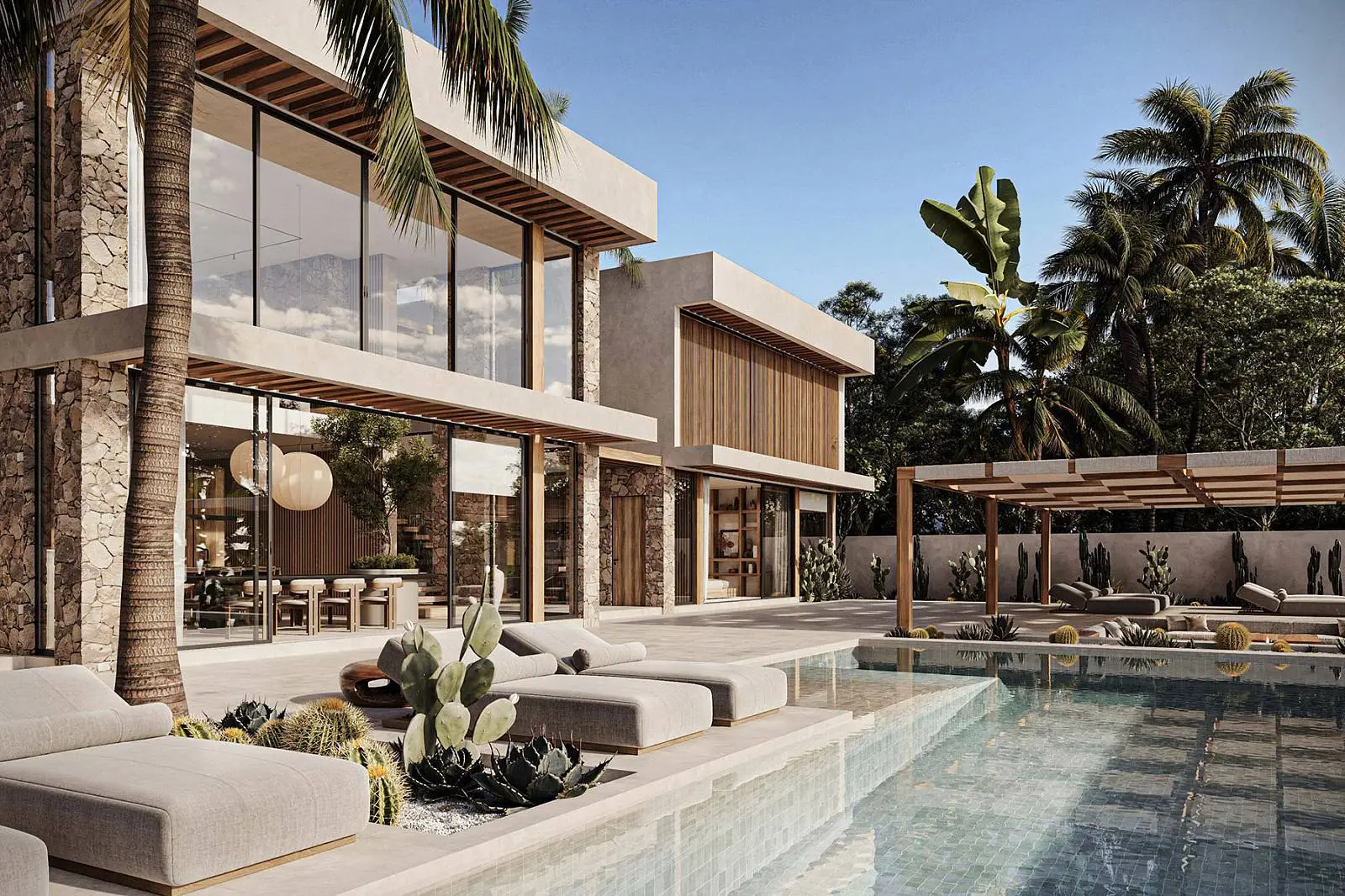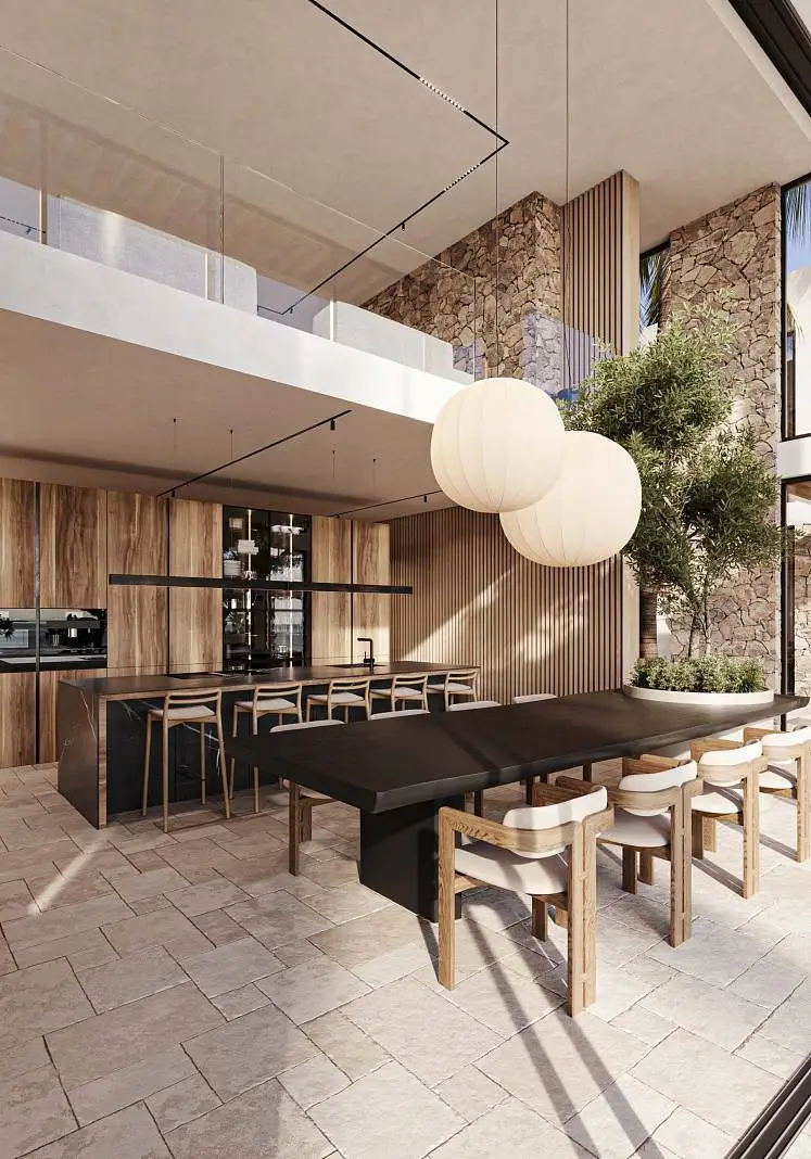 · Local stone for facade, swimming pool and interior design.