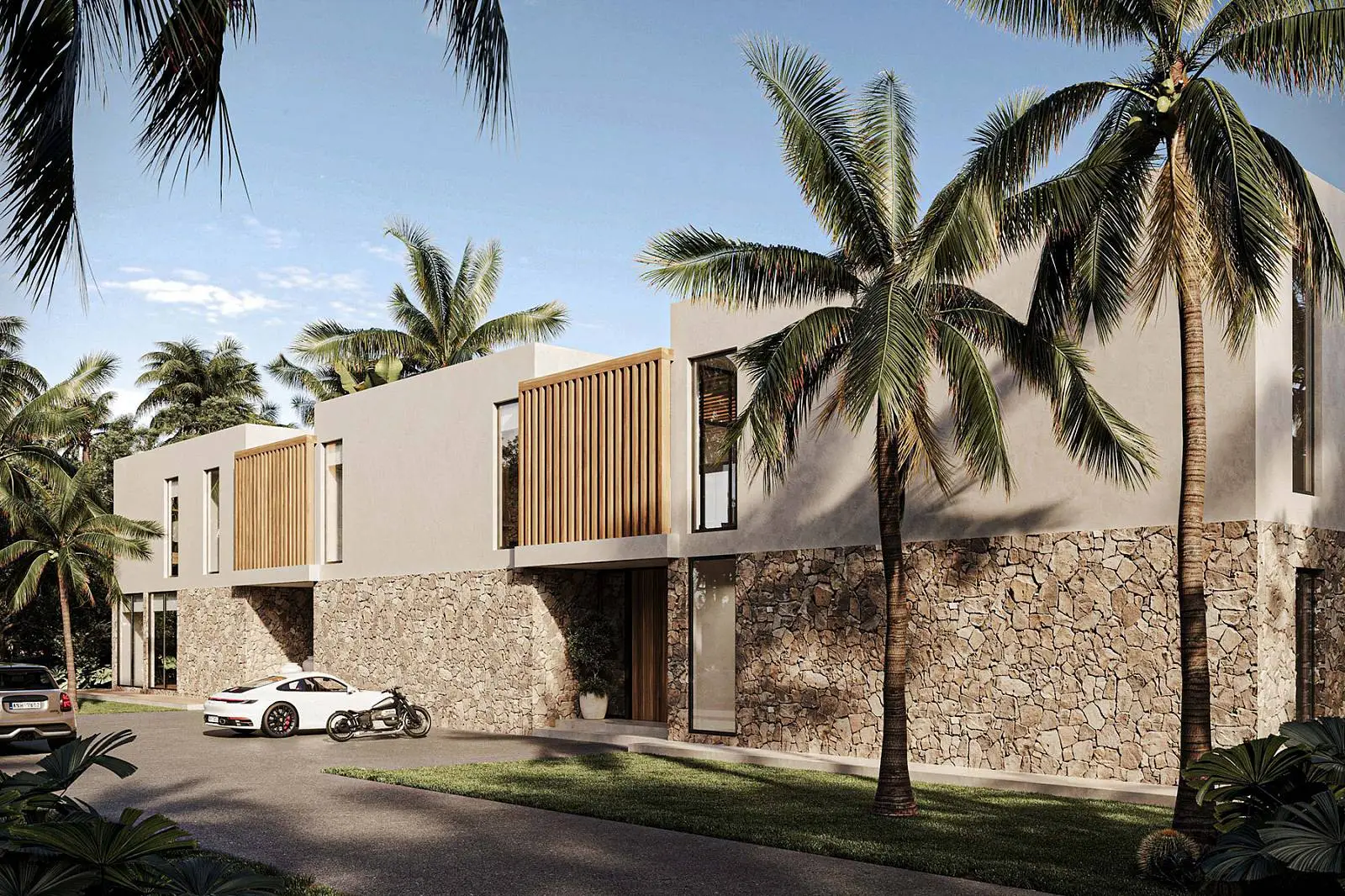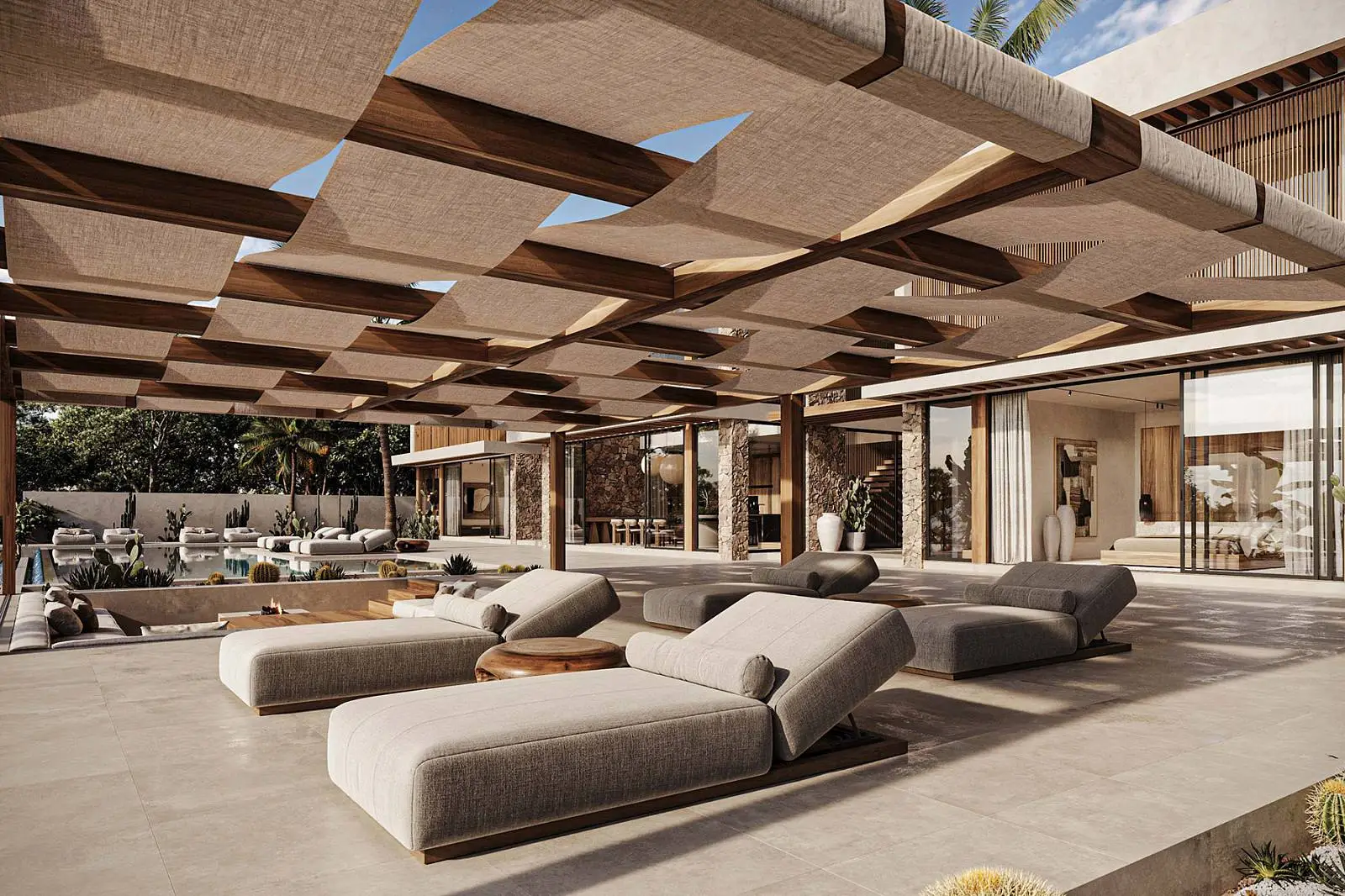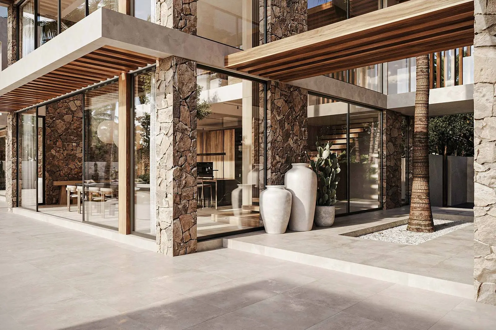 · Local stone for facade, swimming pool and interior design.