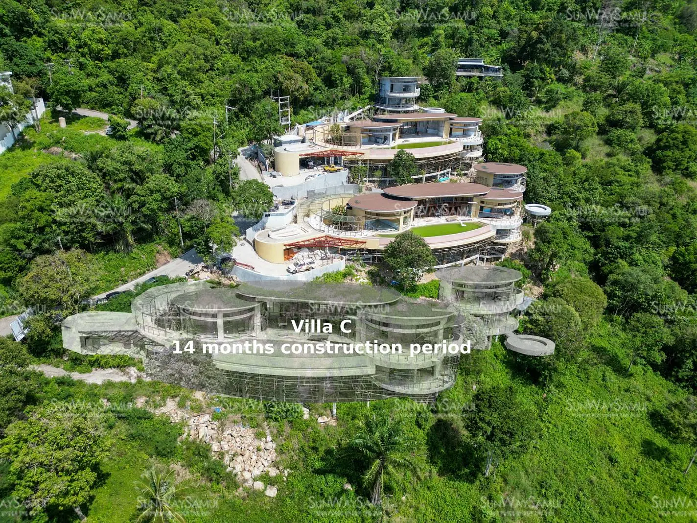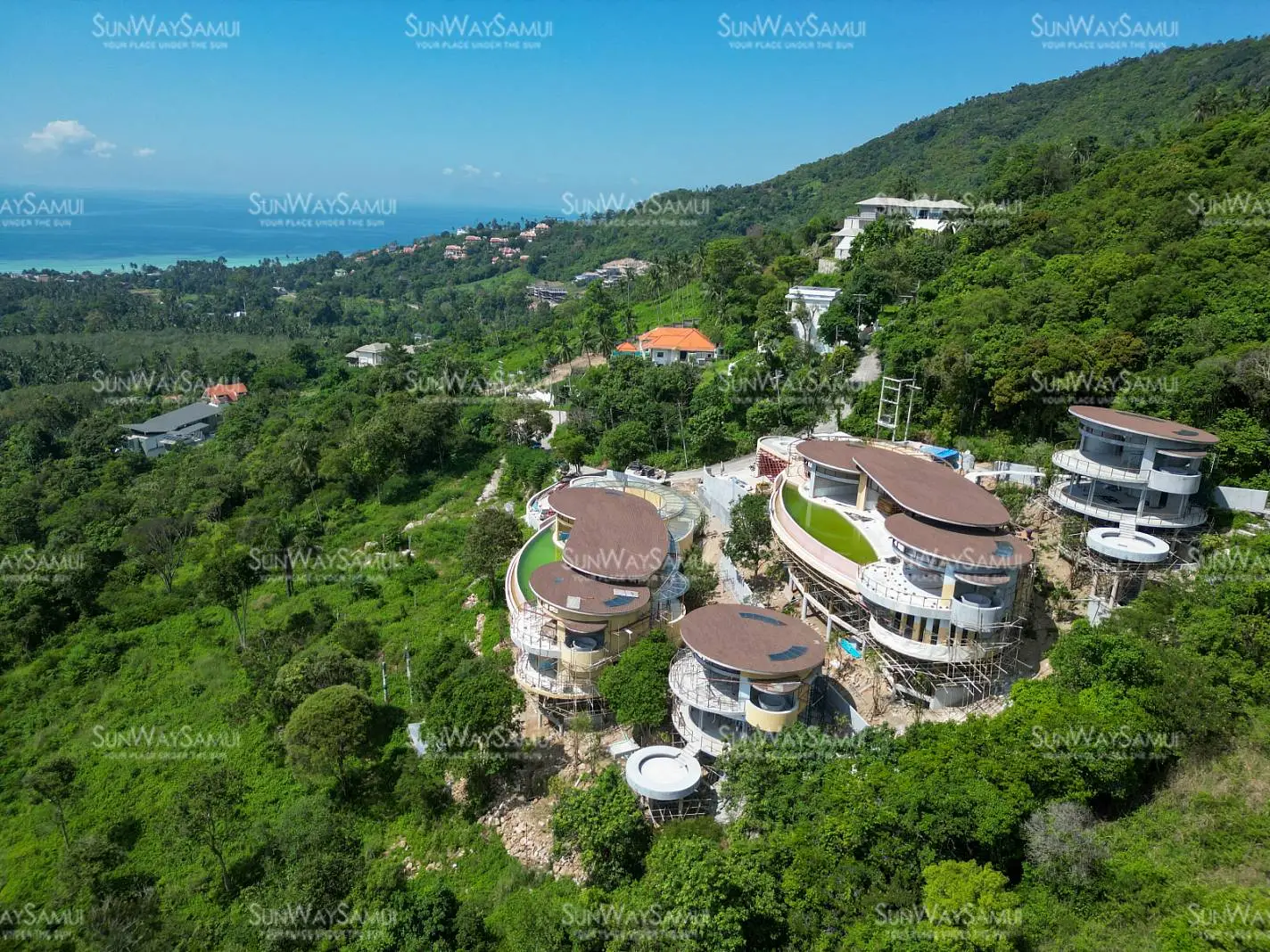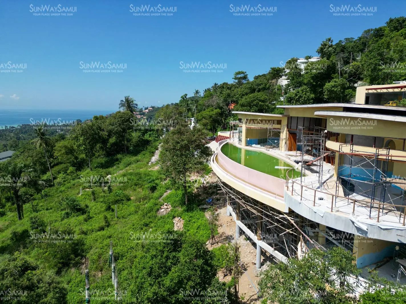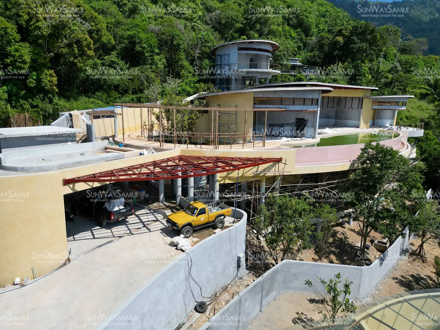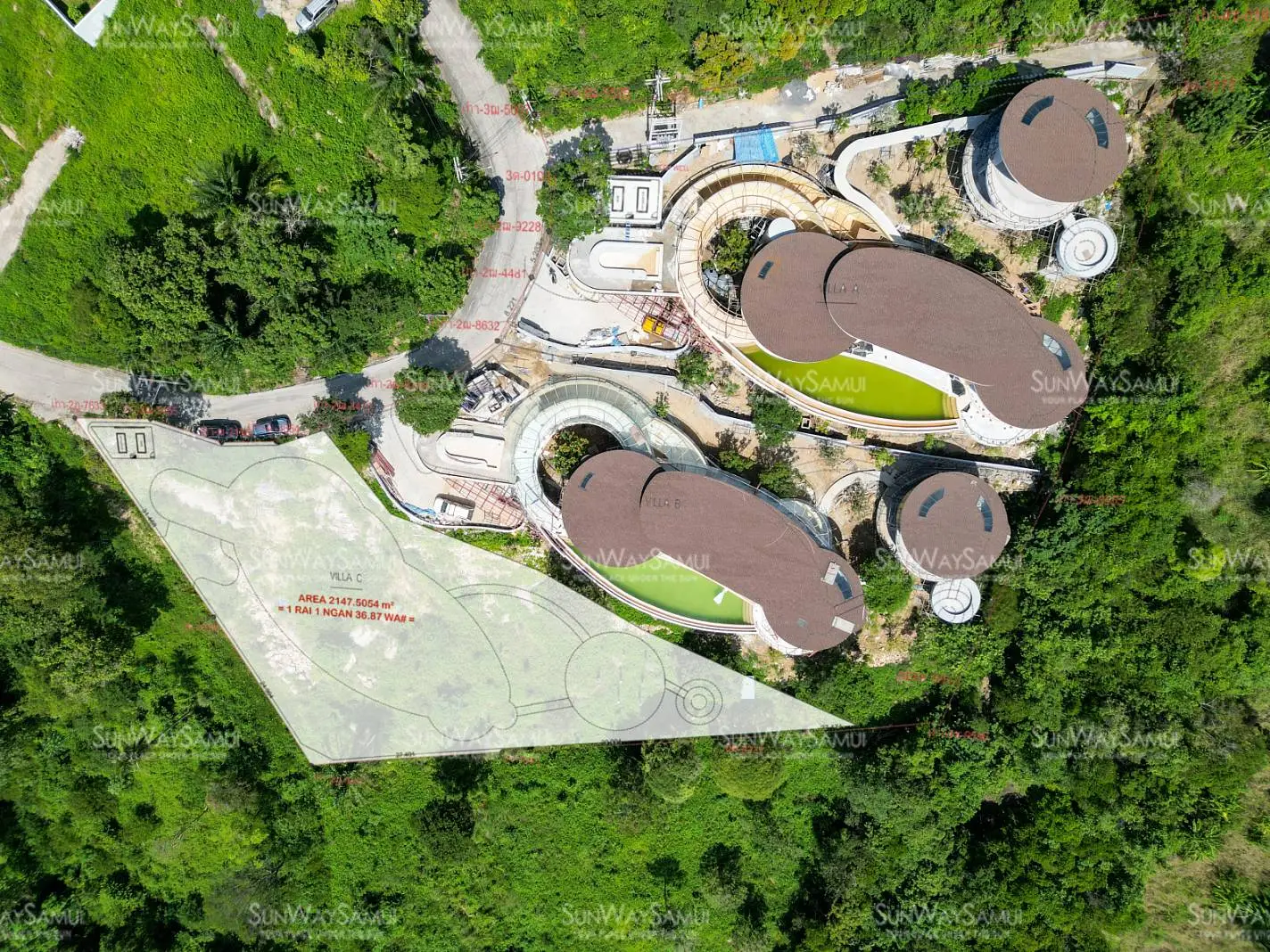 Experience the unparalleled charm of Kunkhao Tara Villa, an extraordinary under construction villa project that seamlessly integrates architectural finesse with the surrounding nature, incorporating natural raw materials and ecological aesthetics. The villa's design showcases a wide seaview frontage and artistic elements, characterized by numerous ovals and rounded edges, crafting an organic and distinctive structure.