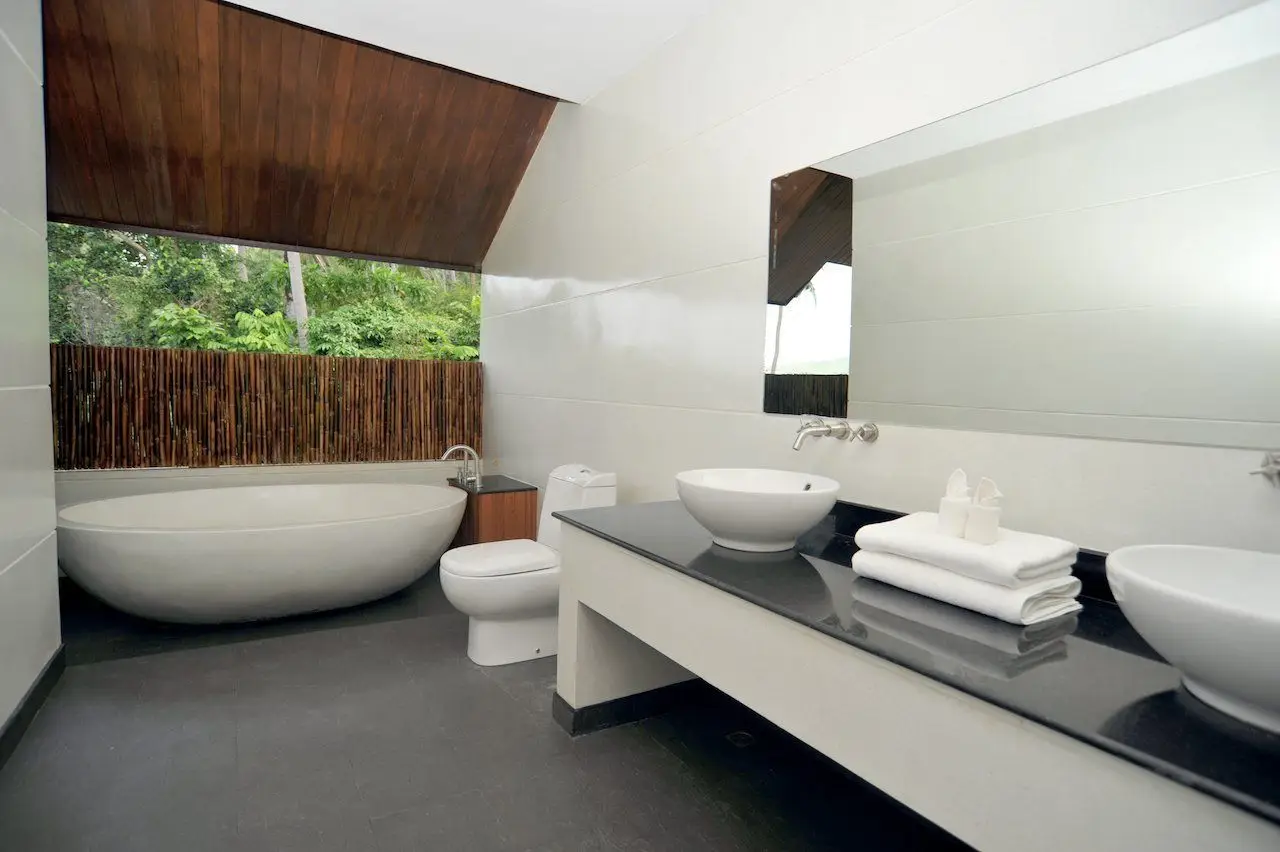 A set of stairs leads from the pool terrace up to the 2nd floor with 2 master bedrooms with sea views. Both bedrooms feature high pitched wooden ceilings, king-size beds, wardrobes, flat screen TV’s and ensuite bathrooms. Master bedroom 1 has a terrazzo bathtub. Both master bedrooms open onto a single covered balcony with a beautiful view of a grass lawn and the coconut groves. There is also a terrace for sunbathing with a canopy of this floor. It is perfect for relaxing while feasting your eyes on the magnificent surrounding nature.