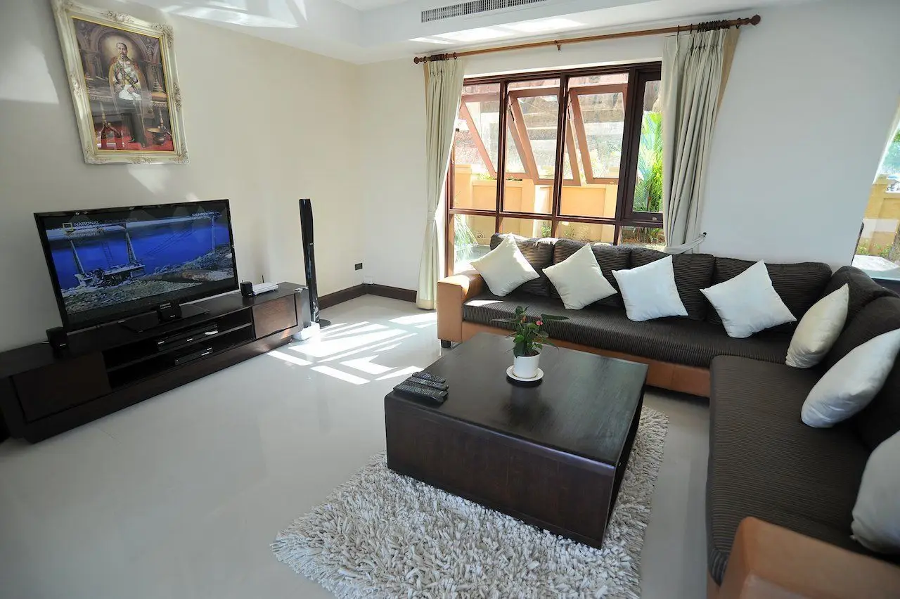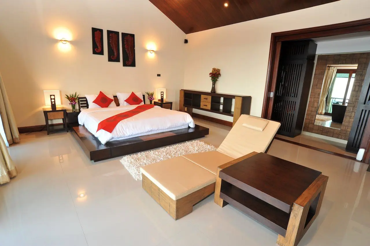 The second terrace for sunbathing is downstairs from the pool level and has chaise longues, a murmuring waterfall and a small sala with views of the landscaped premises. The 5th ensuite bedroom is right by this second terrace fitted with a king-size bed, wardrobes and a flat screen TV.