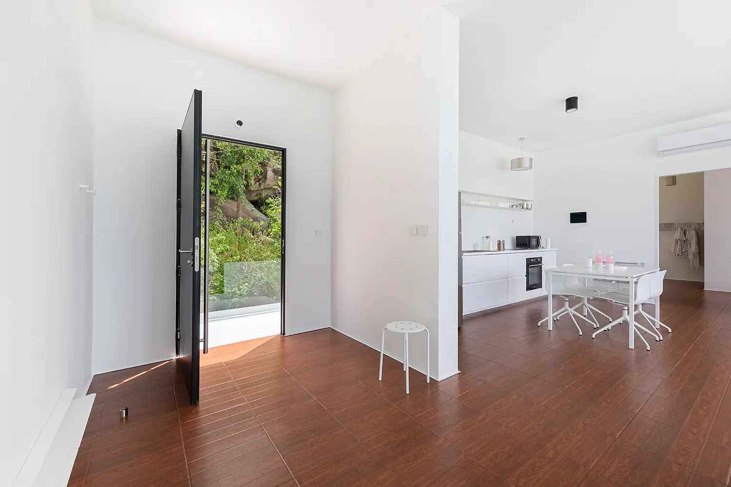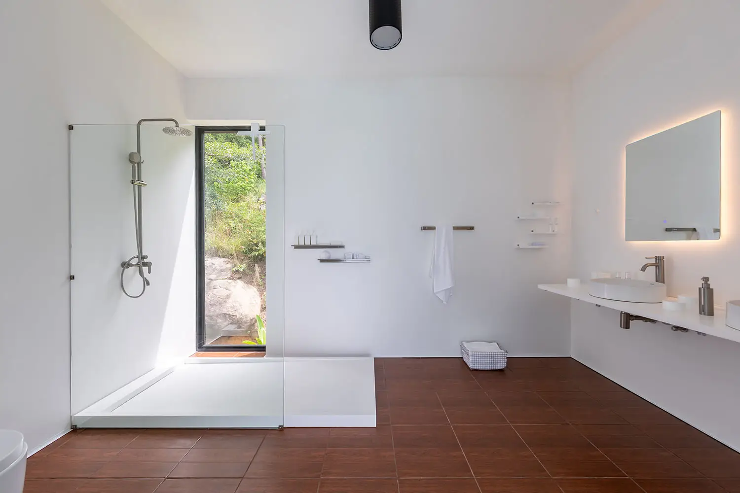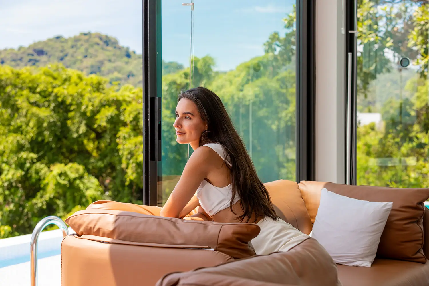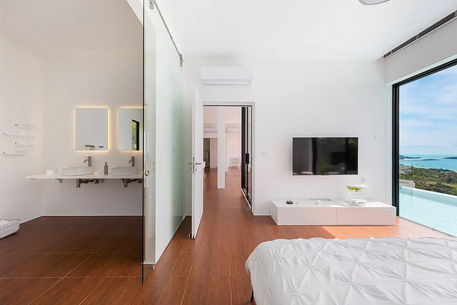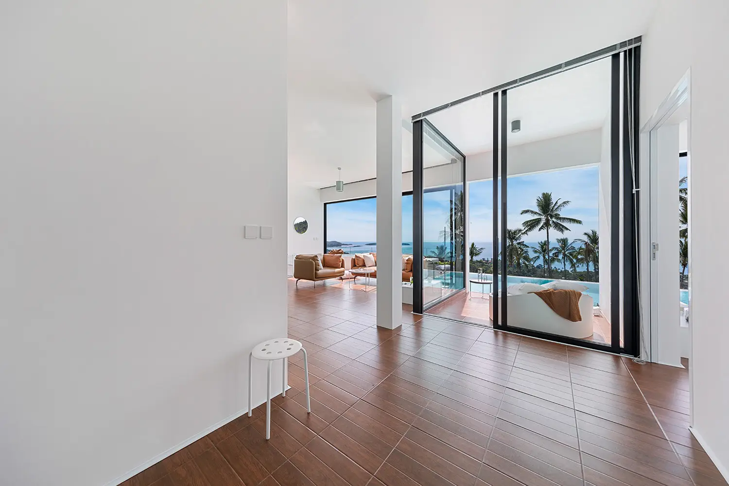 At the top level, the villa opens into a loft-style living concept centered around open-plan living, dining, and kitchen areas that flow directly onto a pool terrace. Here you'll find a custom infinity-edge pool with Jacuzzi and a built-in outdoor seating nook perfect for enjoying the views. One side of the upper level houses the master suite with ensuite bathroom, while the other features a convertible office space, currently functioning as a laundry and wardrobe area but easily adaptable into a second bedroom and bathroom.