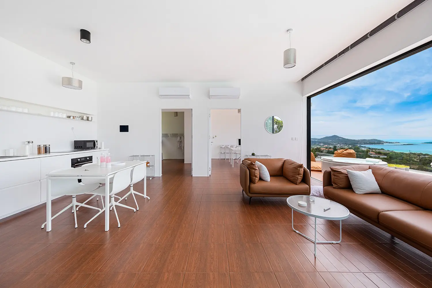 The home enjoys a rare combination of 180° panoramic sea views to the front and serene jungle views to the rear, offering a true sense of natural connection. Designed with clean, minimalist lines, the property is spread across three levels, blending open-plan living with smart zoning and understated luxury.