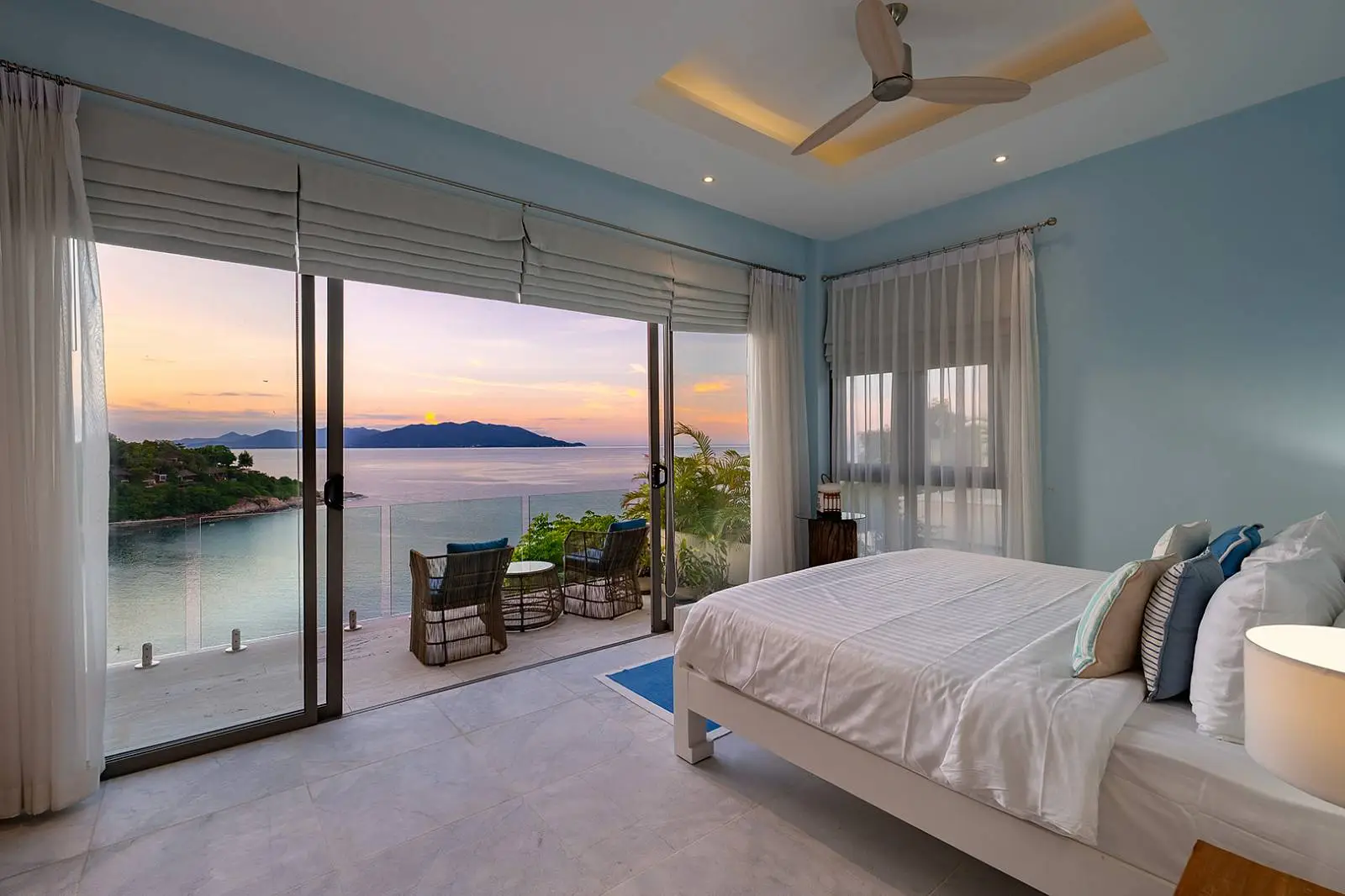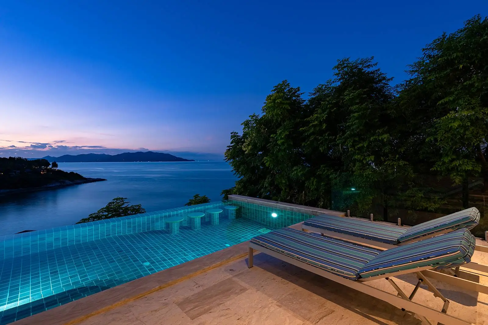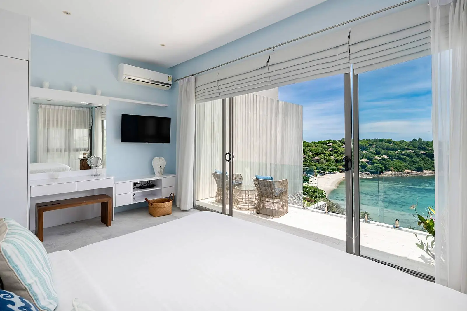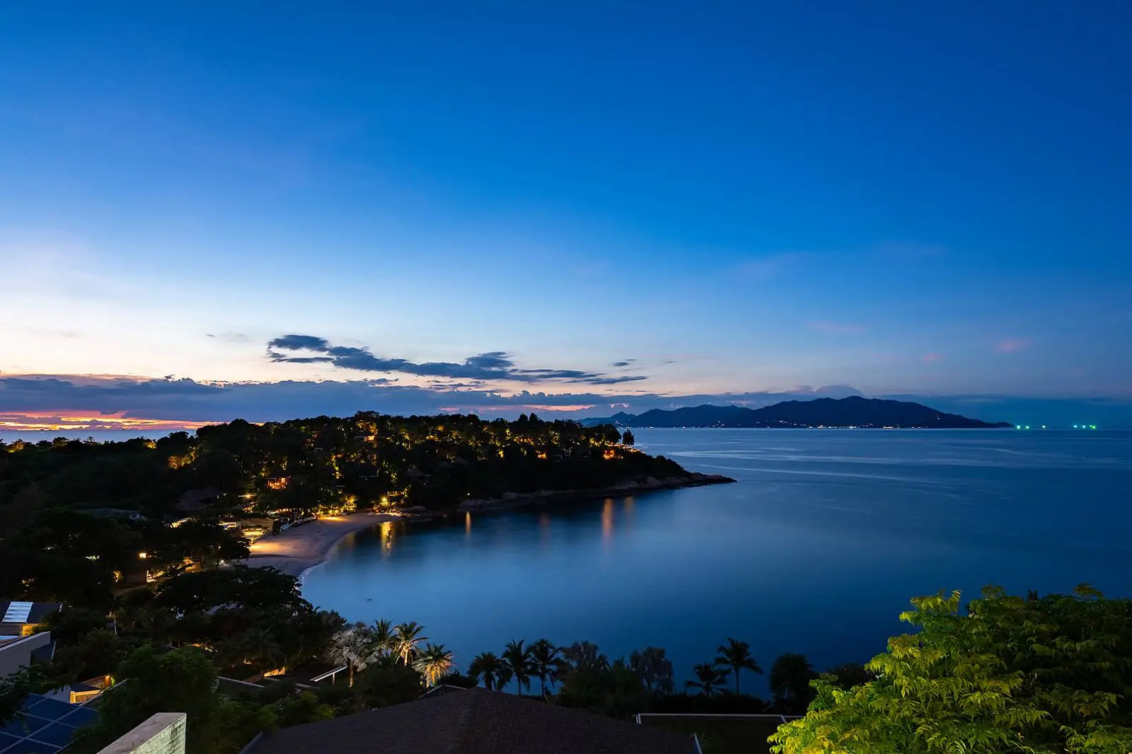 Positioned on the top row, this semi-detached villa is located just three rows from the shoreline on a gentle hillside, offering captivating views of the bay and the silhouette of Koh Phangan.
