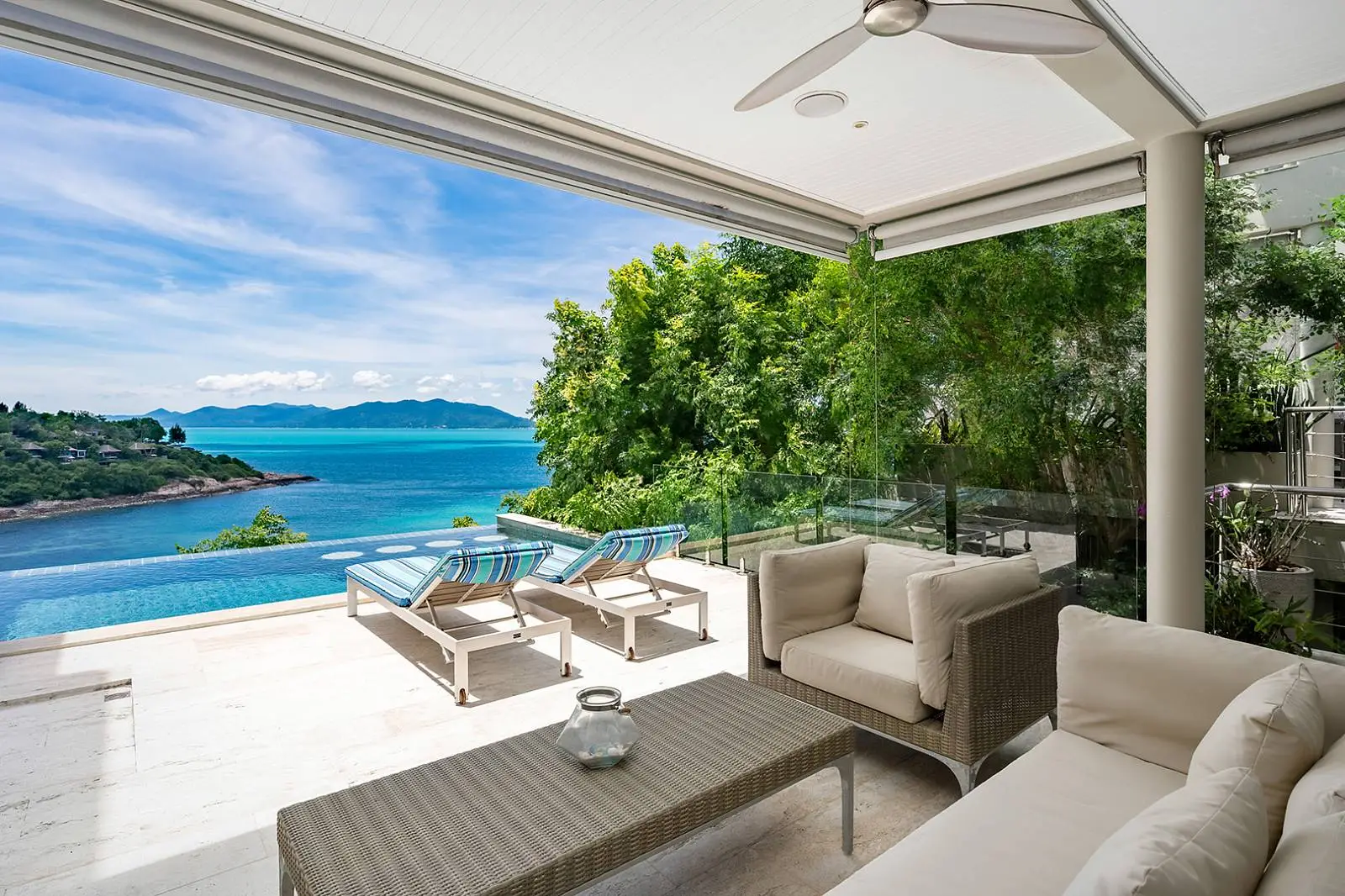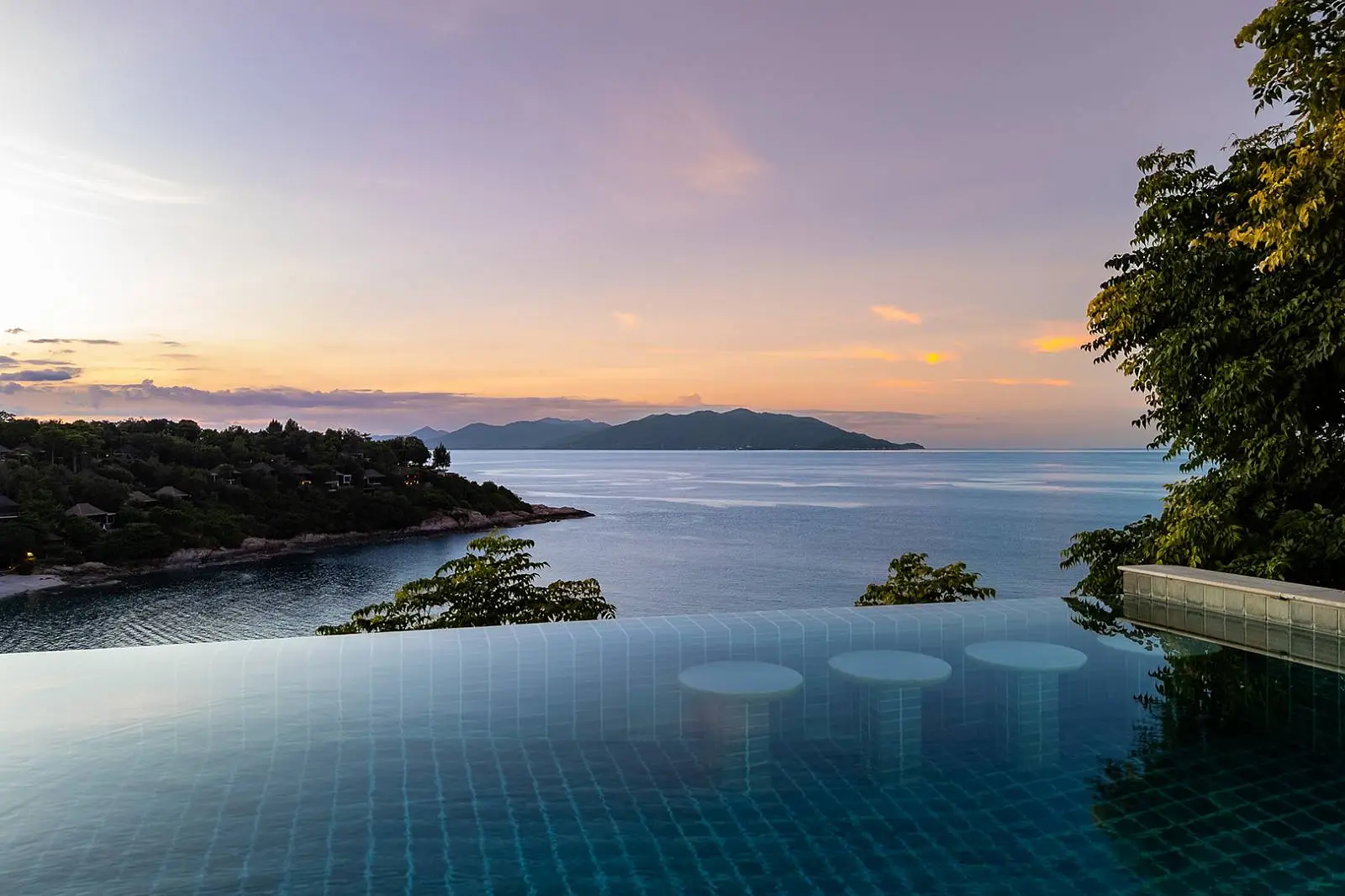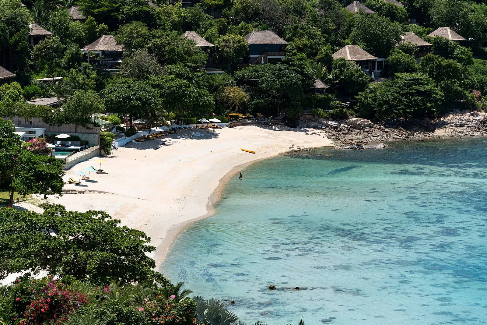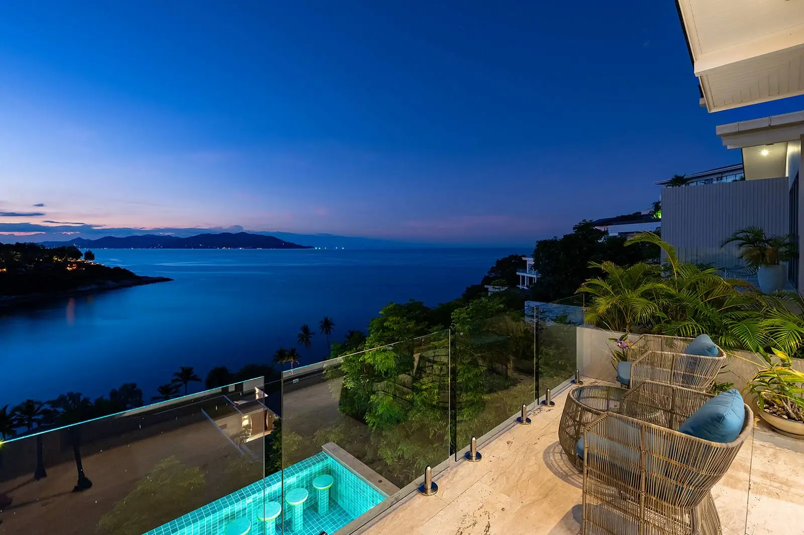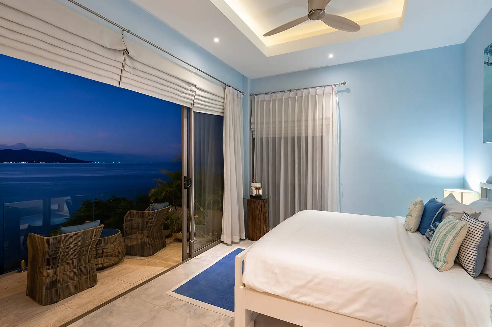 Positioned on the top row, this semi-detached villa is located just three rows from the shoreline on a gentle hillside, offering captivating views of the bay and the silhouette of Koh Phangan.