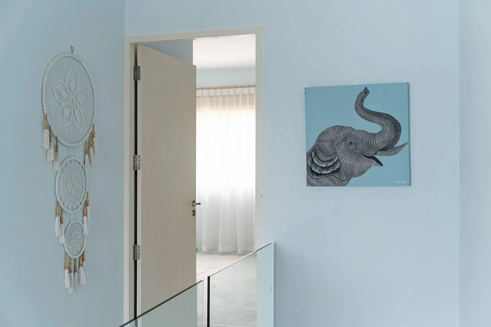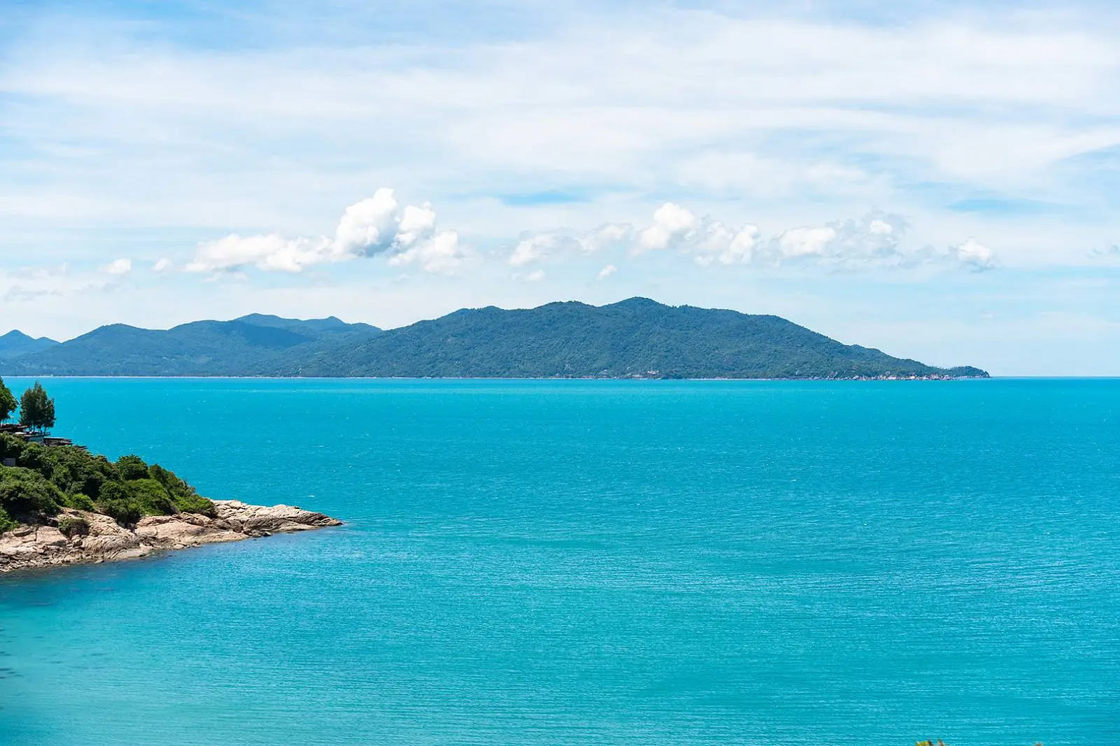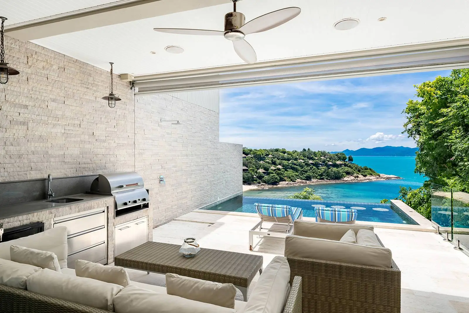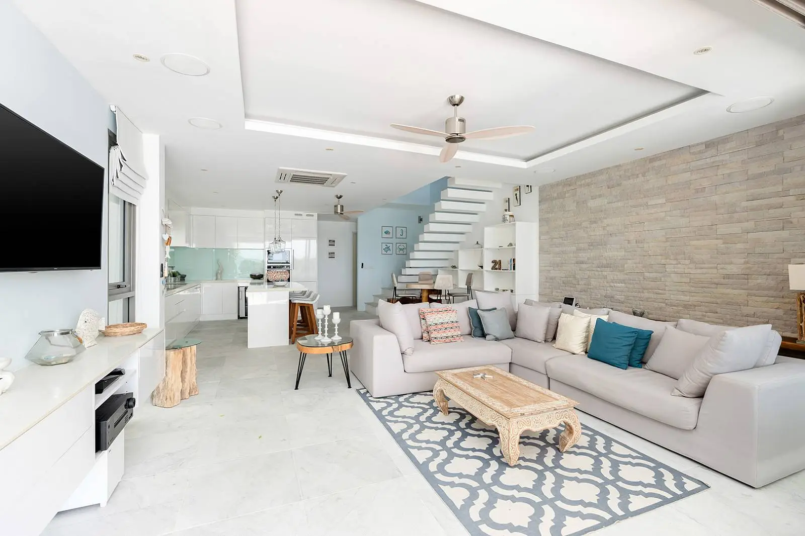 Positioned on the top row, this semi-detached villa is located just three rows from the shoreline on a gentle hillside, offering captivating views of the bay and the silhouette of Koh Phangan.
