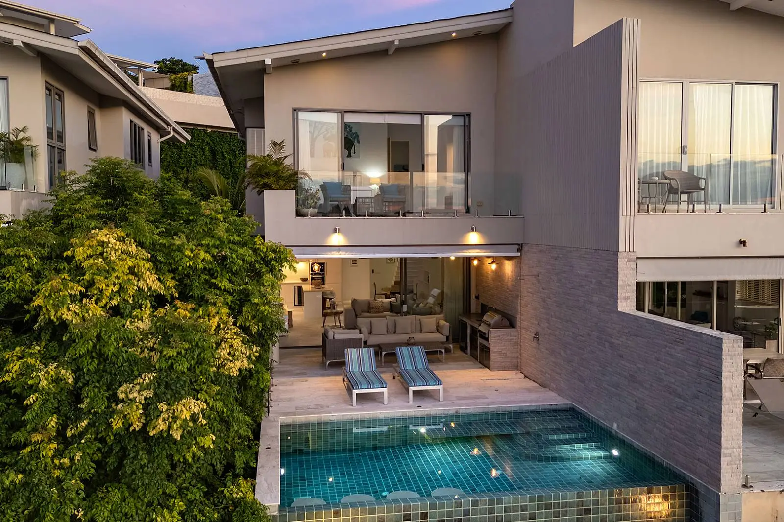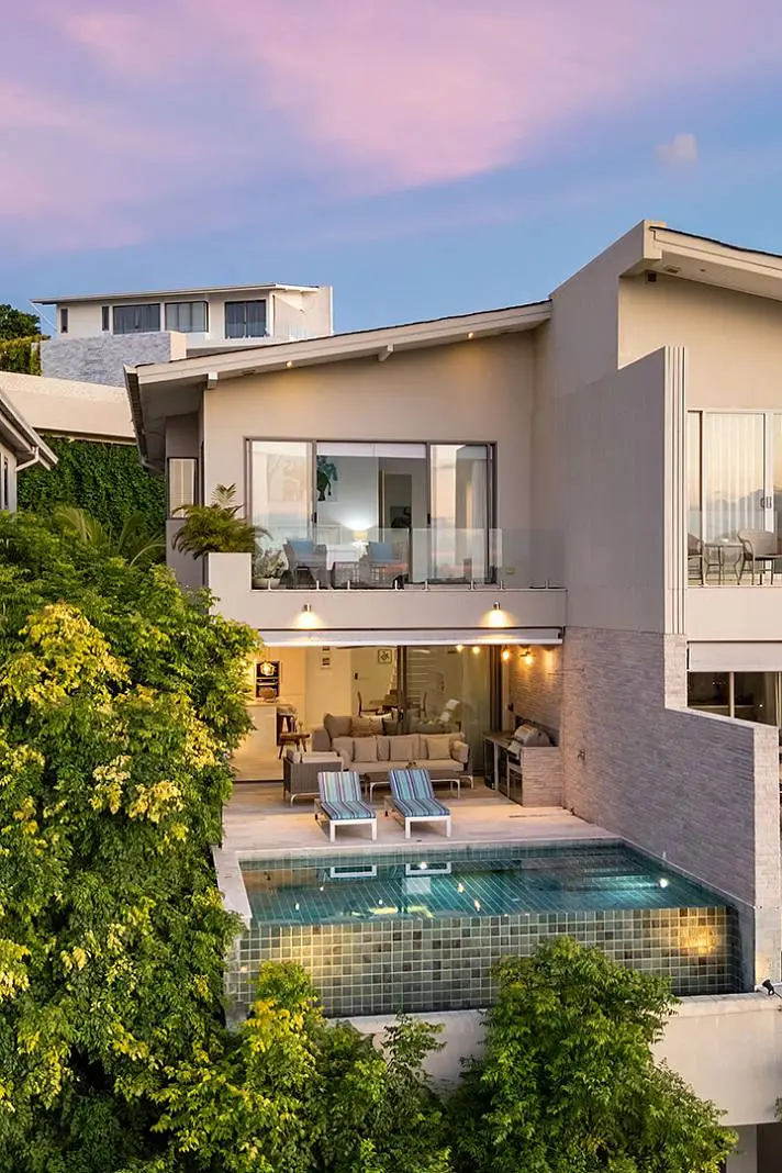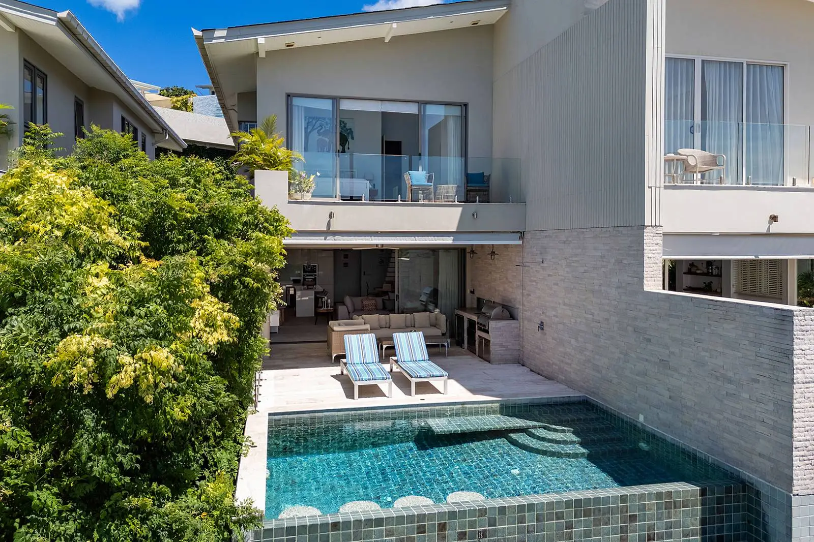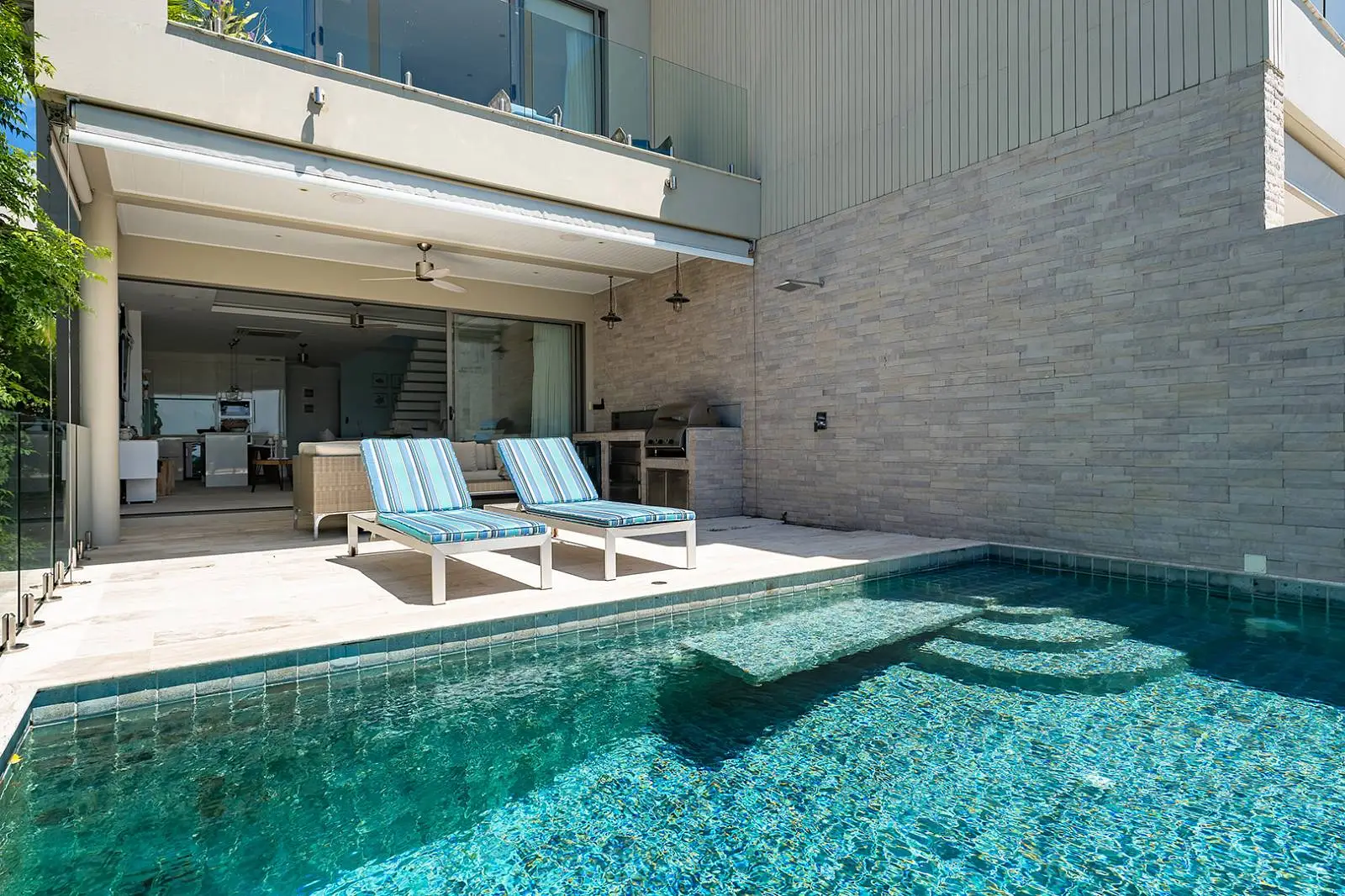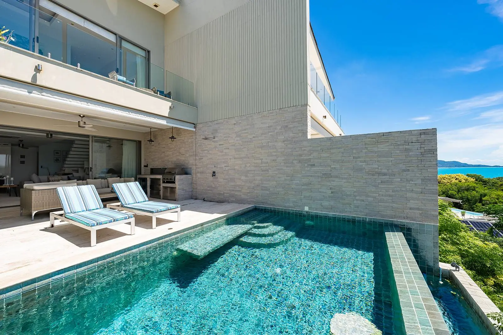 Ascending the side stairway to the middle floor, you’ll find a covered outdoor seating area and BBQ space, seamlessly connected to a terraced infinity pool with spectacular views. Inside, an open-plan living, dining, and kitchen area flows effortlessly, with a guest bedroom and external bathroom situated at the rear, alongside a laundry area.