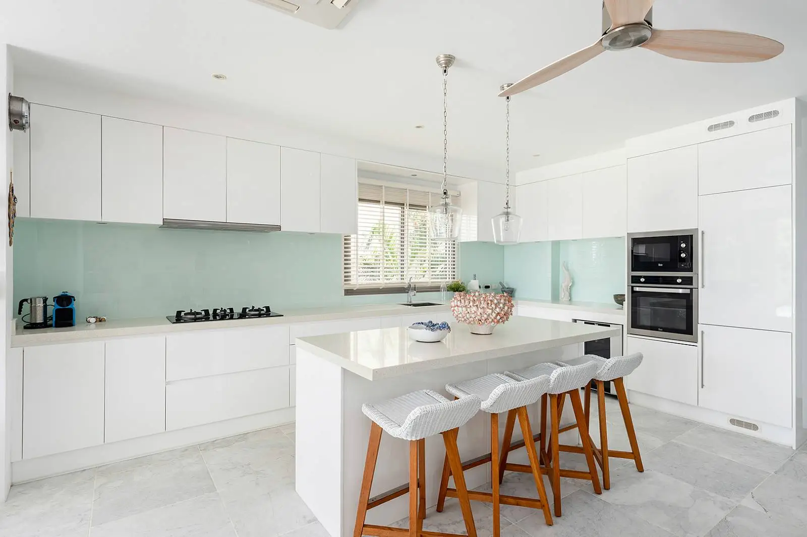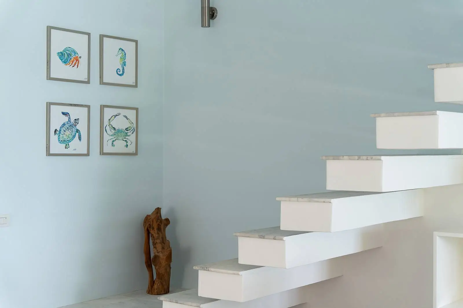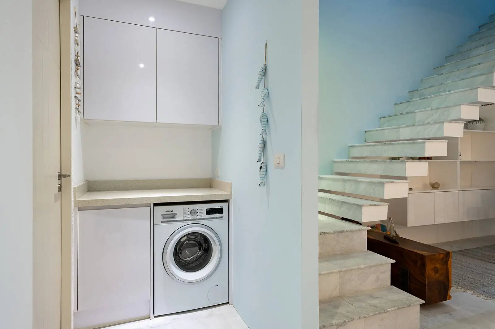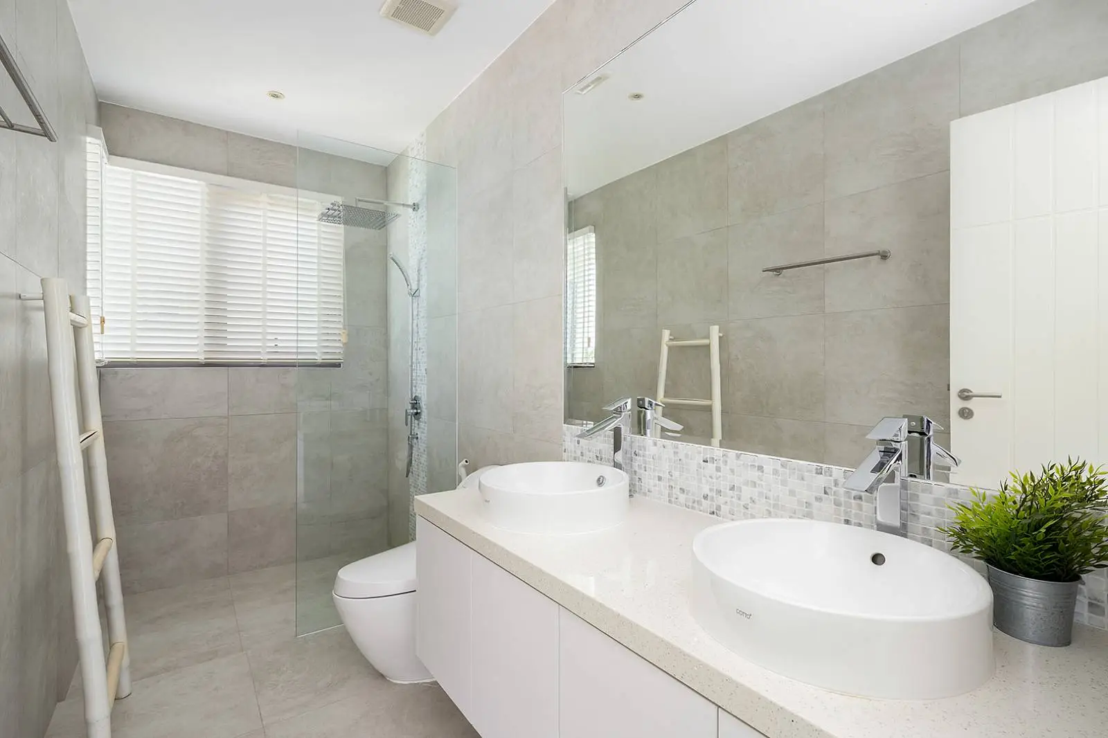 The top floor is home to three generously sized bedrooms, each with its own ensuite bathroom. The master bedroom features a private balcony with panoramic bay views and an extended ensuite with double vanity sinks. Two spacious guest bedrooms are discreetly positioned behind, offering comfort and privacy.