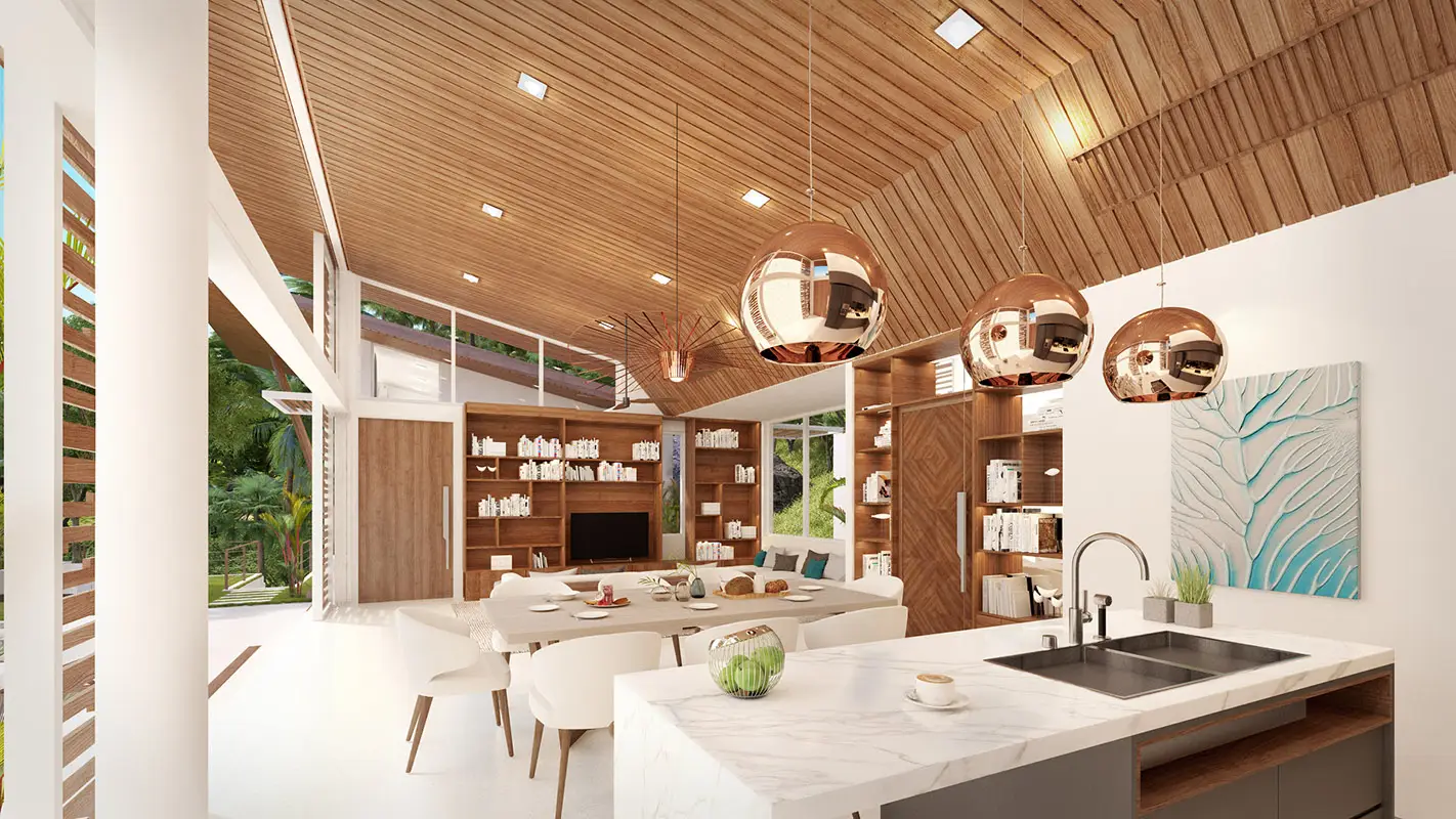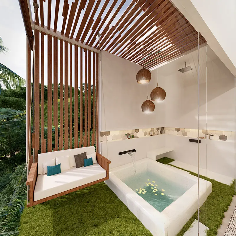 The architecture can be described as contemporary tropical, and the use of natural materials has been preferred. Masterplan maximizes the privacy of each villa, immersed into lush tropical surroundings while bold, angled roofs and sliding, expansive floor-to-ceiling windows and impressive entrances are showcasing the breathtaking view.