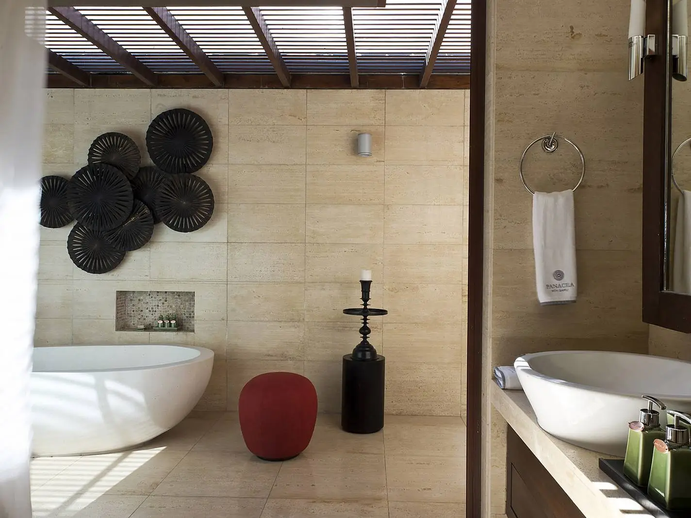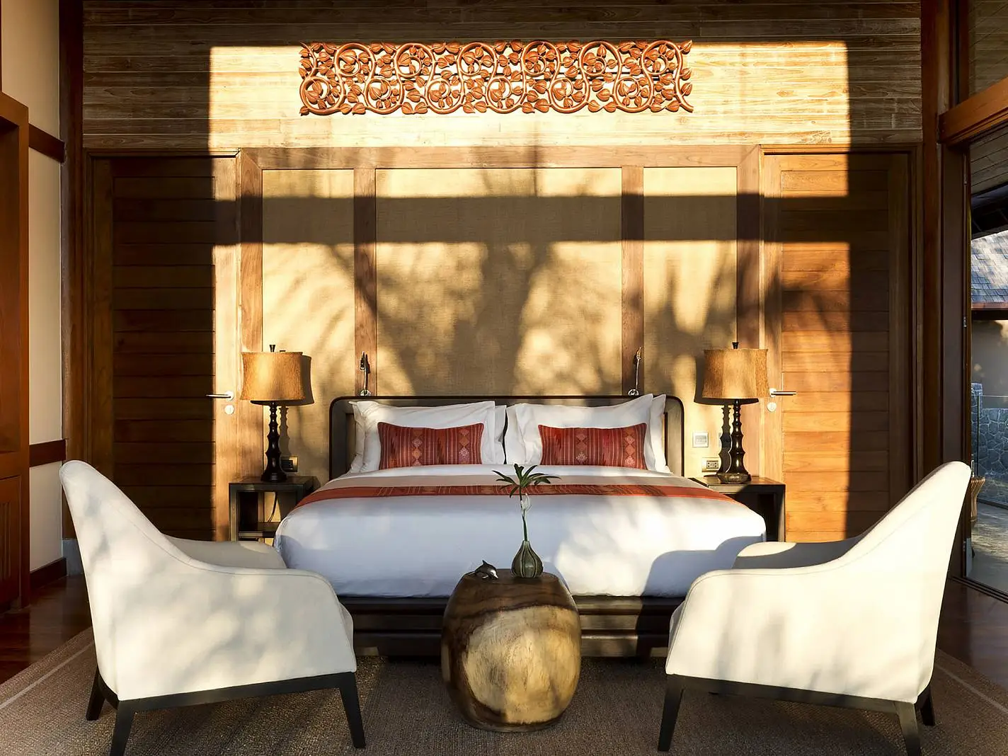 The villas at Panacea Retreat are masterpieces of contemporary Thai design, featuring shingle-roofed residences that blend seamlessly with the tropical landscaping. Interiors are adorned with light wood, rattan furnishings, and vibrant splashes of color, creating a sophisticated yet relaxed ambiance. The estate’s elevated position provides stunning panoramic views, while the private stone walls surrounding each villa ensure the utmost privacy.