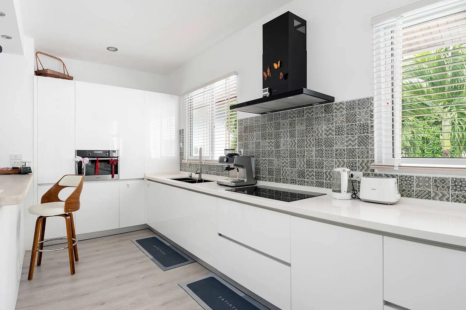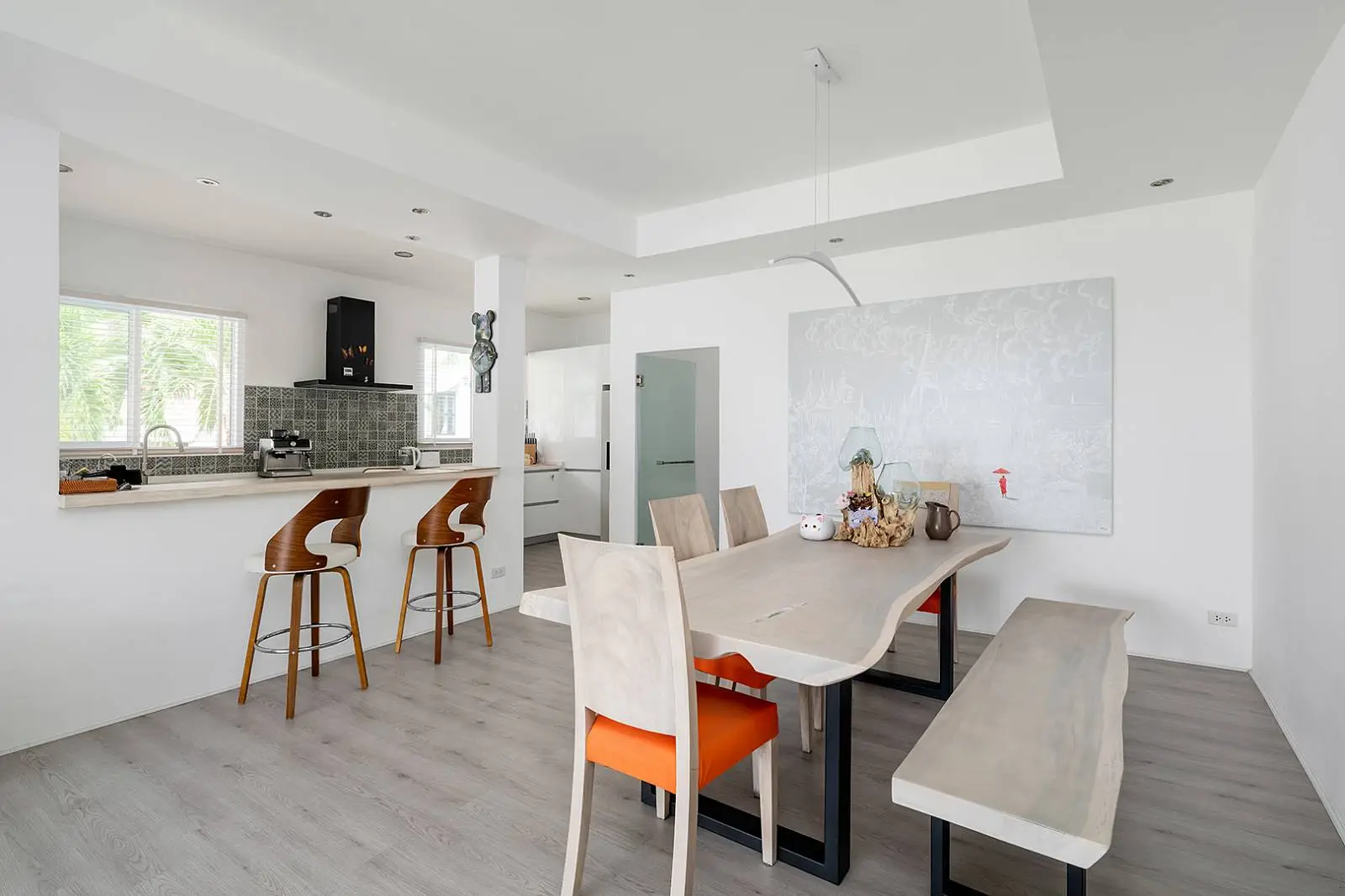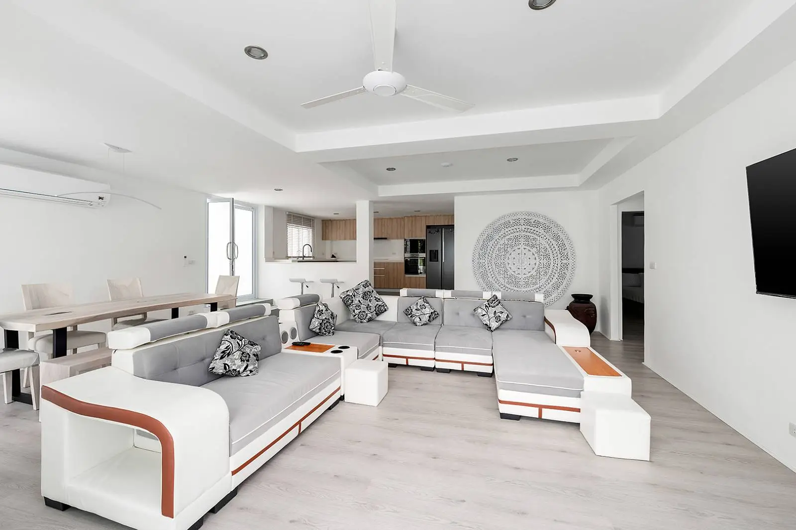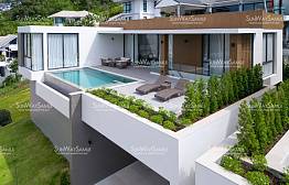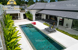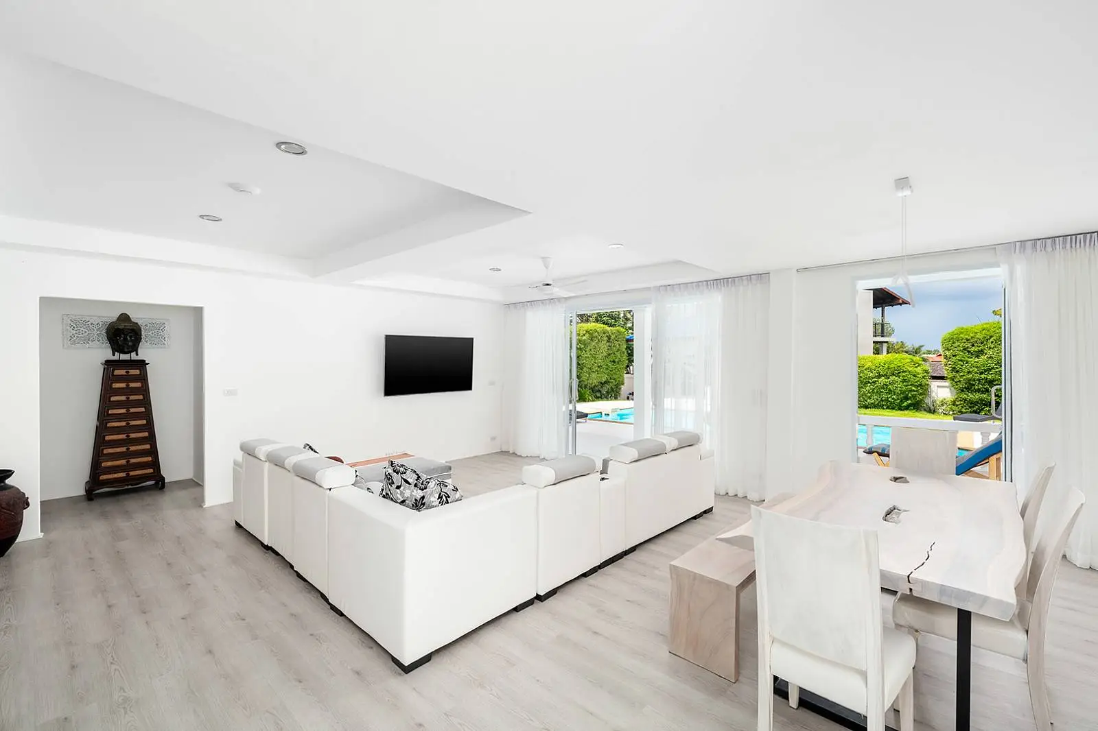 The bottom level offers another open-plan living, dining, and kitchen area that leads out to a covered terrace, overlooking the swimming pool and garden. This level includes 2 bedrooms, each with an ensuite bathroom.