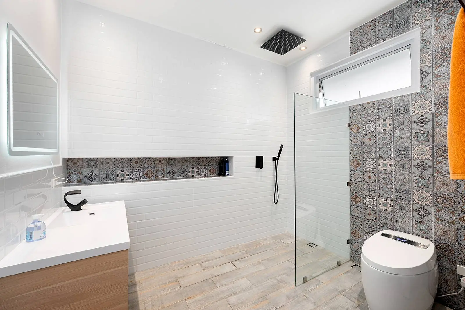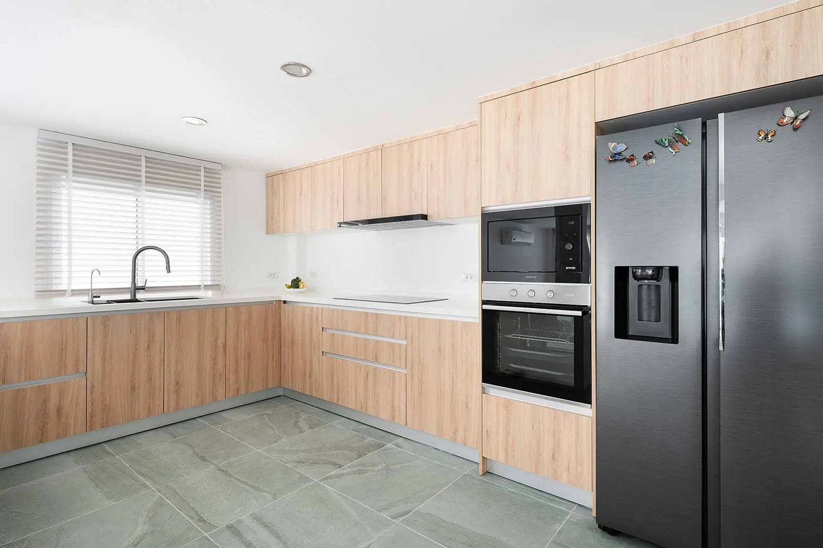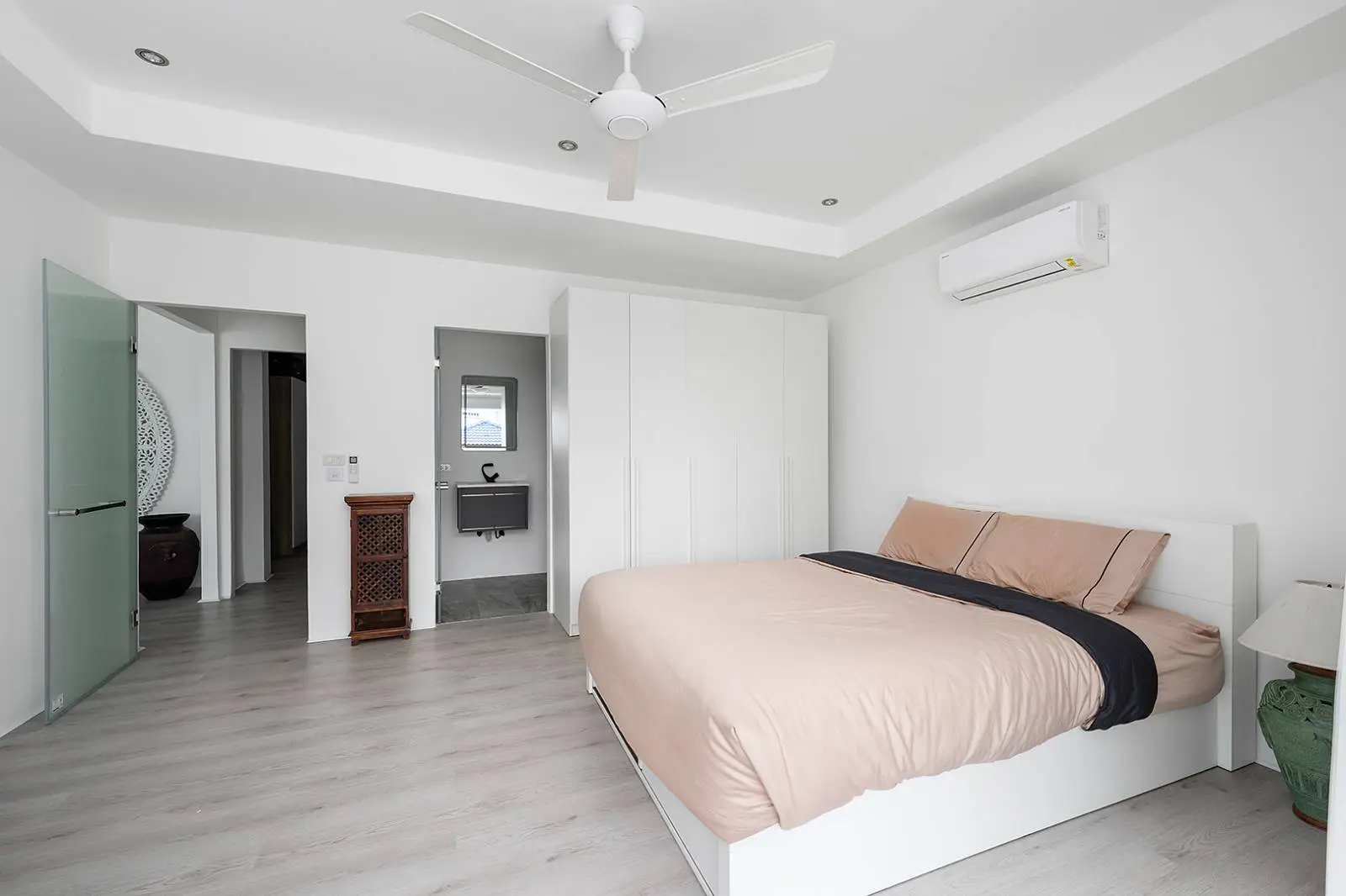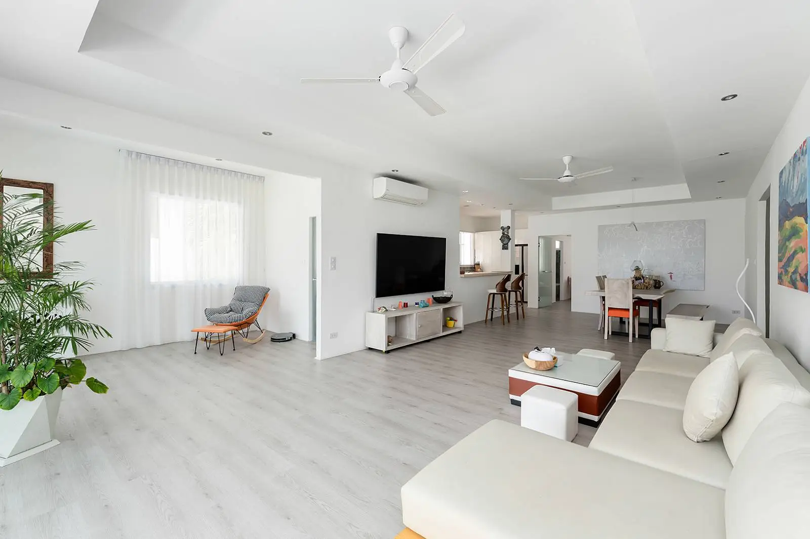 The bottom level offers another open-plan living, dining, and kitchen area that leads out to a covered terrace, overlooking the swimming pool and garden. This level includes 2 bedrooms, each with an ensuite bathroom.