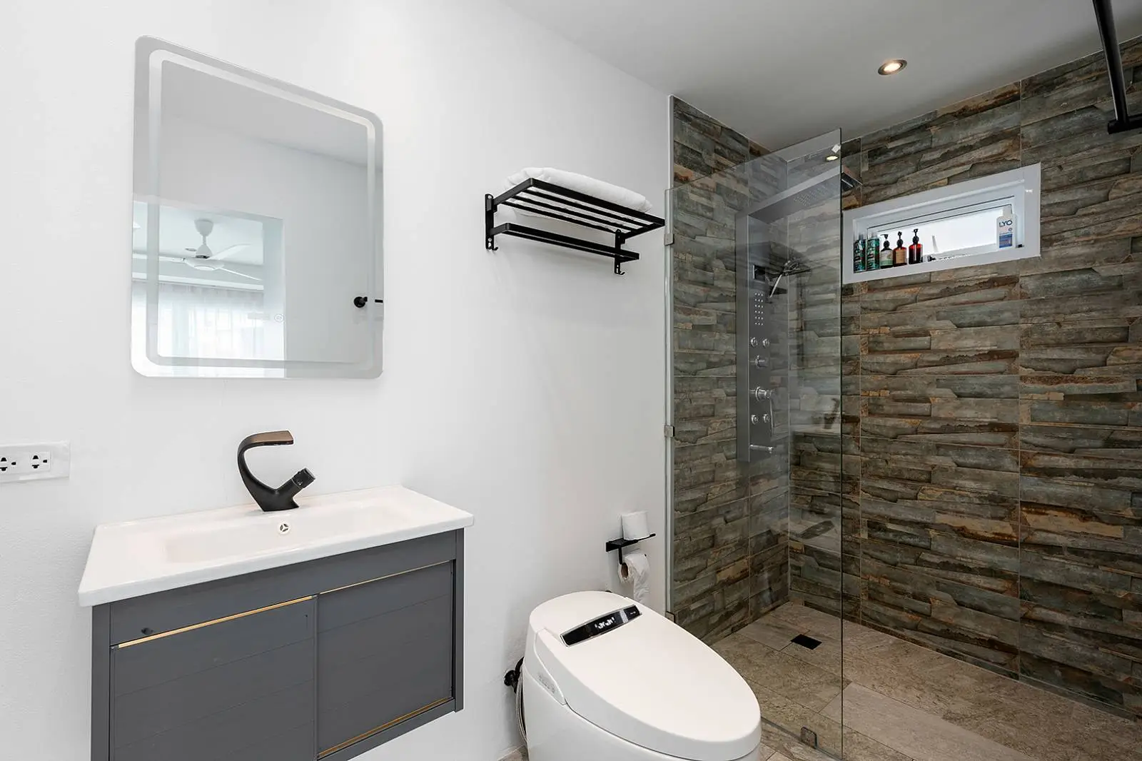 The top level features an exterior covered stairway that leads to the large balcony that connects to open-plan living, dining, and kitchen area, along with a small office space. This level includes 1 ensuite bedroom with a bathroom, and a master bedroom and kids' room that share a bathroom.