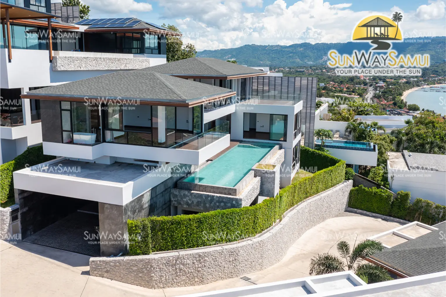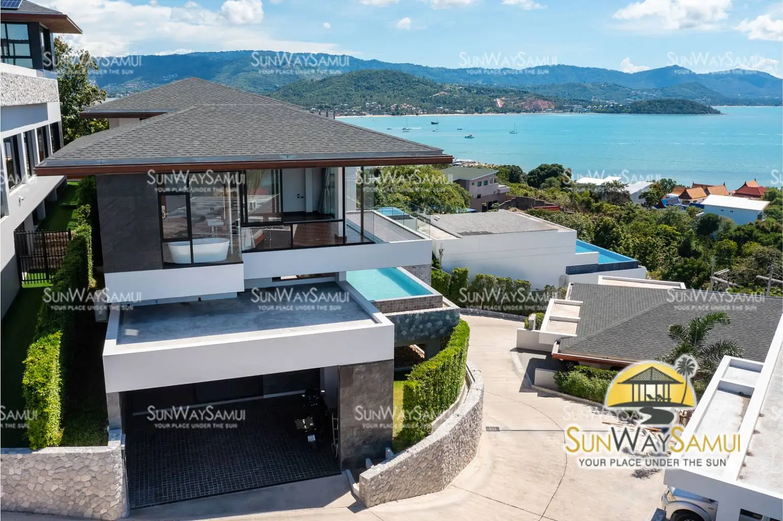 · Located in Big Buddha, Bangrak · Panoramic Seaview, 650m walk to Big Buddha/Plai Laem Beach · 4 x Seaview Bedrooms with ensuite bathroom + Guest Toilet · Open Plan Living, Dining and Kitchen Area · Rooftop Terrace connected to Master’s Bedroom · Laundry Room · Multipurpose Room · Covered Carpark for 2 Cars · 3 Storeys · Swimming Pool 15 x 4 meters · Land size 468 sqm · Build size 540 sqm · Communal Fees + Villa's Pool & Garden THB 8000 per month · Estate supply electricity · Estate supply water · Chanote title deed · Freehold Ownership