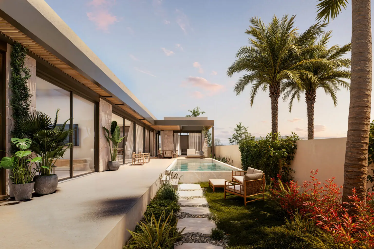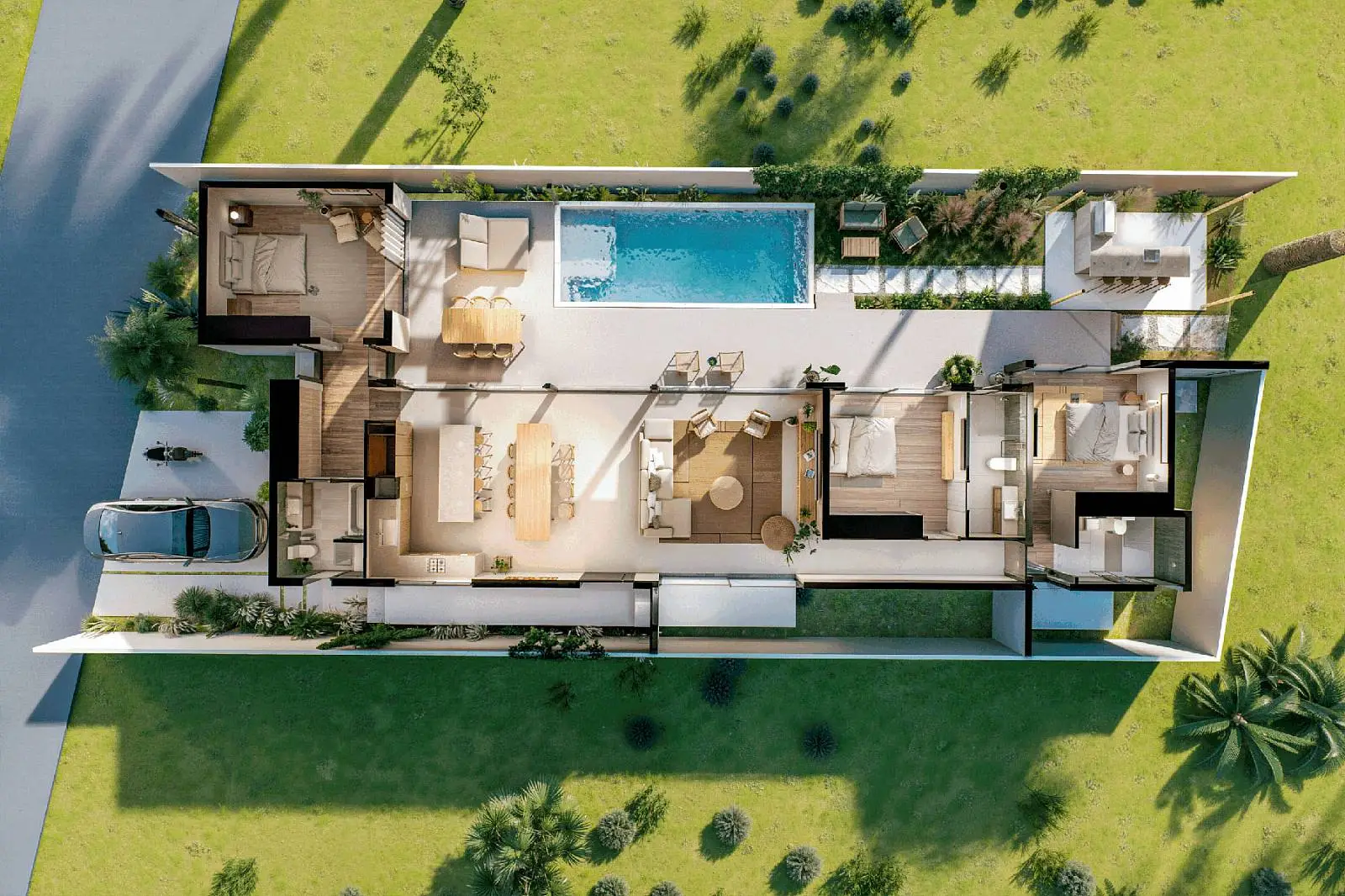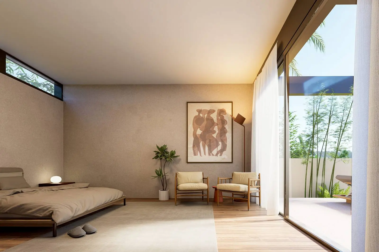 The villas feature three true master suites, each with en-suite bathrooms, alongside expansive living areas that open fully to a covered terrace and a 30 sqm infinity pool. High-quality materials such as natural stone, terrazzo, and micro cement are used throughout, creating a modern yet authentic tropical aesthetic.