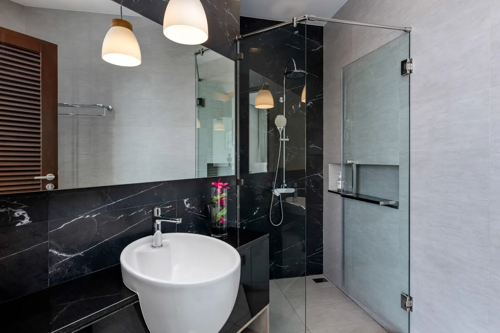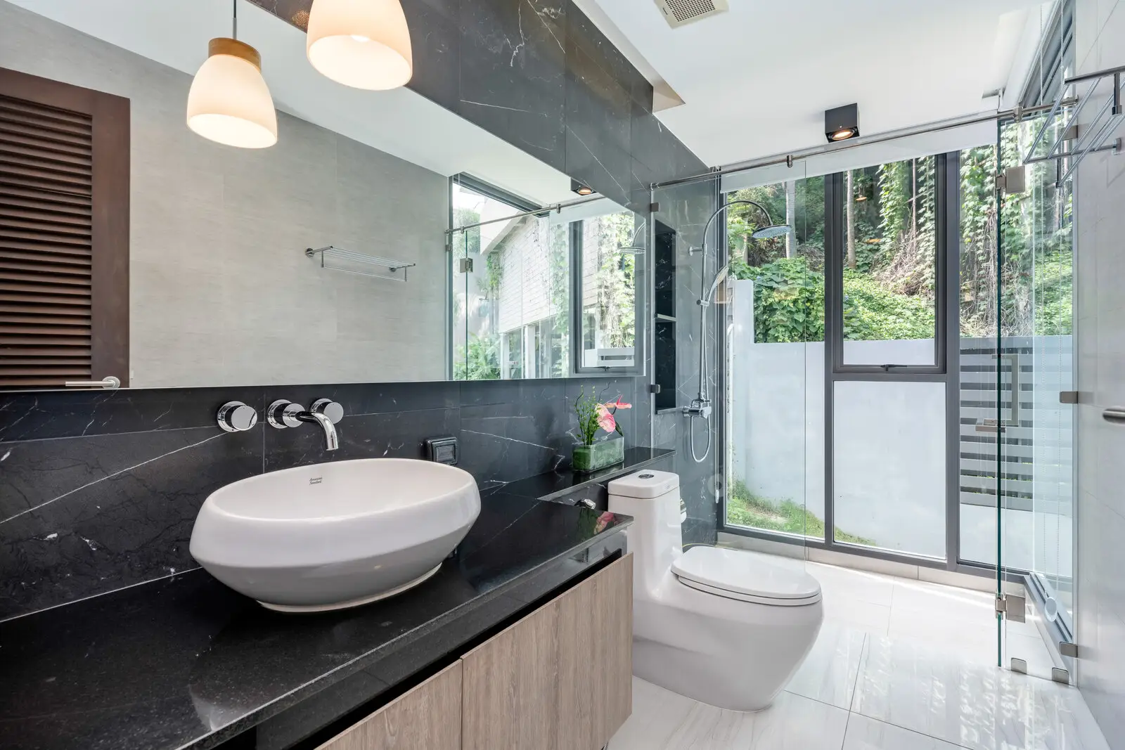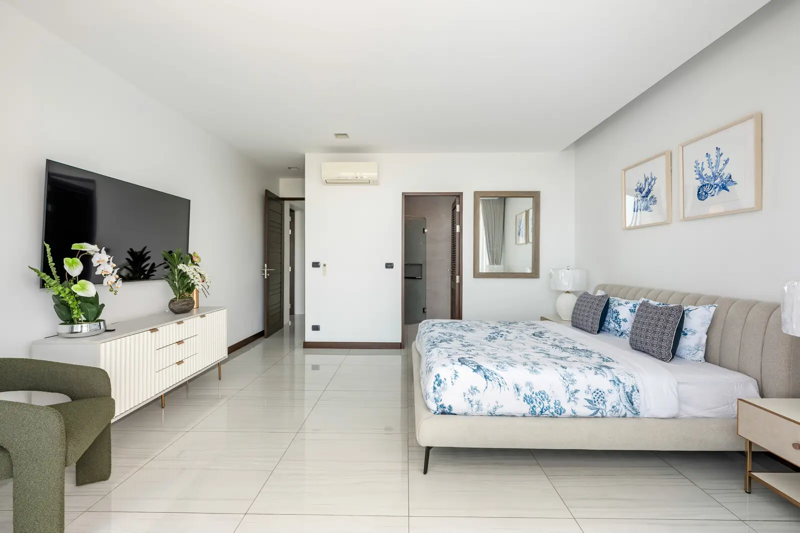 All five bedrooms are generously proportioned and privately positioned, each complemented by its own en-suite bathroom finished in natural stone with walk-in showers and bespoke cabinetry. All suites enjoy private balconies with elevated sea or hillside views, while guest rooms maintain a calm, resort-like atmosphere throughout.