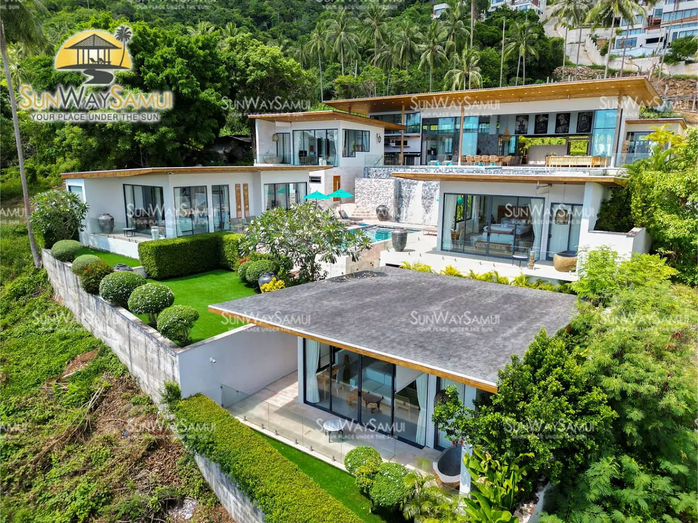 At the rear, there is a fully equipped staff kitchen and a staff bedroom. The top level also features spacious bedrooms with walk-in closets and ensuite bathrooms. As you descend to the middle level, you’ll discover another swimming pool with a cascading waterfall from the upper pool. This level includes four more bedrooms, each with walk-in closets and ensuite bathrooms surrounding the pool, as well as a flat garden area, perfect for relaxing outdoors. On the bottom level, a large bedroom with an ensuite bathroom offers additional privacy, making this villa an excellent choice for hosting large gatherings while ensuring personal comfort for all guests.