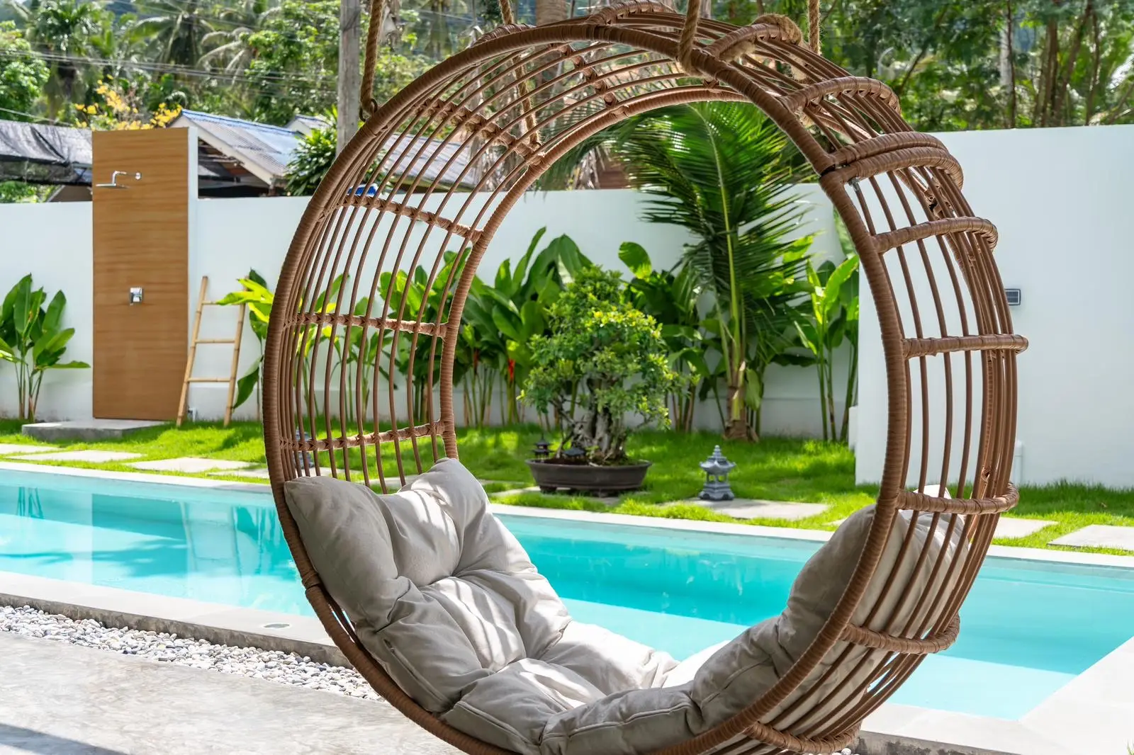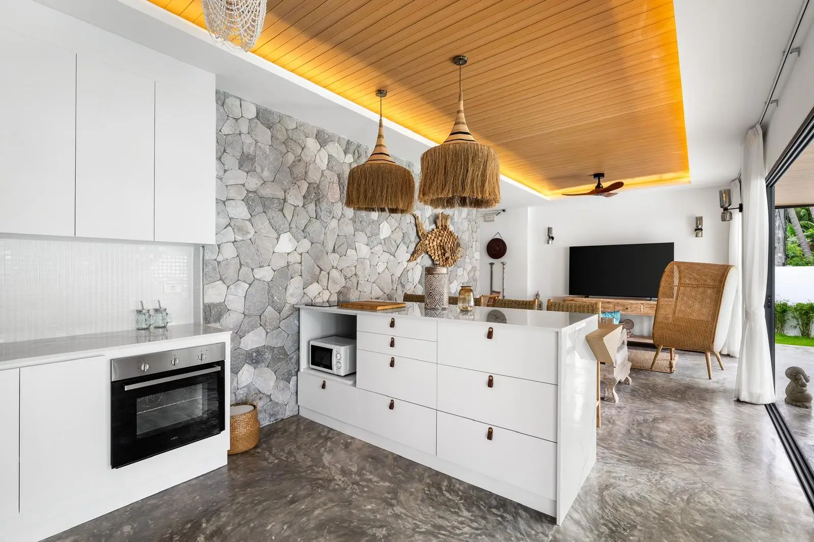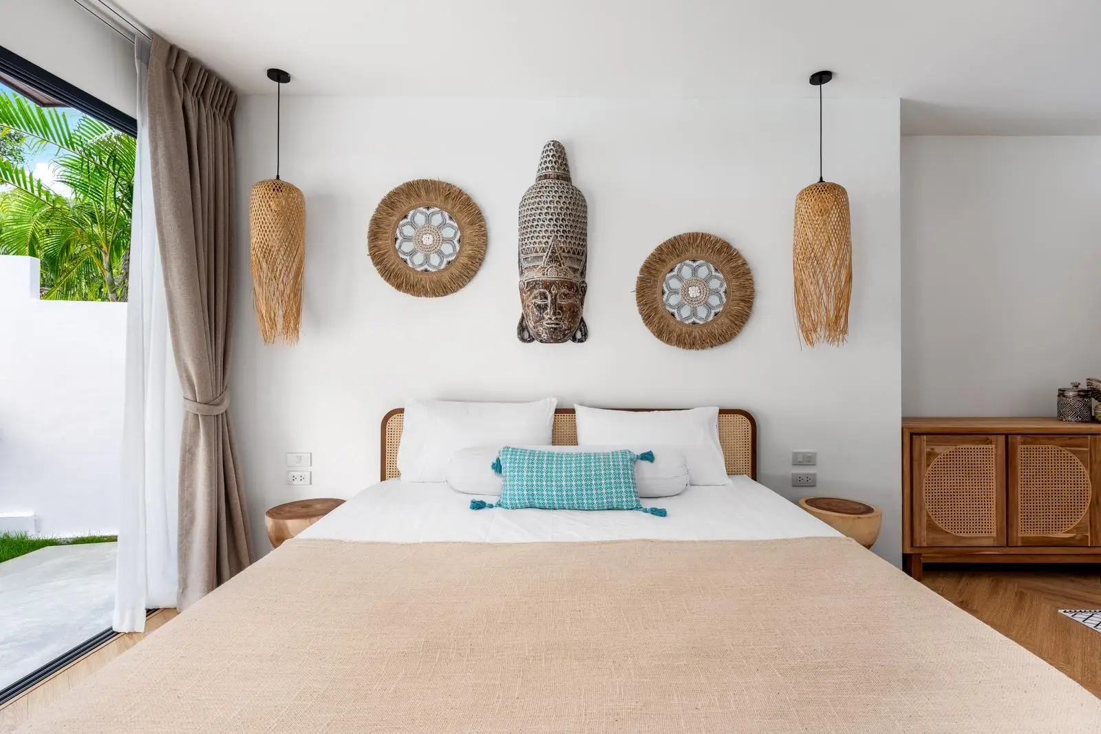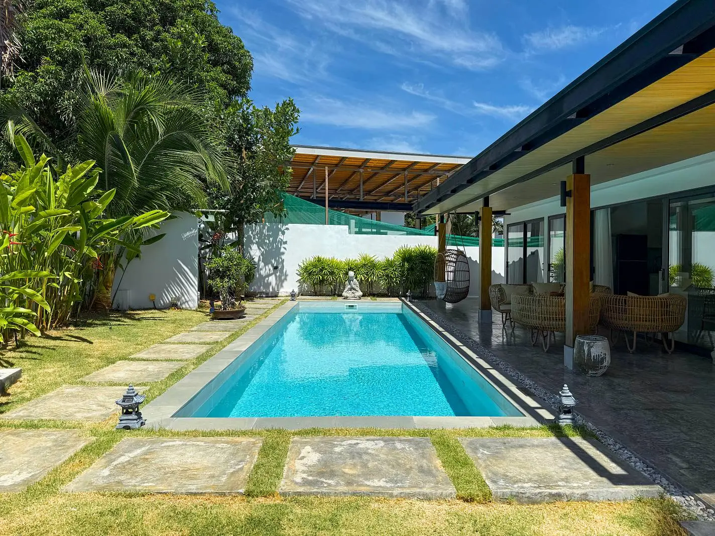 The master bedroom with ensuite bathroom is positioned behind the kitchen and enjoys a serene outlook over the rear garden, creating a quiet and private space. Additional features include a dedicated laundry area on the side of the house, stylish furnishings throughout, and a strong rental history that makes the villa attractive not only for lifestyle buyers but also as an income-generating investment.