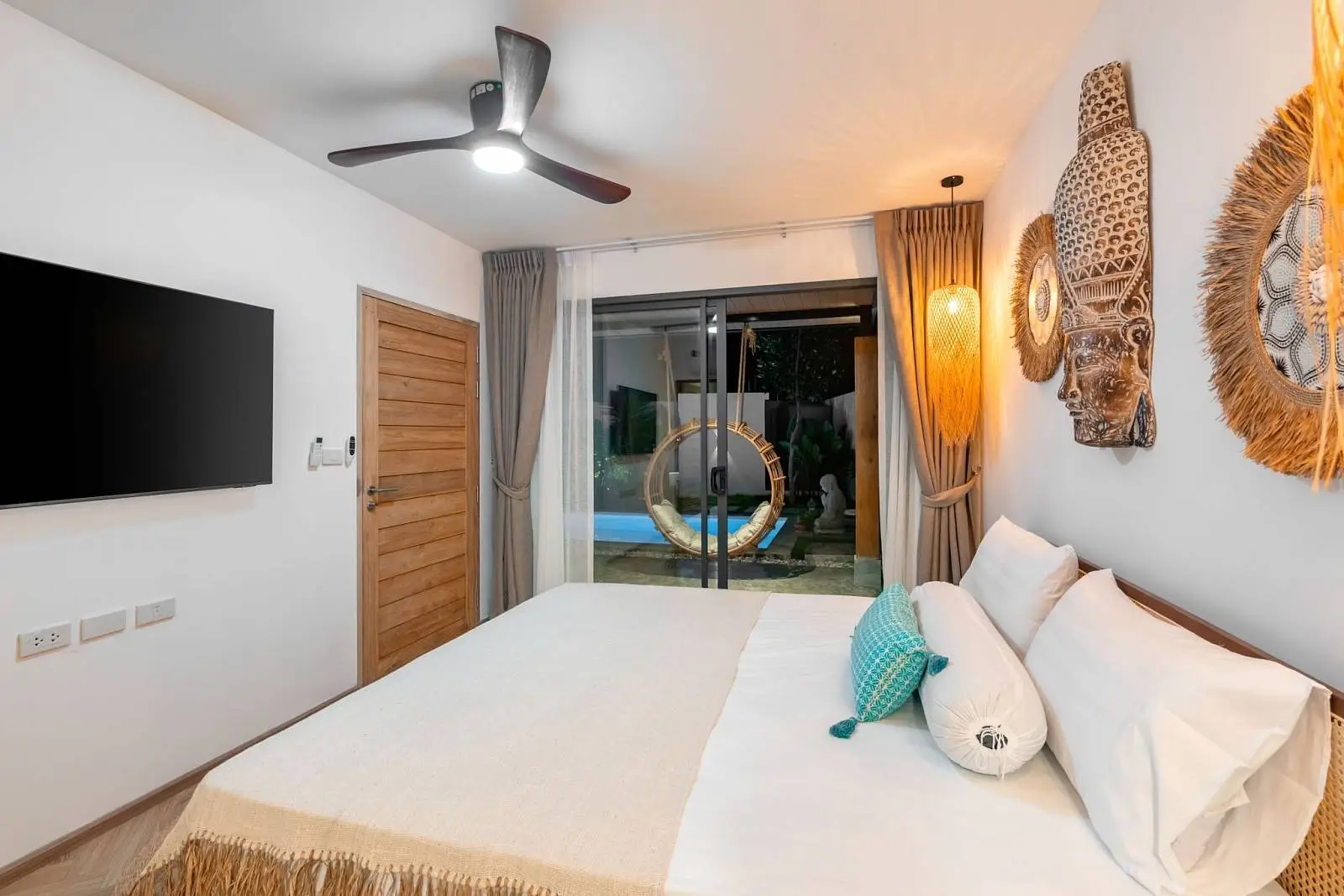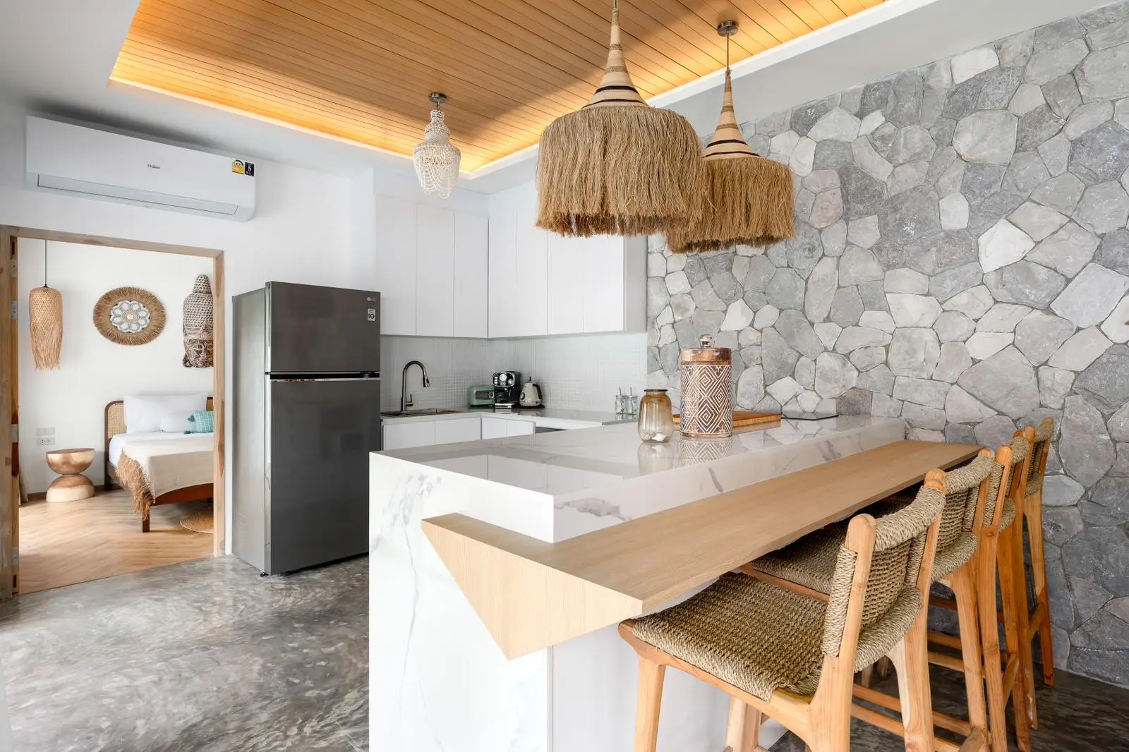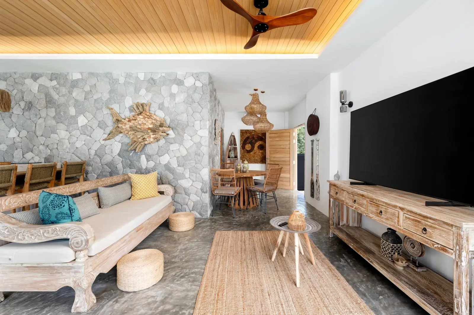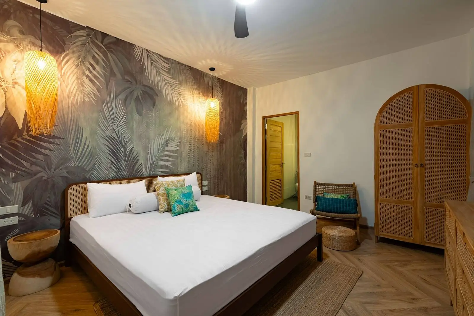 The master bedroom with ensuite bathroom is positioned behind the kitchen and enjoys a serene outlook over the rear garden, creating a quiet and private space. Additional features include a dedicated laundry area on the side of the house, stylish furnishings throughout, and a strong rental history that makes the villa attractive not only for lifestyle buyers but also as an income-generating investment.