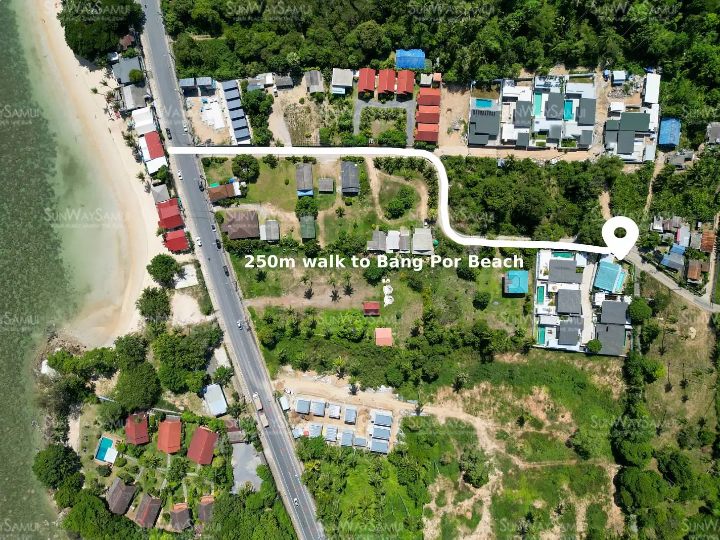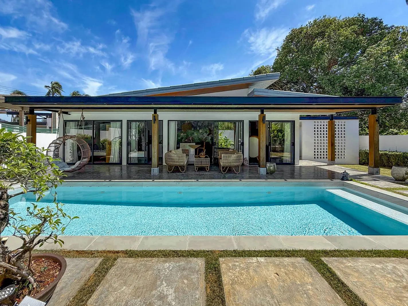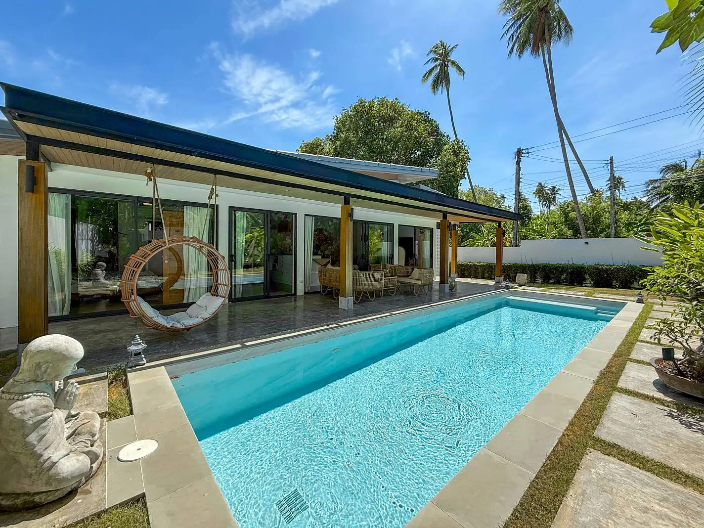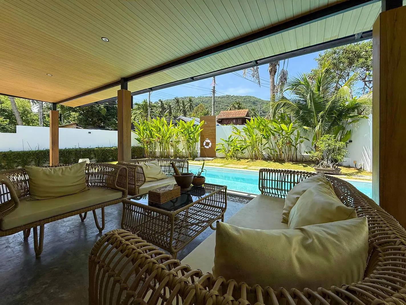 This beautifully renovated 2-bedroom garden pool villa offers beachside living within an established villa community in the charming Bang Por area. Just a 250-meter walk brings you to the beach and coastal road lined with local beachfront restaurants and cafés. The beach itself is sandy, swimmable year-round, and ideal for long scenic walks.