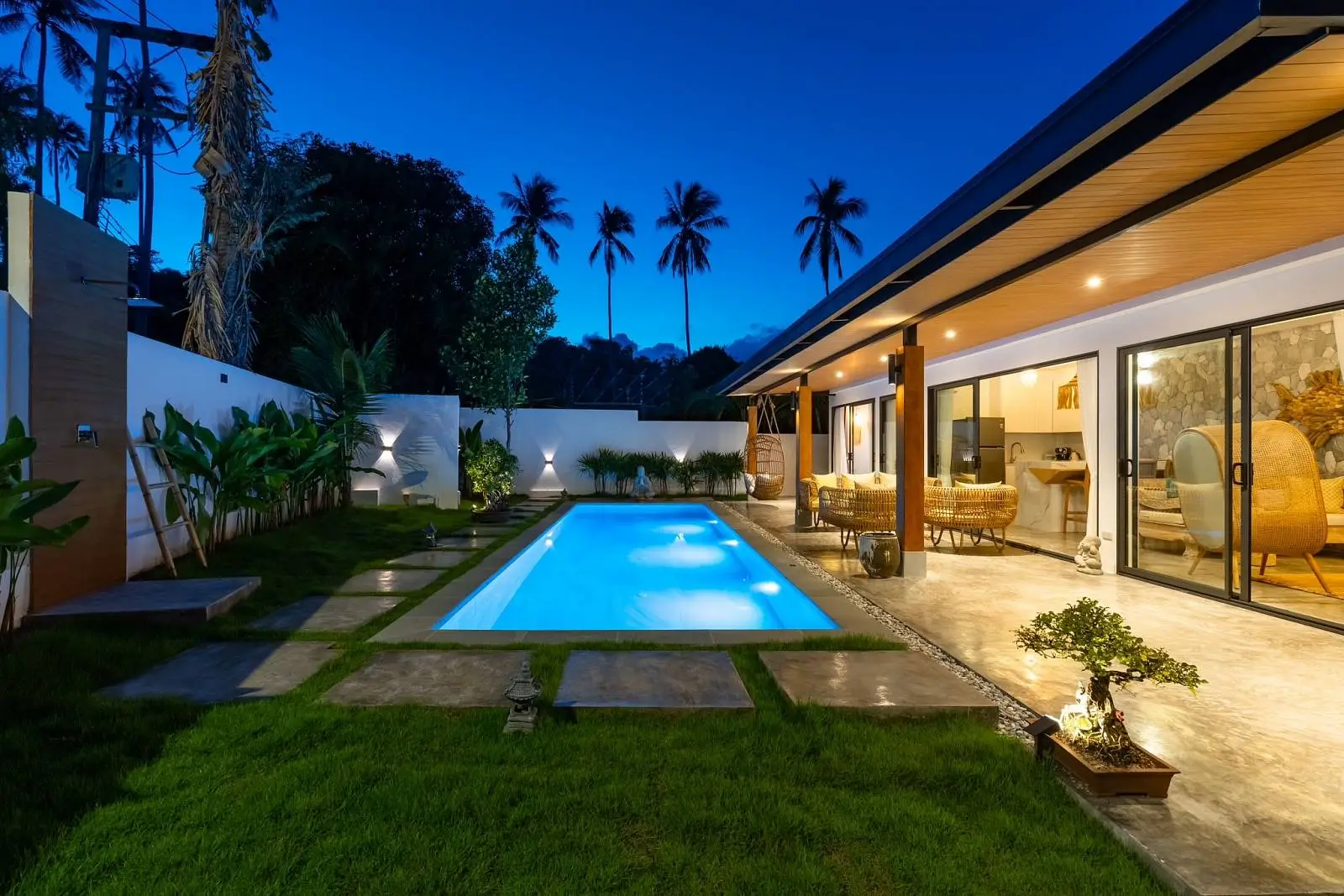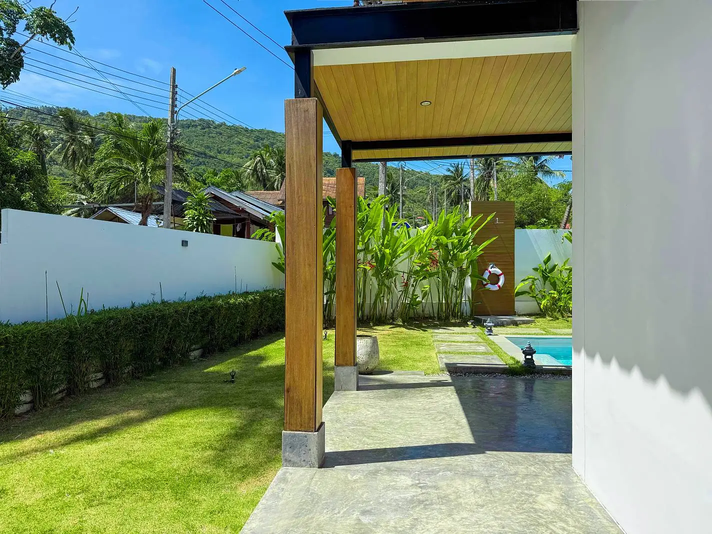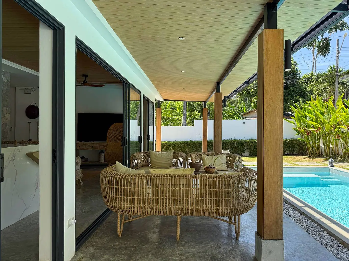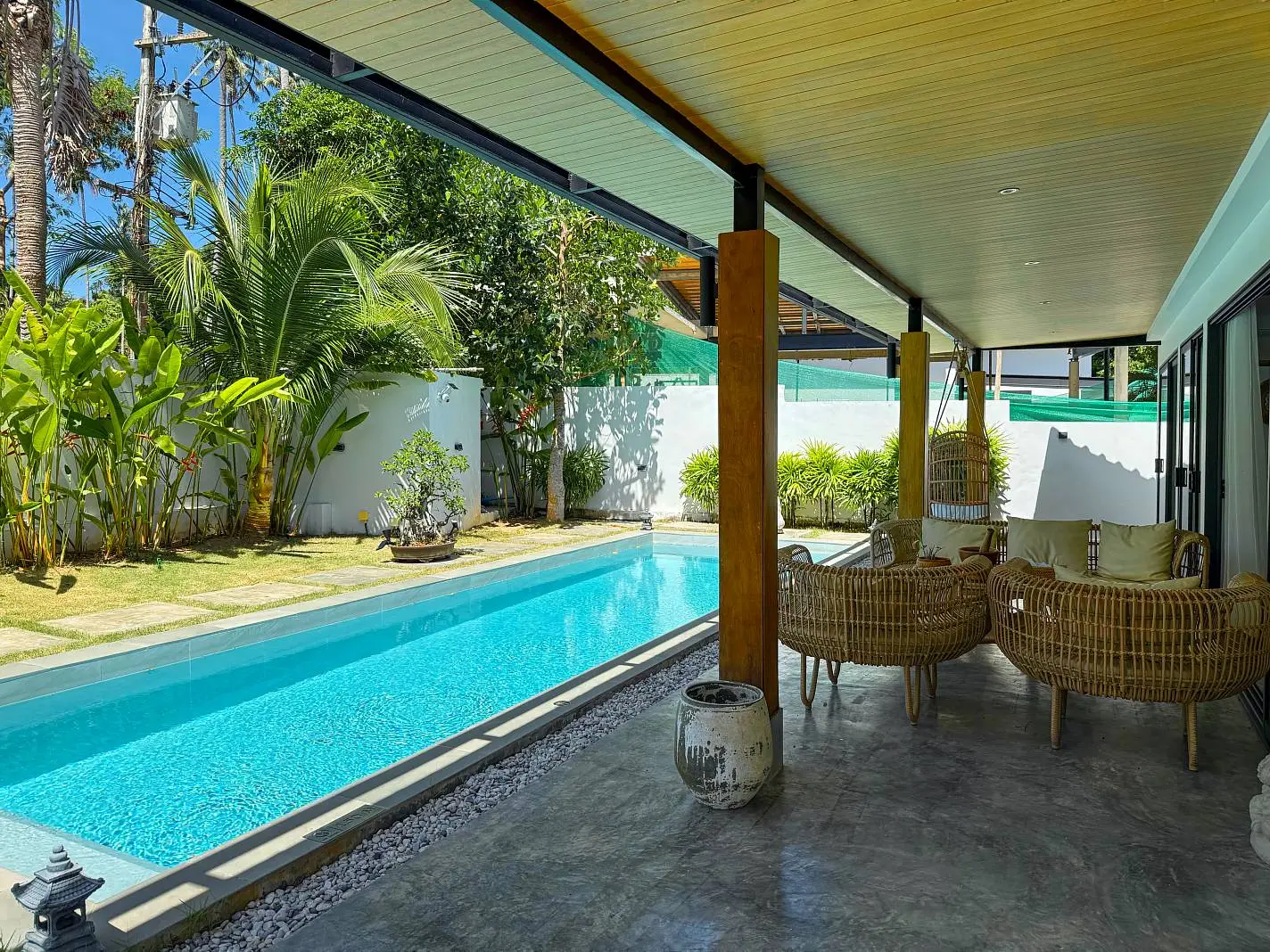 This beautifully renovated 2-bedroom garden pool villa offers beachside living within an established villa community in the charming Bang Por area. Just a 250-meter walk brings you to the beach and coastal road lined with local beachfront restaurants and cafés. The beach itself is sandy, swimmable year-round, and ideal for long scenic walks.