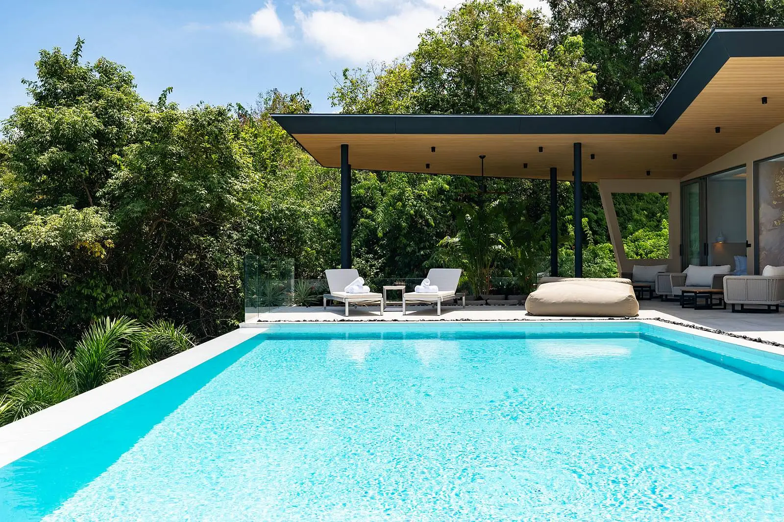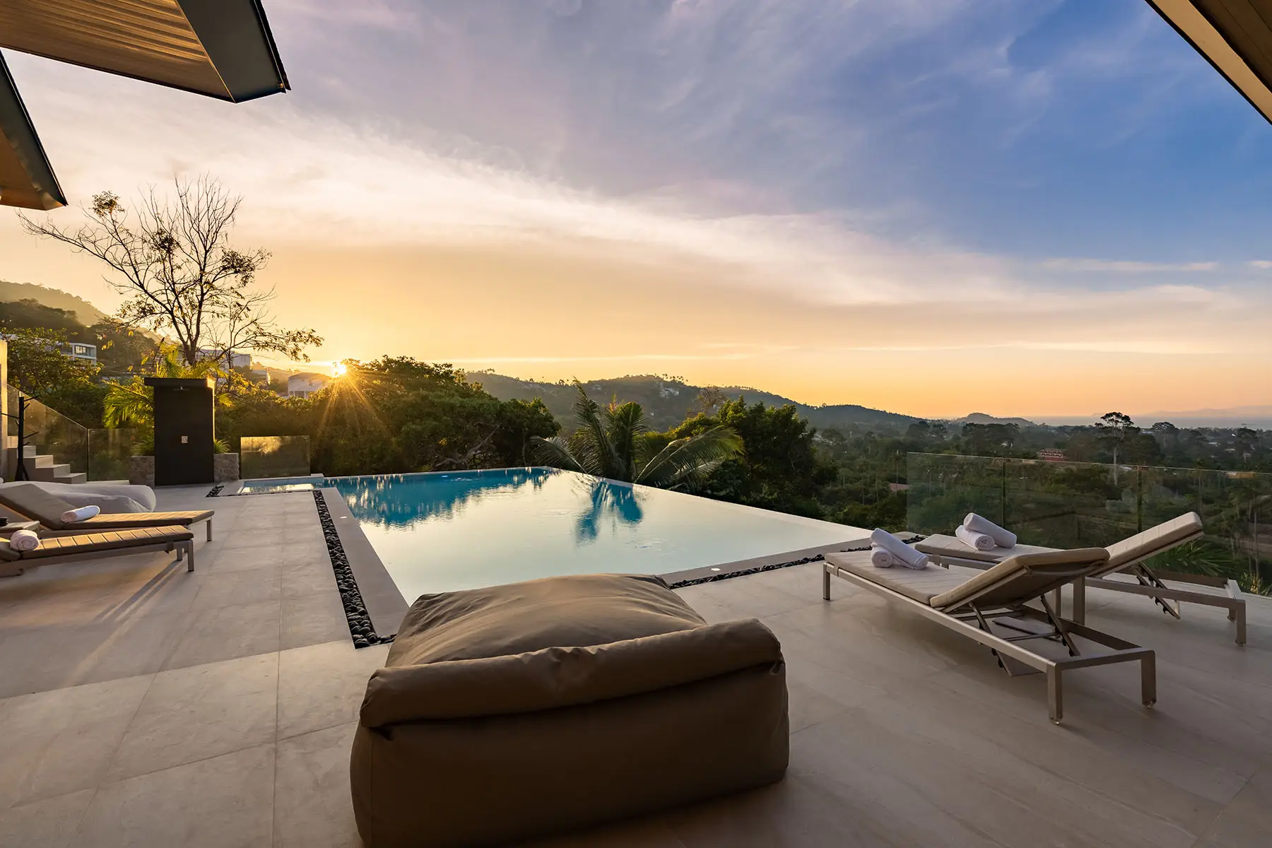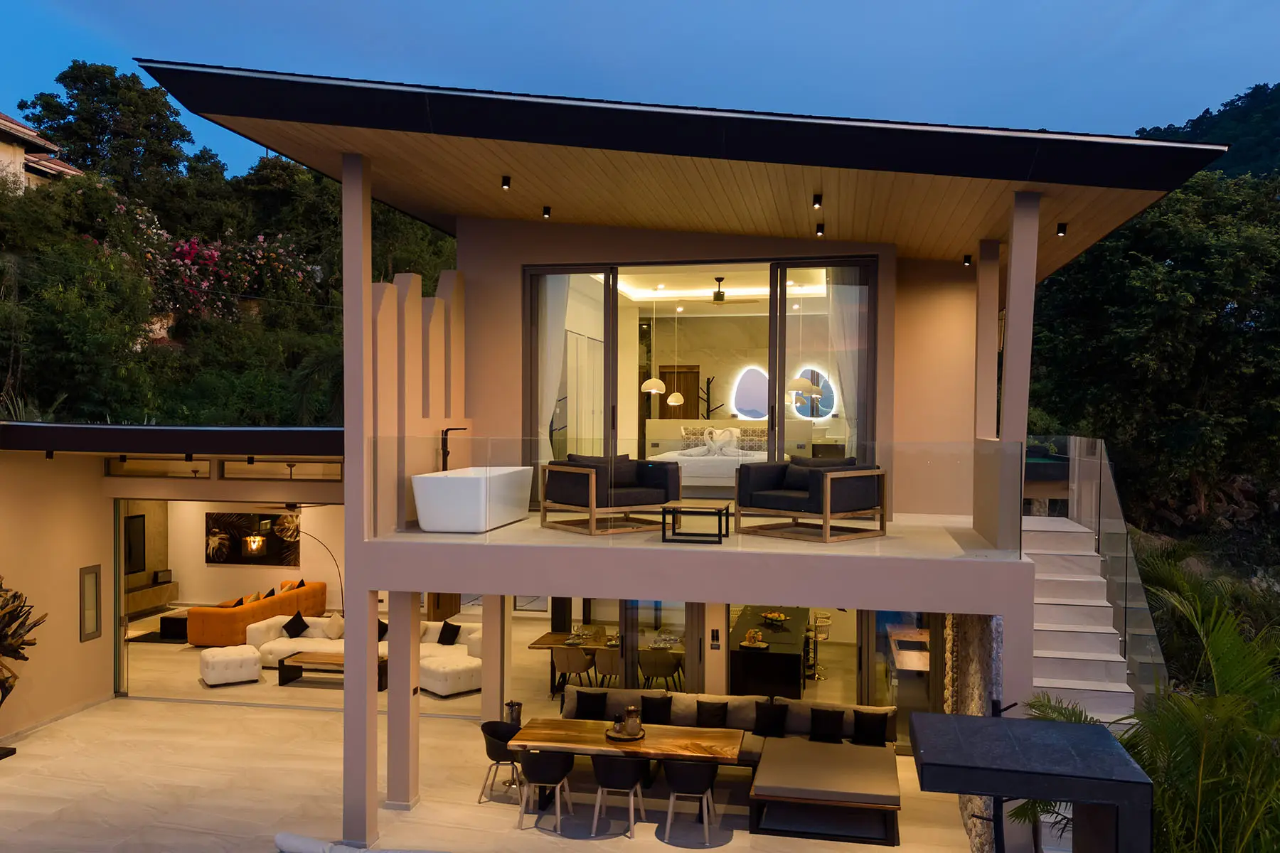 Outside, the pool terrace boasts a magnificent 12-meter infinity swimming pool and a sunken sala with outdoor seating—a perfect retreat for relaxation and entertainment. For ultimate privacy, the master bedroom occupies the floor above, complete with a private balcony and bathtub.