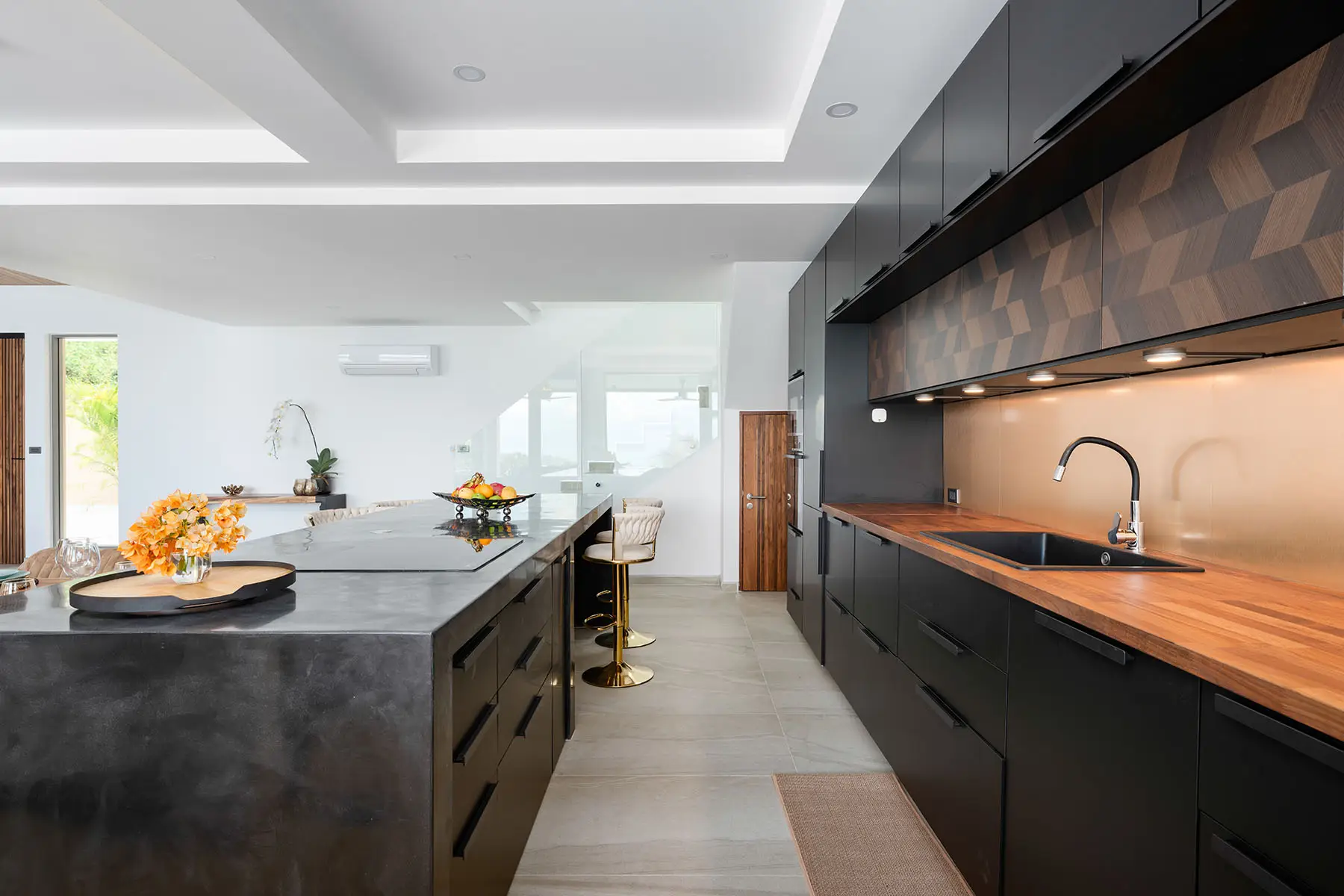 Step inside to discover a spacious open-plan layout, with a living room overlooking the expansive ocean vista and adjoining outdoor terrace. To the right, a cozy TV area beckons, while the left reveals a modern western kitchen with an island and indoor dining area, seamlessly connected to the outdoor dining area on the pool terrace. This floor also features three guest bedrooms, each with an ensuite bathroom. Two of the bedrooms offer captivating seaviews, while the third provides a unique garden view with an outdoor shower in the adjacent pebble garden.