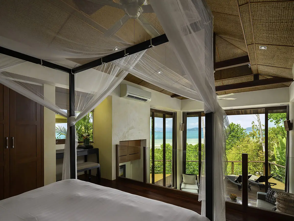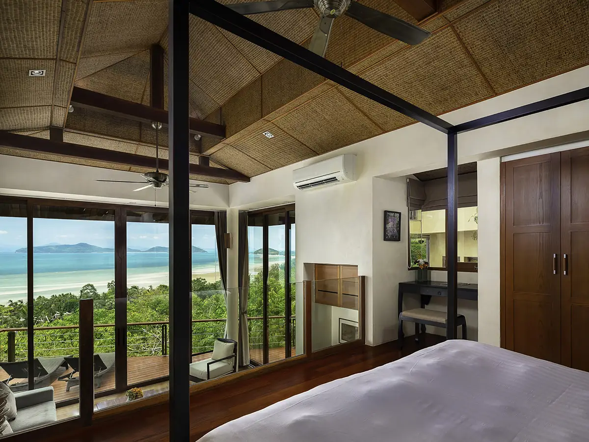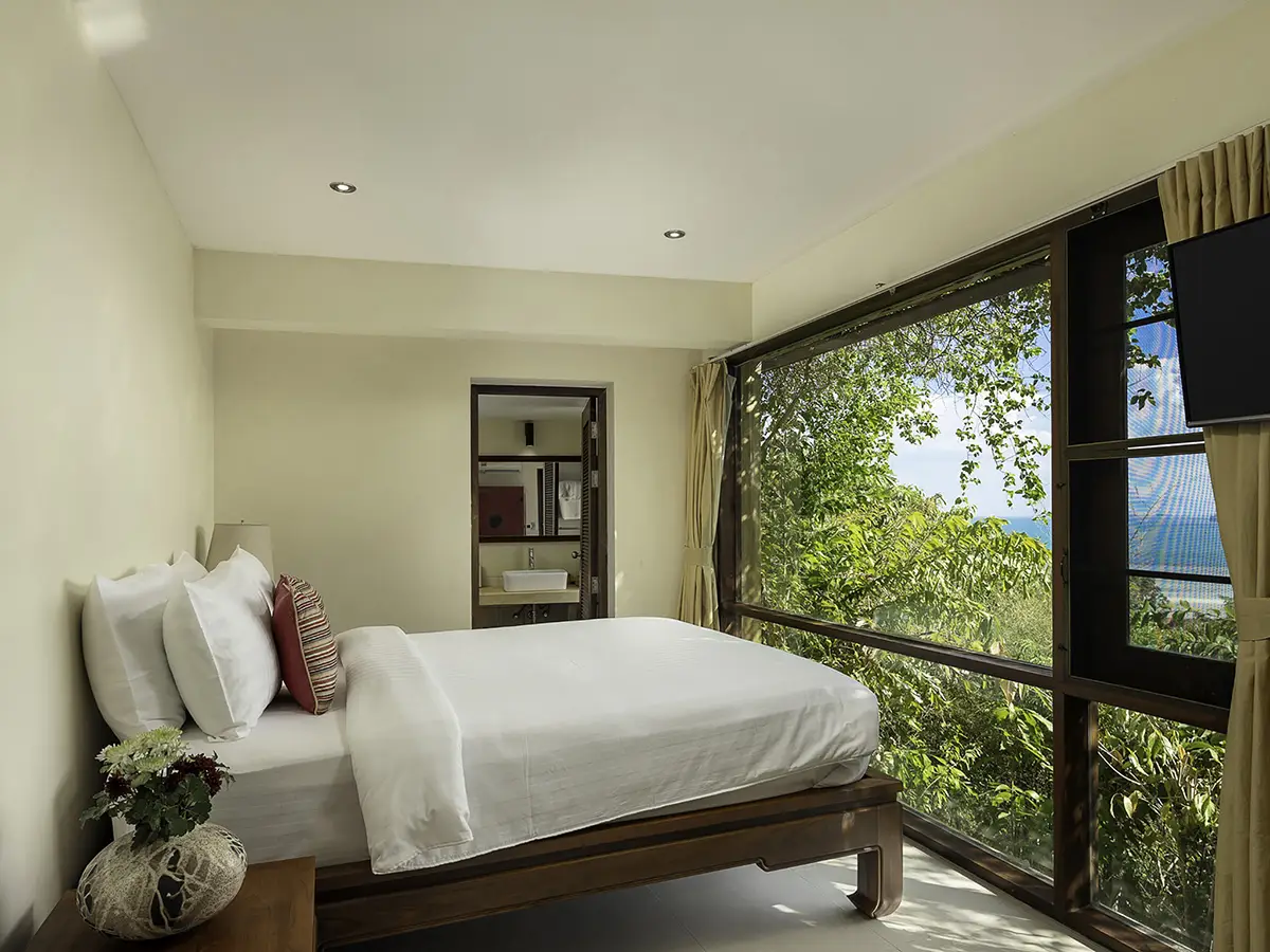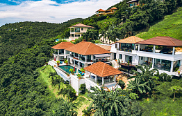 The property consists of 1 main building with 2 separate buildings on each side. In the center stands a two-story building with two twin bedrooms on the ground floor alongside the infinity pool, sun terrace and outside dining and barbecue area. Above this is an open-plan, informal living area with kitchen, comfortable dining and lounge areas with full length glass doors leading out to a covered terrace with a huge dining table seating 12 and even more fabulous ocean views. On each side of this main building is a master bedroom pavilion set among the landscaped tropical gardens. Below the pool level lies the fifth bedroom.