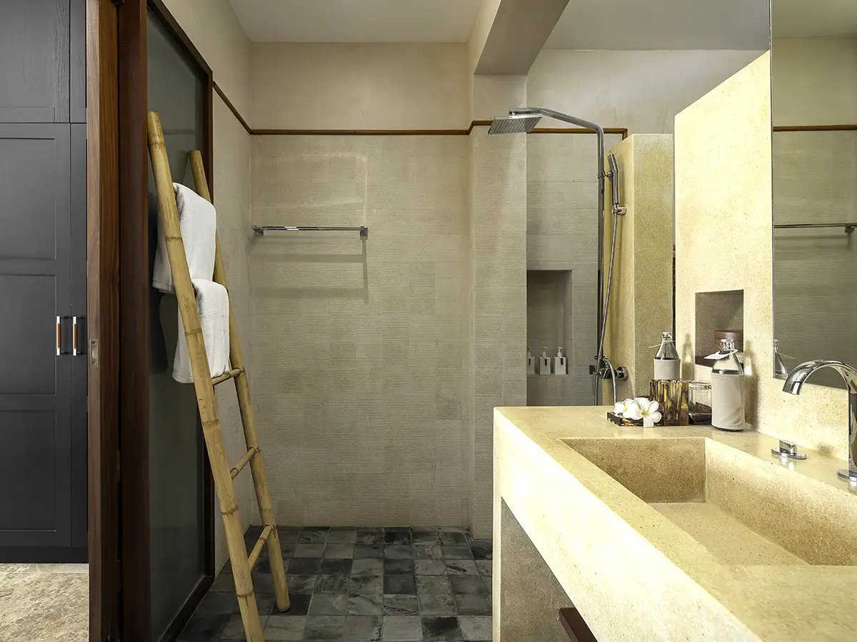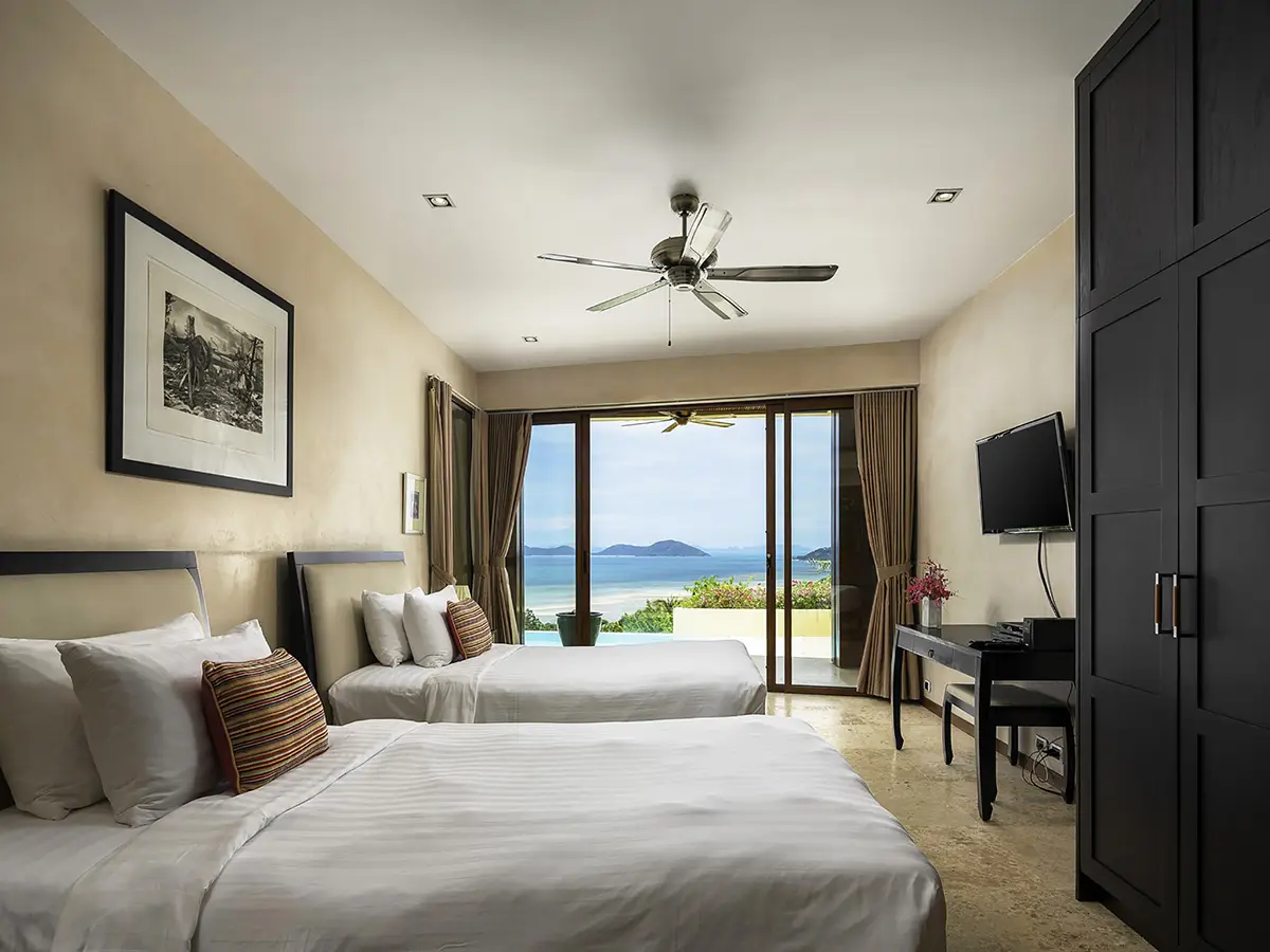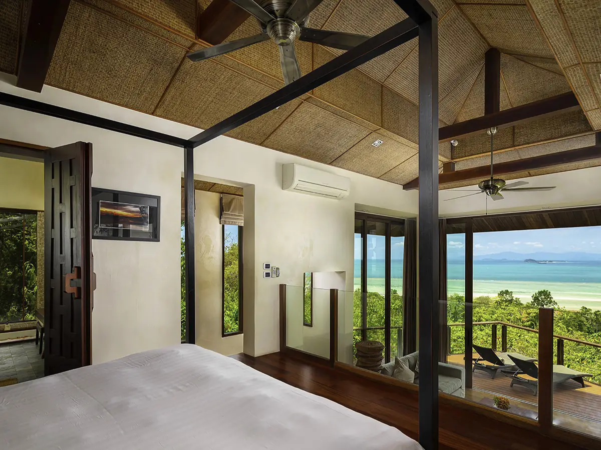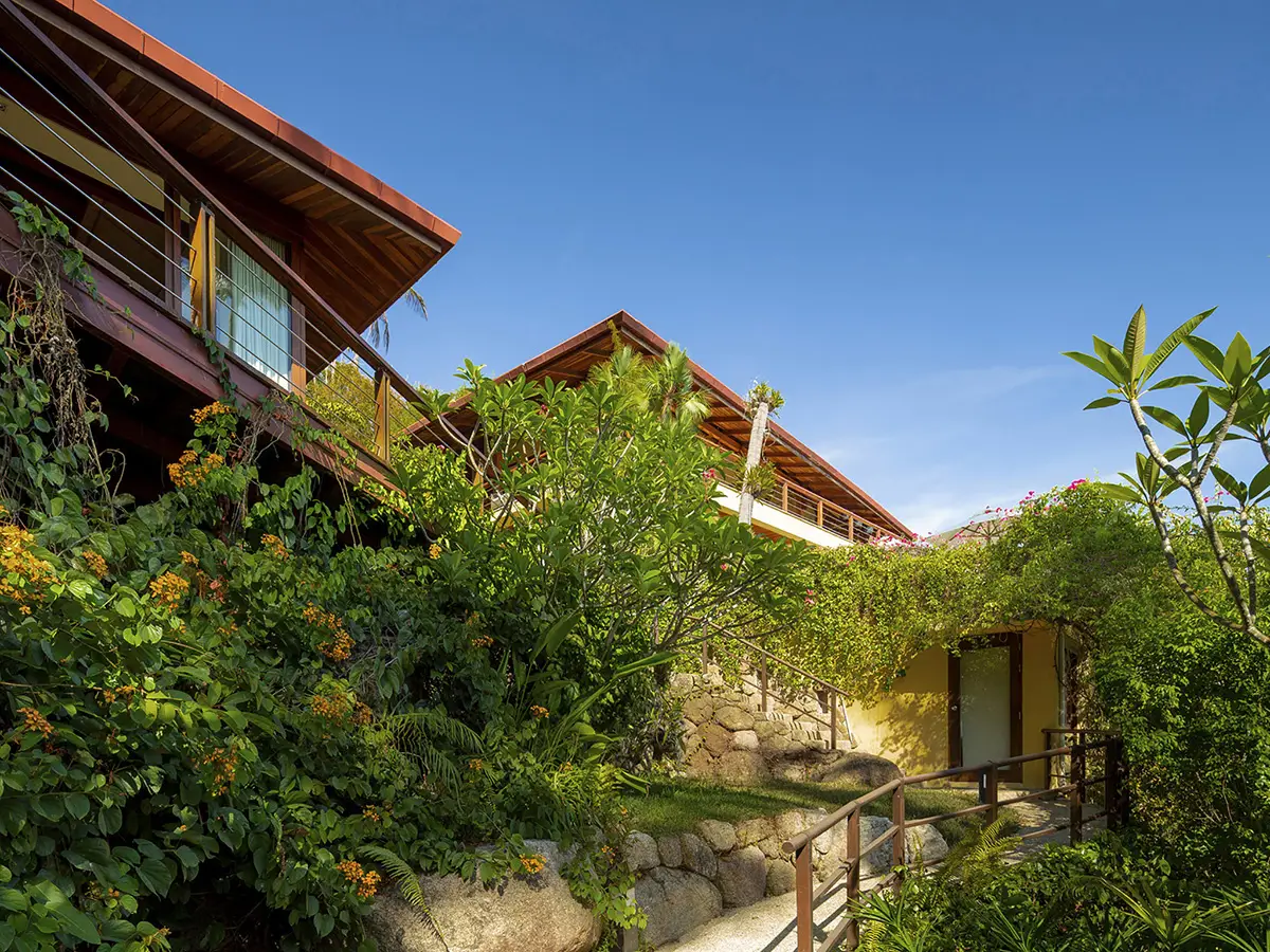 The property consists of 1 main building with 2 separate buildings on each side. In the center stands a two-story building with two twin bedrooms on the ground floor alongside the infinity pool, sun terrace and outside dining and barbecue area. Above this is an open-plan, informal living area with kitchen, comfortable dining and lounge areas with full length glass doors leading out to a covered terrace with a huge dining table seating 12 and even more fabulous ocean views. On each side of this main building is a master bedroom pavilion set among the landscaped tropical gardens. Below the pool level lies the fifth bedroom.
